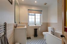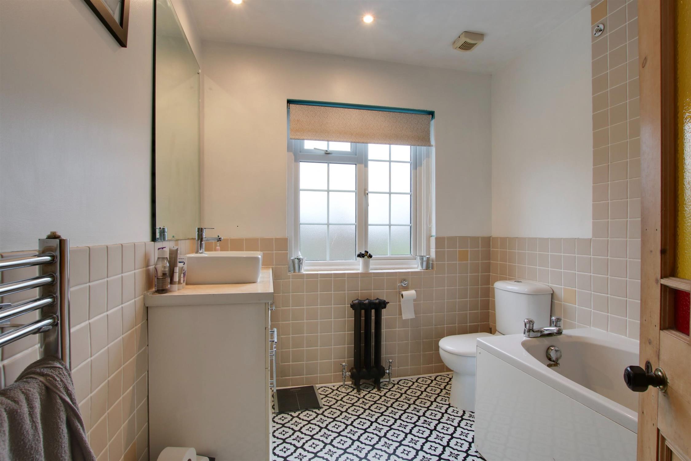 Double glazed obscure window to the rear aspect. Smooth ceiling with inset spotlighting and extractor fan. Suite comprising; bath with shower over, wash hand basin with cupboards beneath and low level WC. Part tiled walls. Vintage style radiator. Heated towel rail.