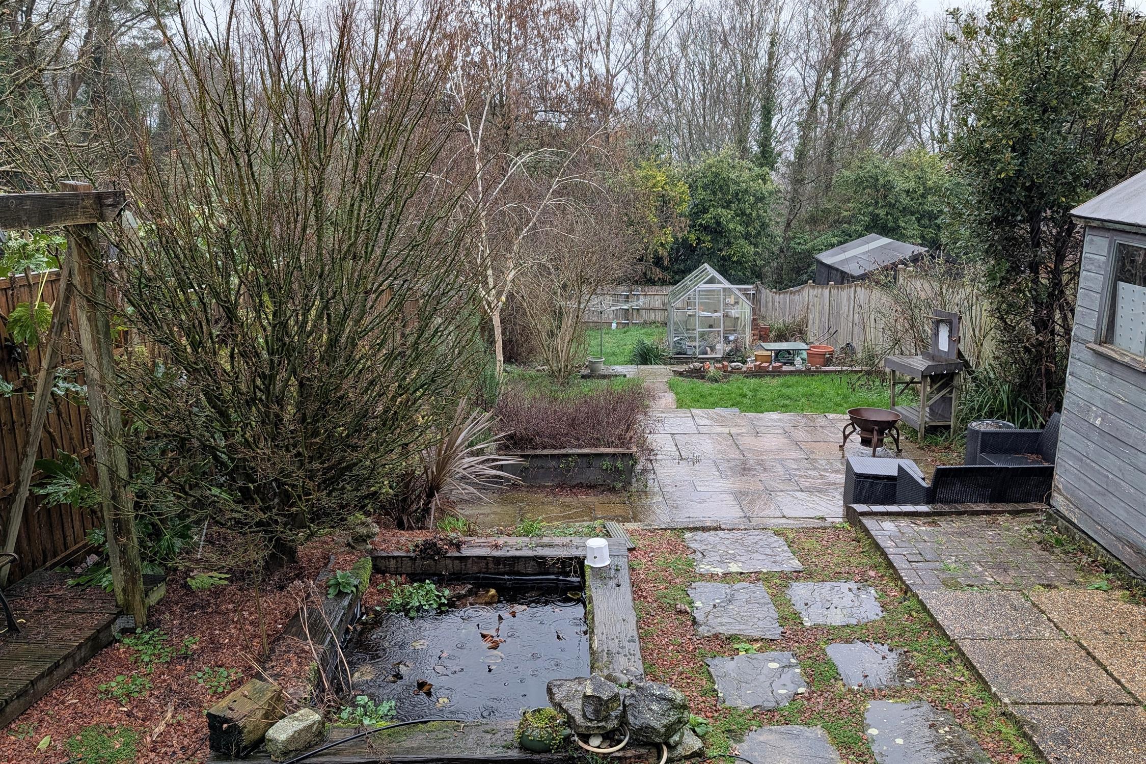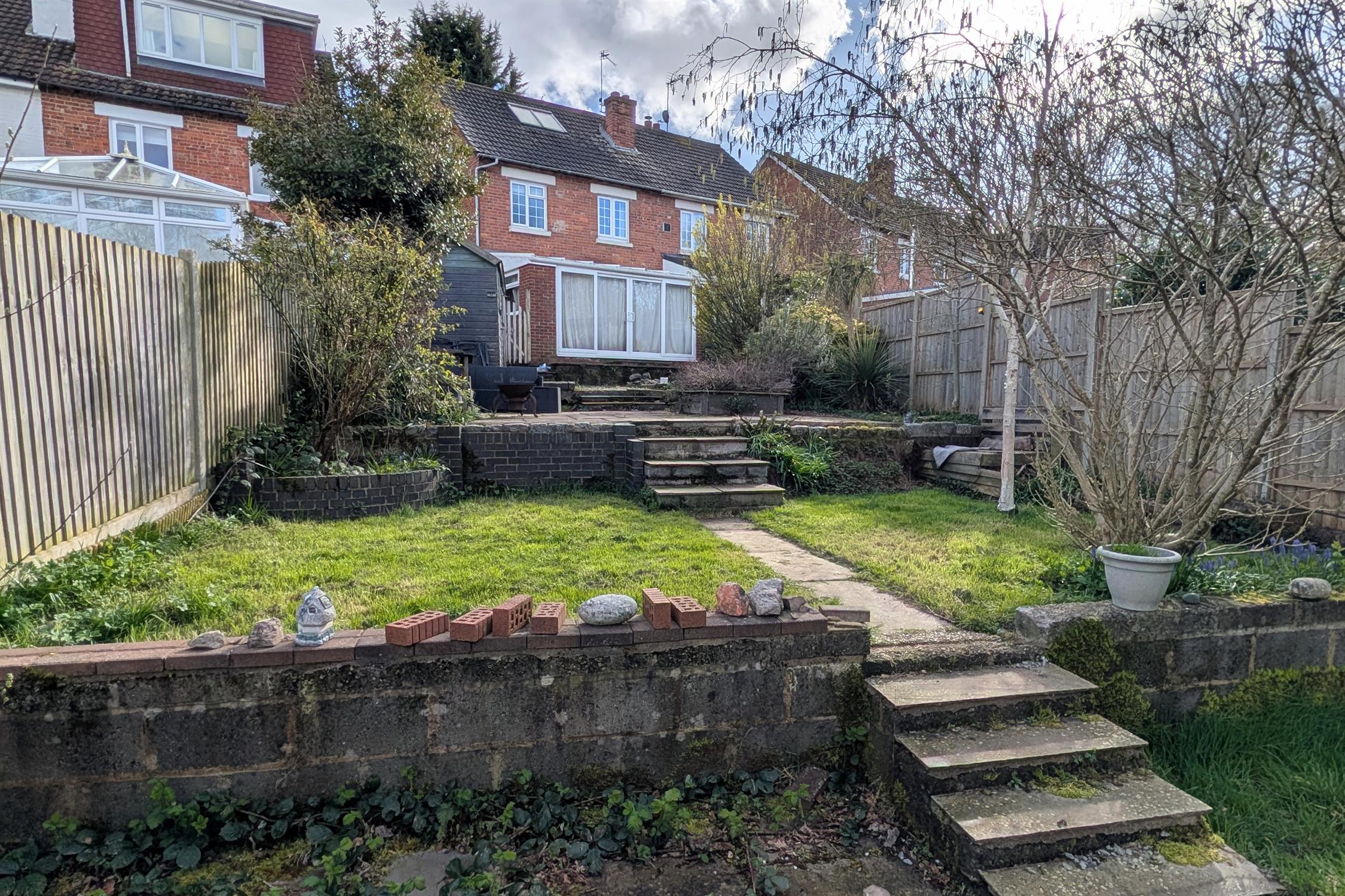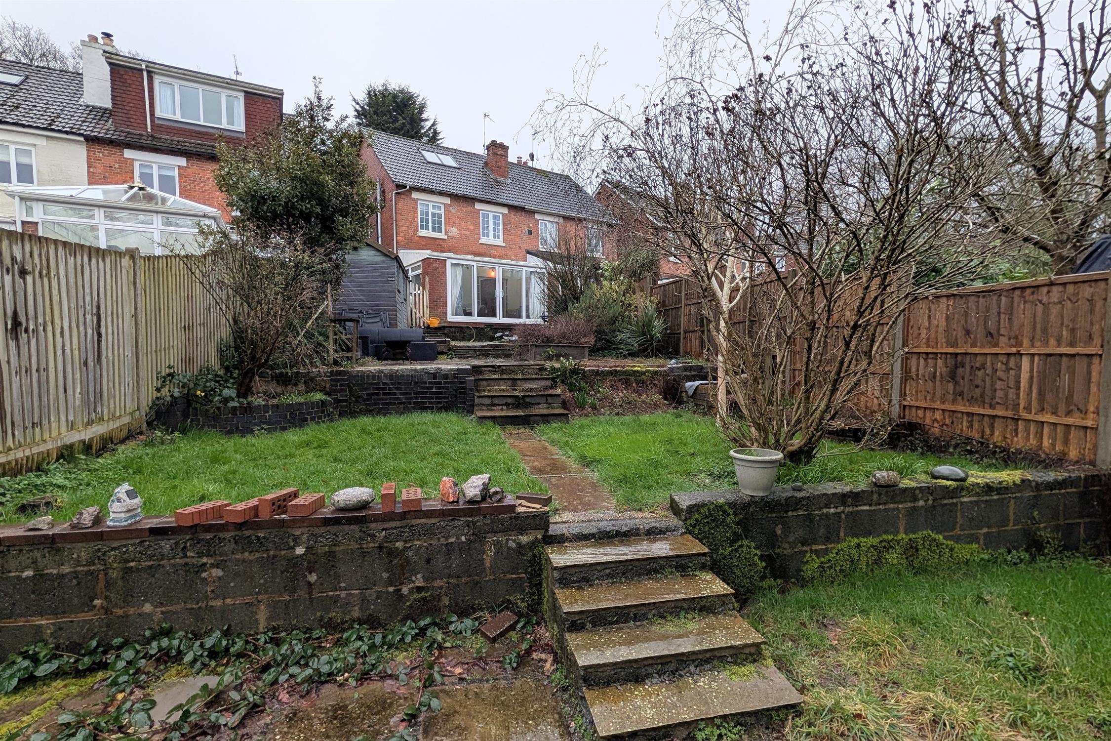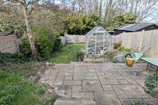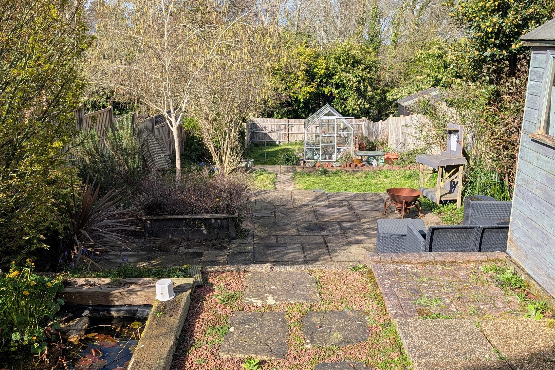The sizeable tiered rear garden has an initial seating area with a pergola. Timber shed. Steps down to another seating area with slate chippings. Mature shrubs and borders. Steps down to a laid to lawn area, two timber sheds and greenhouse. Gated rear pedestrian access.