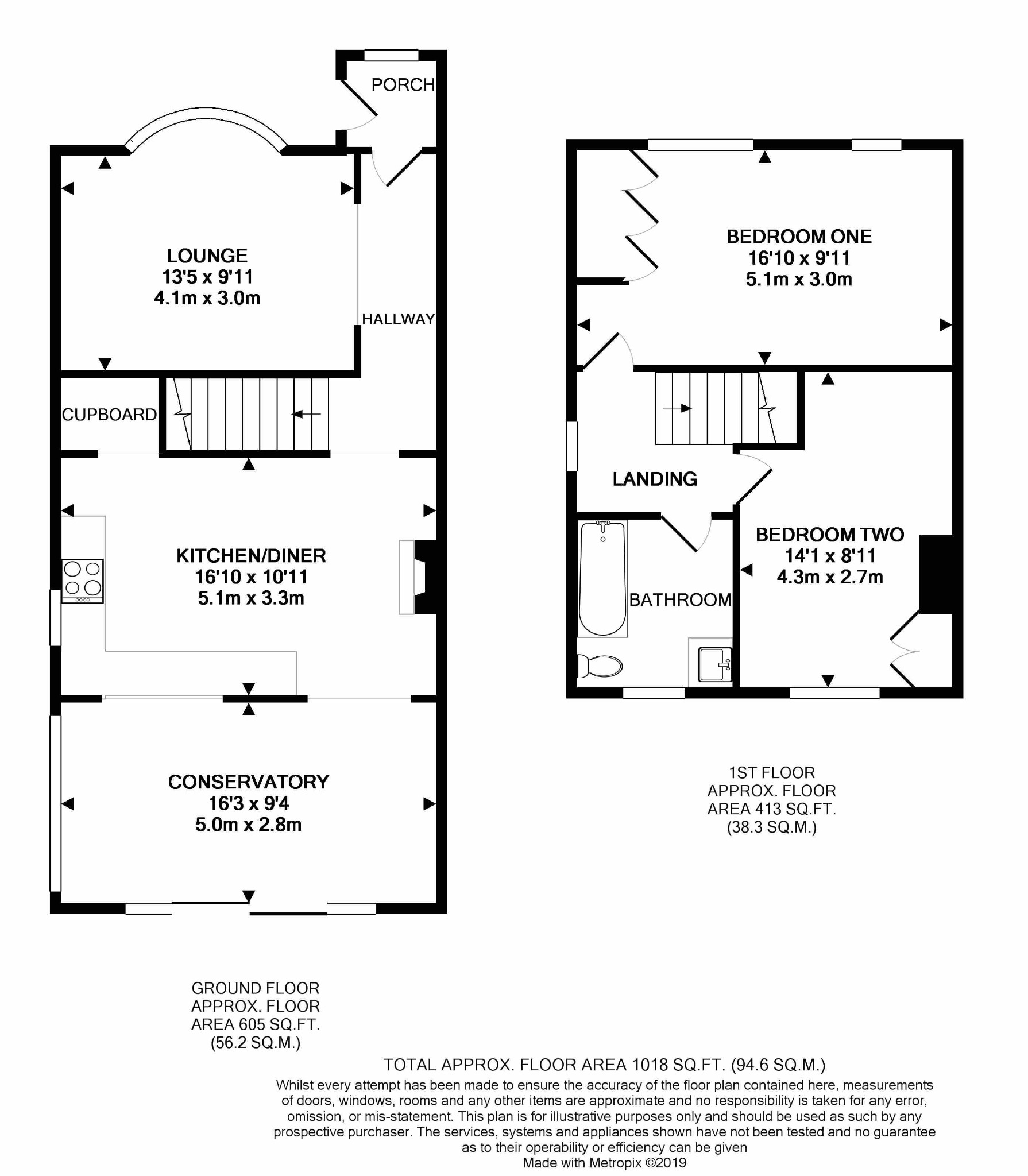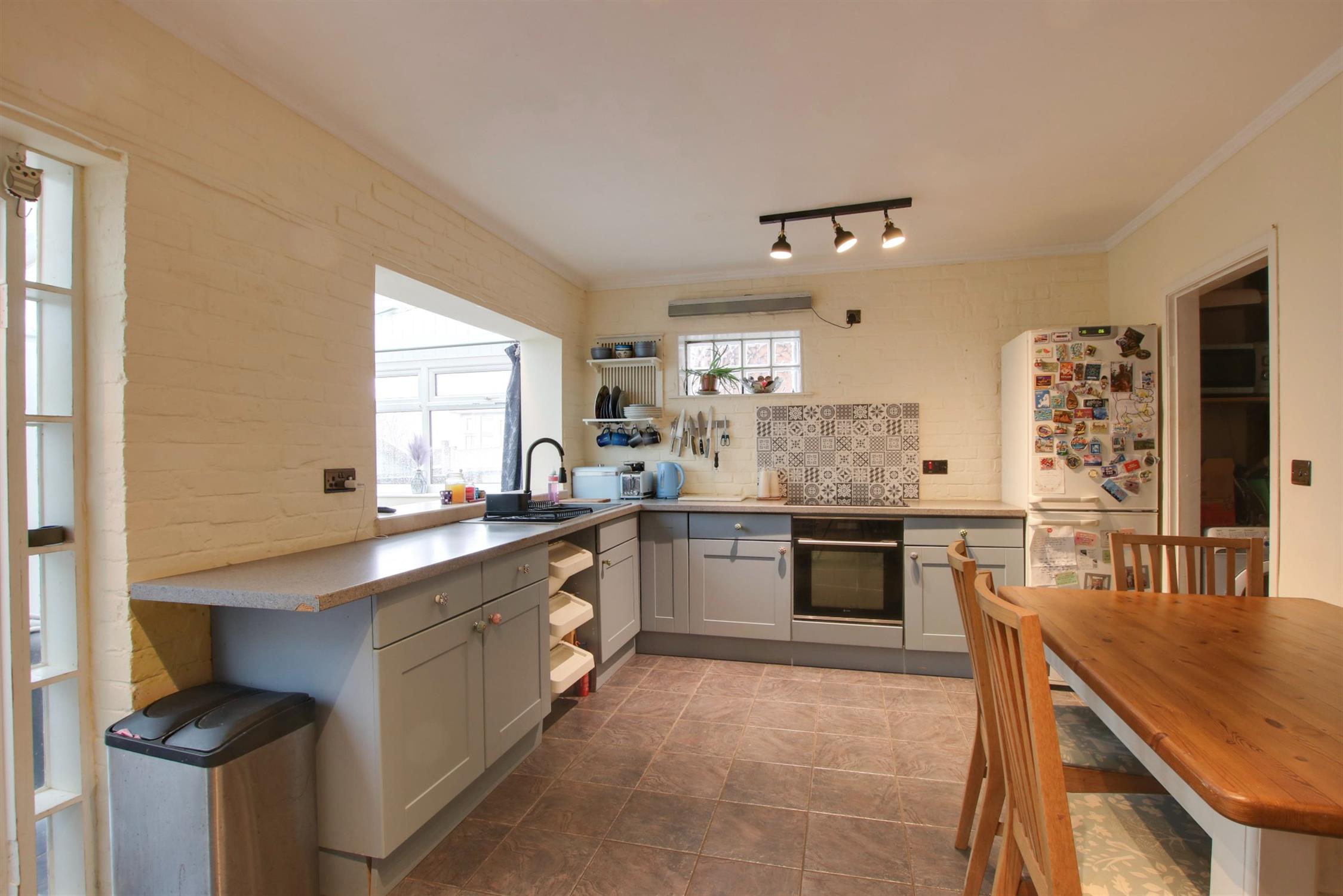 Obscure glass bricks to the side aspect. Opening to the conservatory. Low level units with inset stainless steel sink and drainer. Contrasting worktops. Four ring electric hob. Fitted oven/grill. Space for fridge/freezer and dishwasher. Feature brick chimney breast with a decorative ‘Rayburn' (not in working use). Radiator. Tiled flooring. Under-stairs storage where plumbing for washing machine can be found.