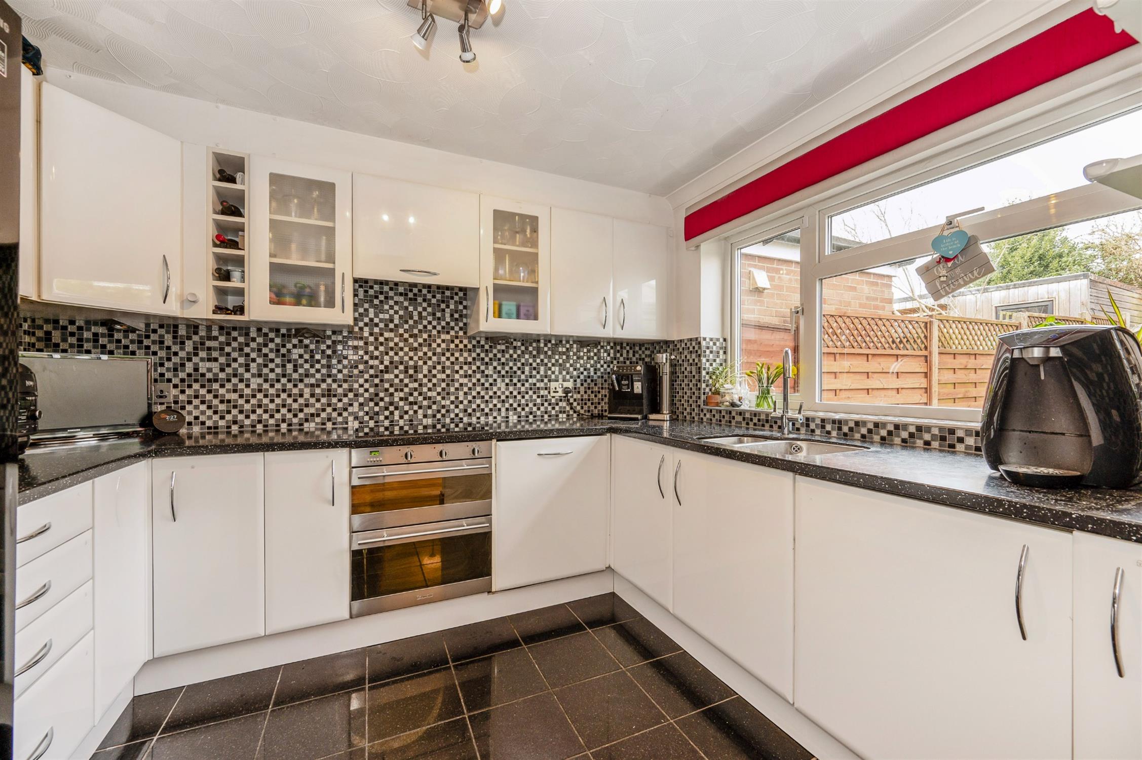 Upvc double glazed window looking out to the garden, sink with mixer tap, dishwasher, space and plumbing for a washing machine, fitted electric hob and oven, space for American style fridge/freezer