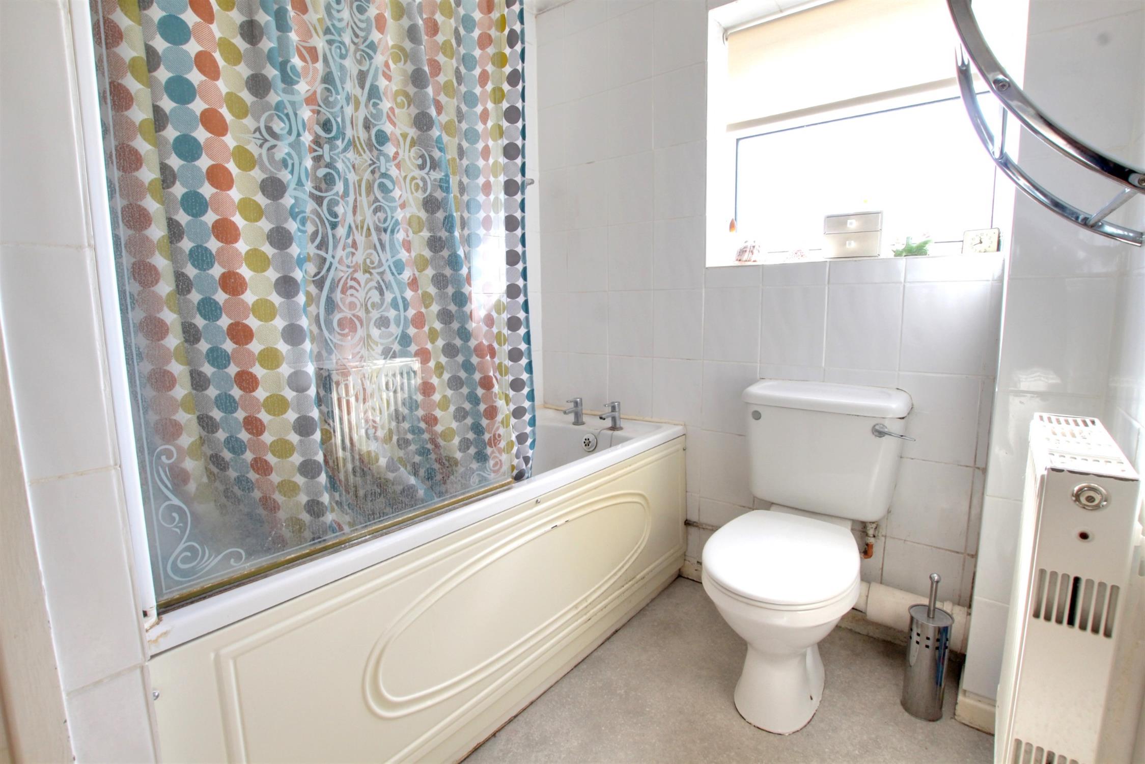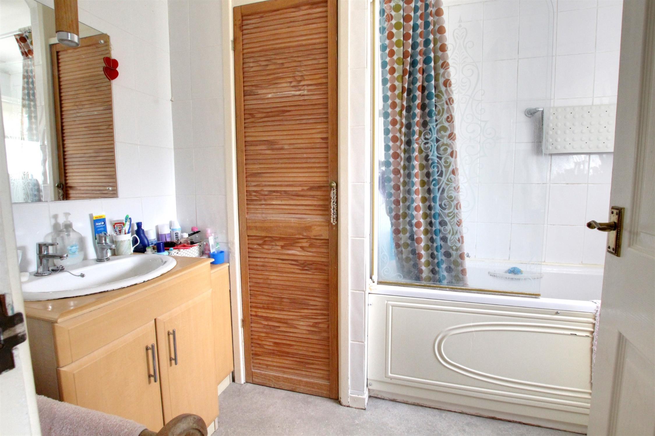 Matching suite comprising panel bath with glass screen and shower overhead. Wash basin with vanity surround and cupboards under. Low level W.C. Obscure Upvc double glazed window. Radiator, towel rail, smooth skimmed ceiling. Cupboard housing gas fired boiler.