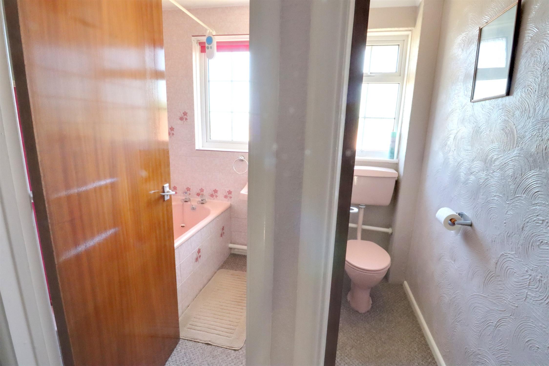 Opaque double glazed window to rear, panel enclosed bath with Triton electric shower over, pedestal wash hand basin, towel radiator, Dimplex electric fan heater, tiled walls.