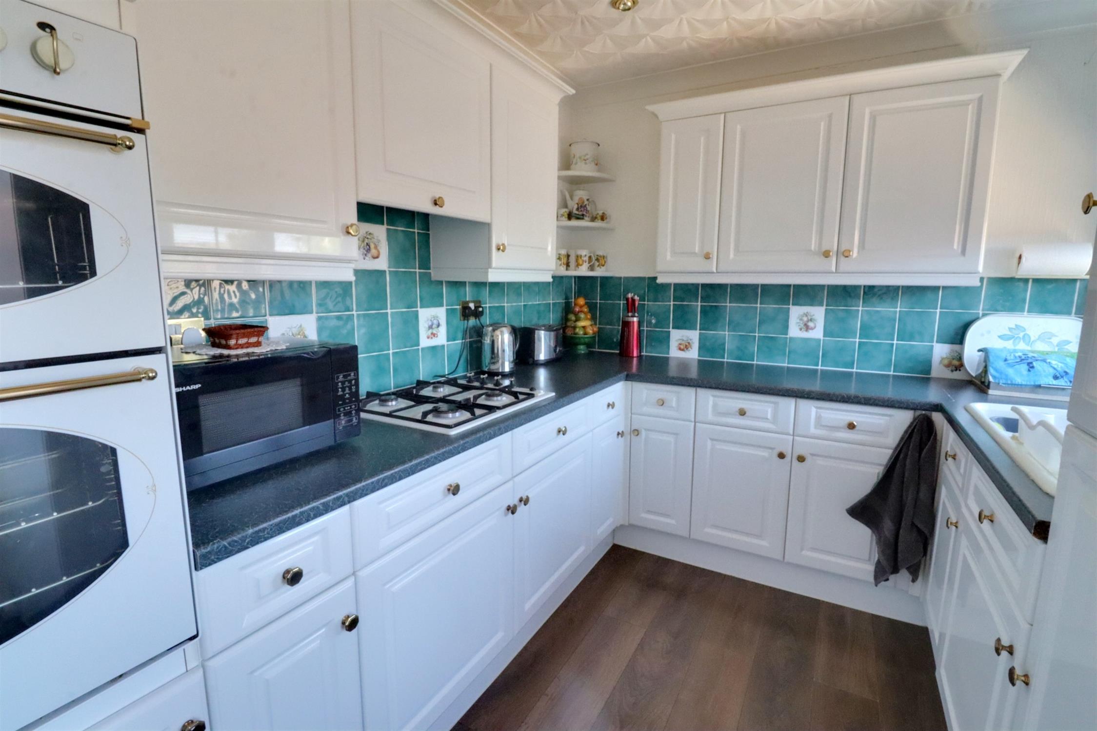 Double glazed window to rear, matching range of wall and base units, roll edge worksurfaces, single bowl sink and drainer with mixer tap, tiled splashbacks, electric oven, gas hob with over head extractor, built in washing machine and fridge freezer, opaque double glazed door to garden.