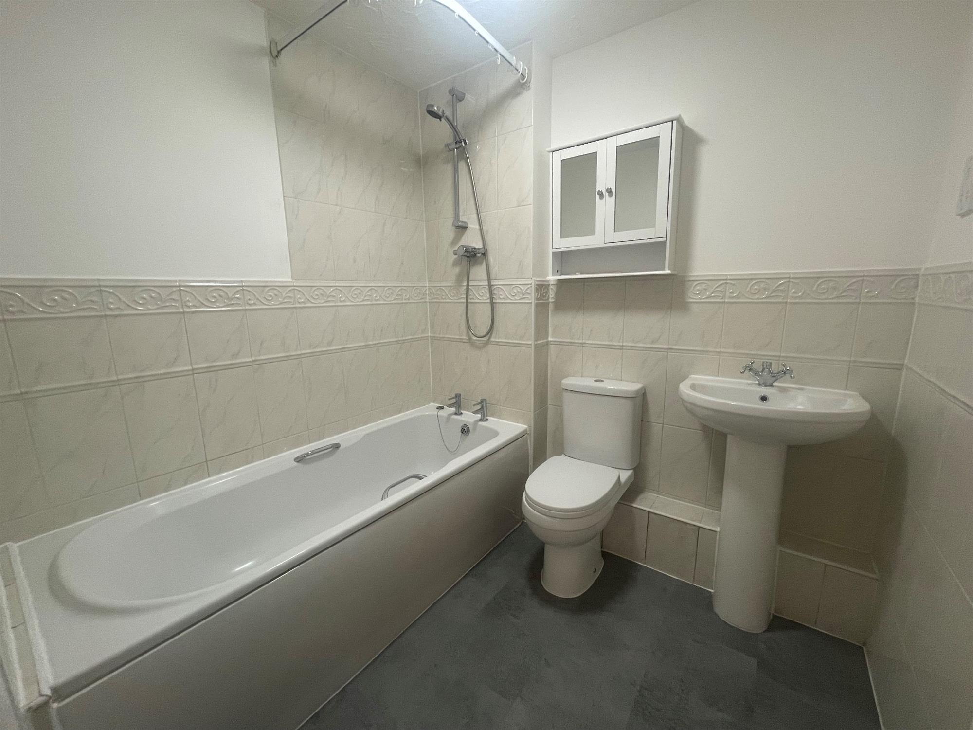 BATHROOM – White suite with bath with shower over, sink and toilet.