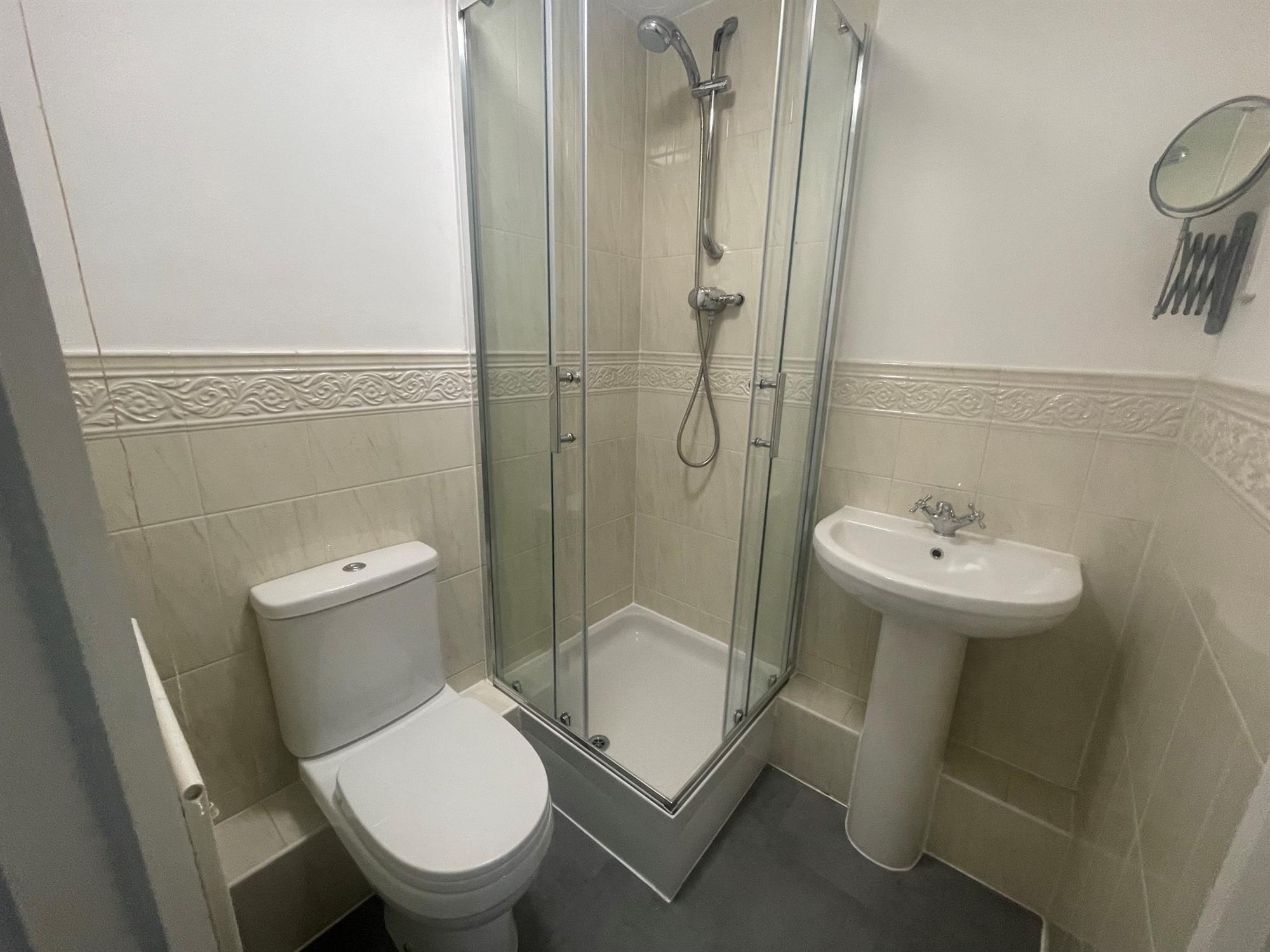 ENSUITE – White suite with shower cubicle, sink and toilet.