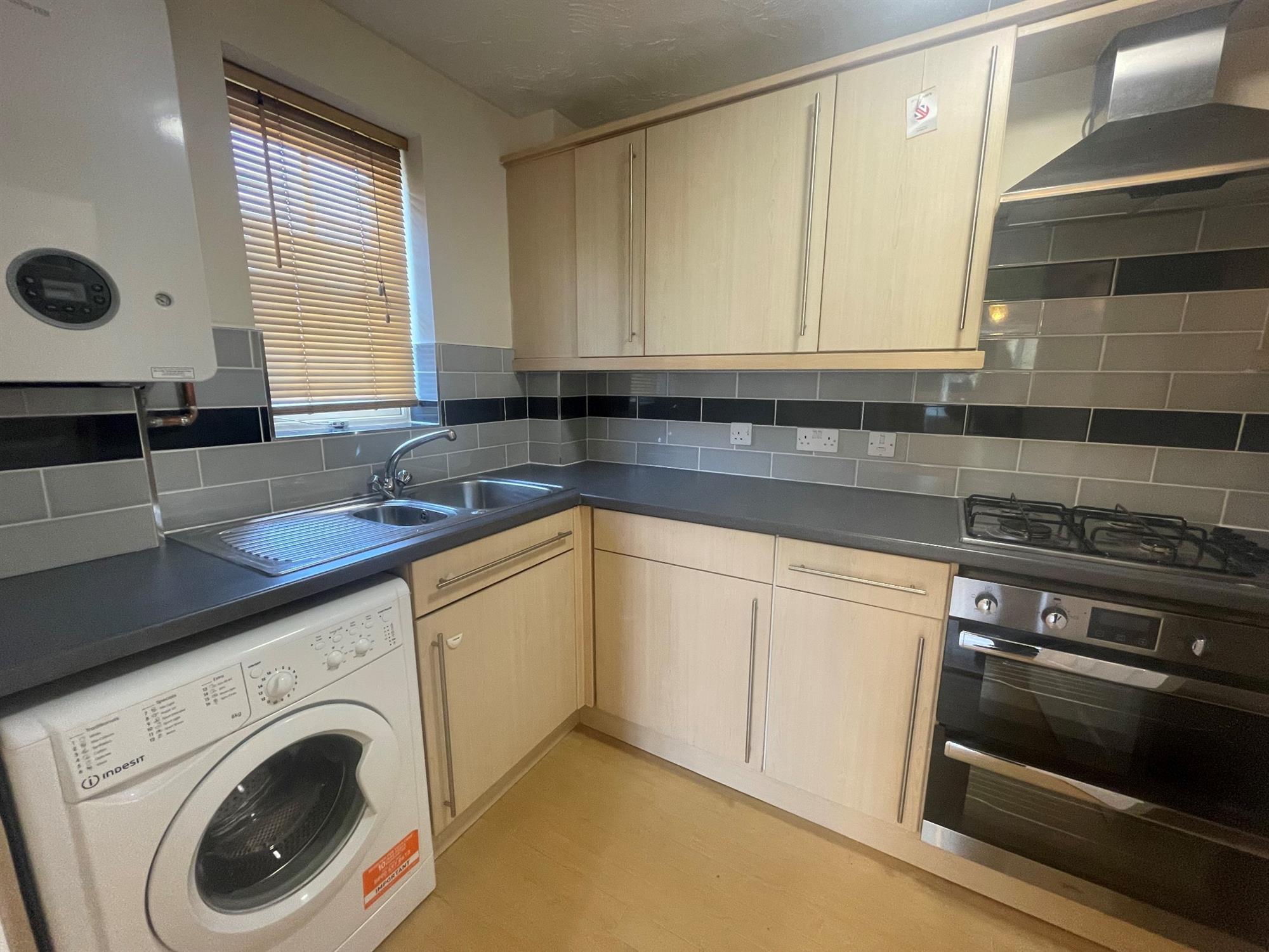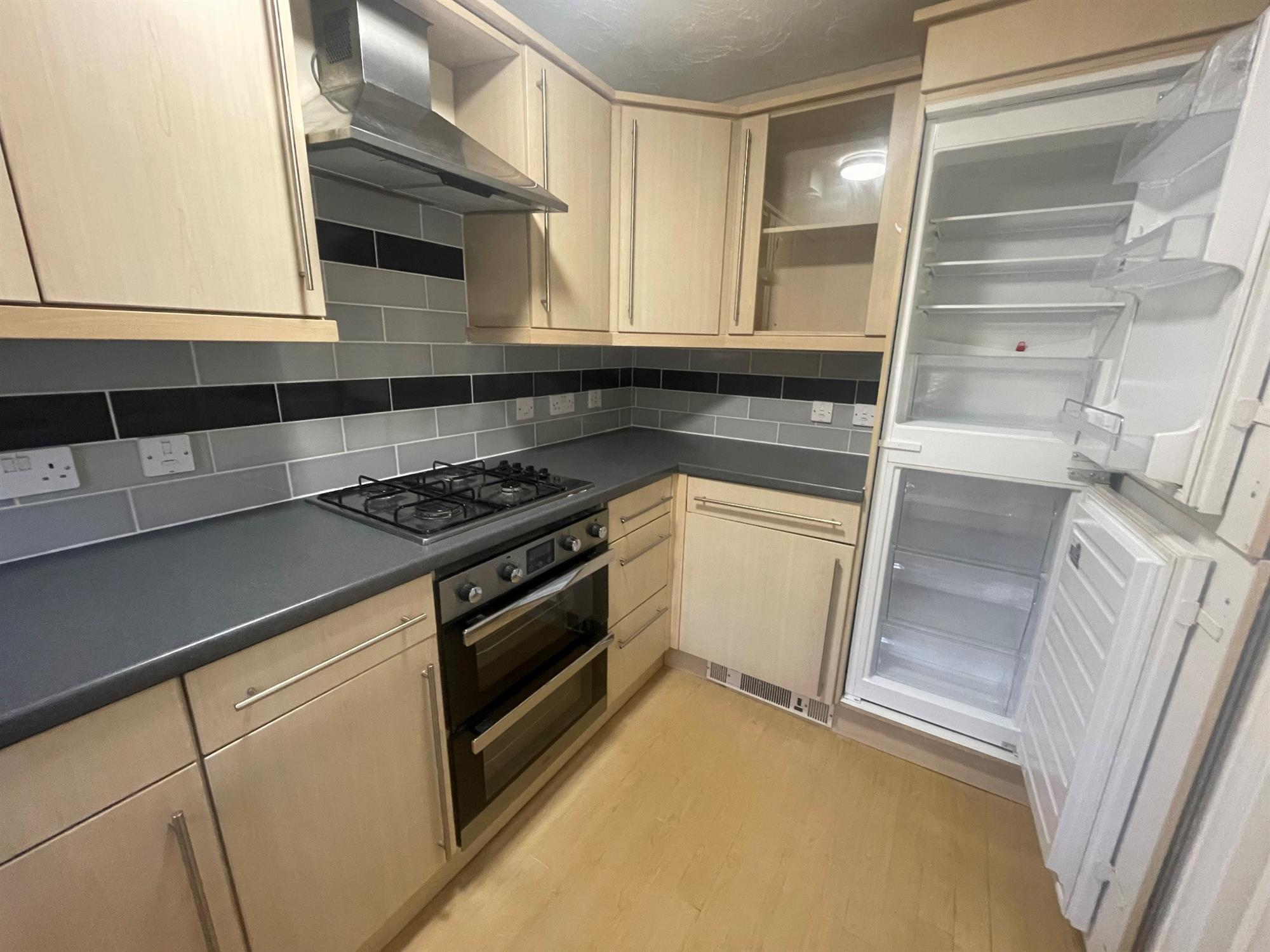 KITCHEN – Modern wall and base units with window to side of the block. Appliances consist of gas hob, electric double oven, washing machine and fridge/freezer.