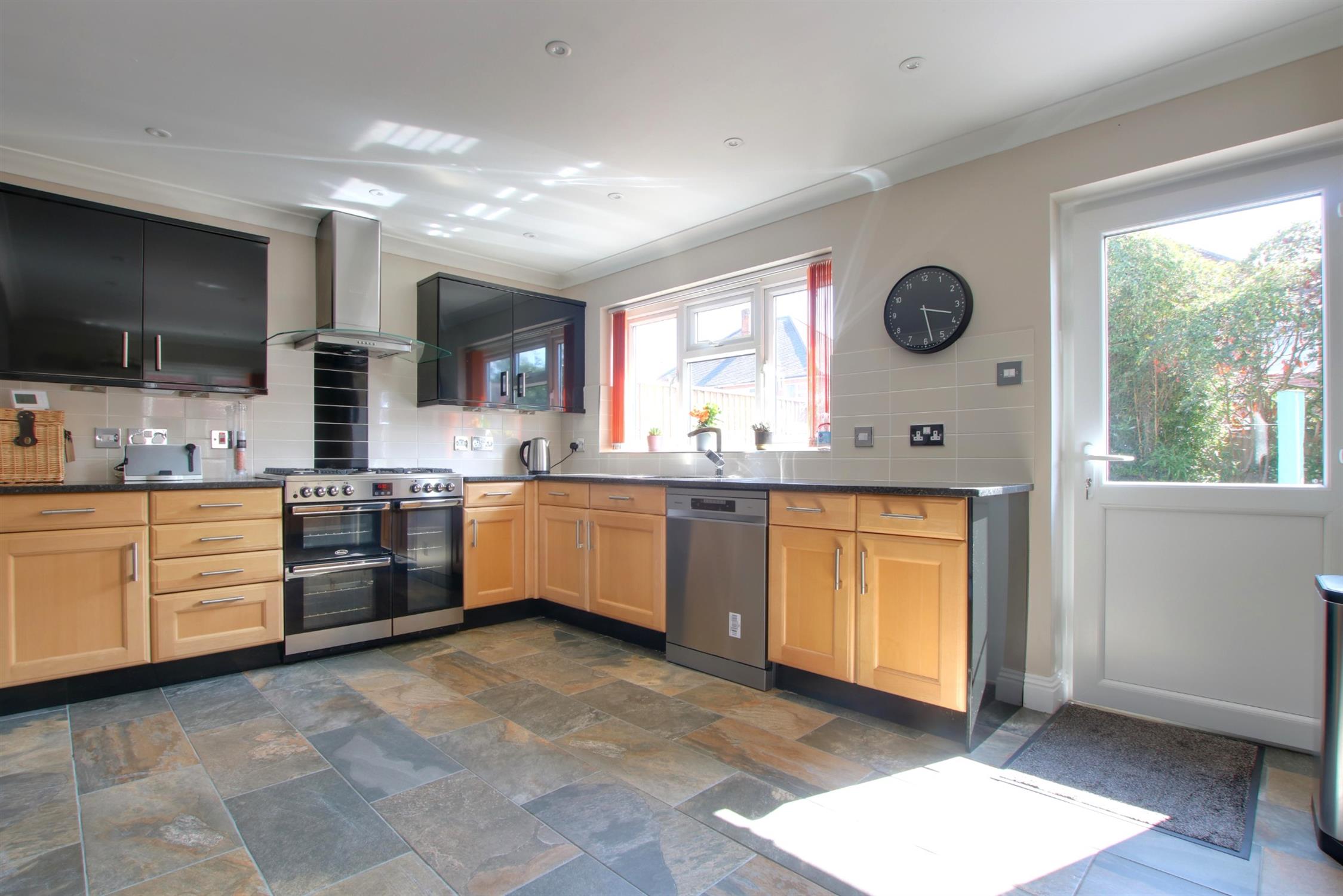 Tiled flooring. Range of matching wall and base units. Space for cooker, dishwasher and fridge freezer. Inset sink. Door leading to garden. Double-glazed windows to side and rear aspect. Radiator.