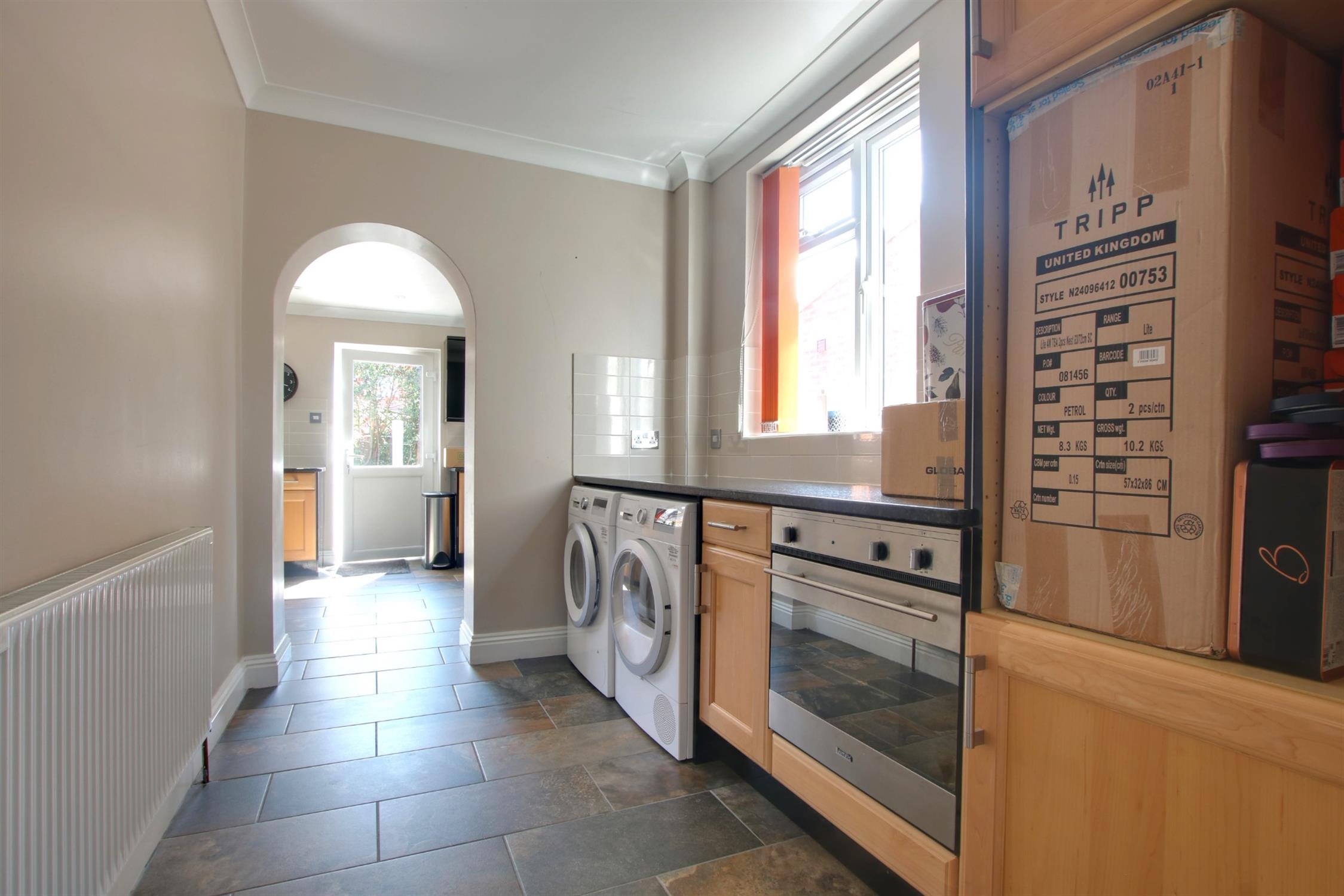 Tiled flooring. Tiled splashback. Space for washing machine and dryer. Integrated electric fan oven. Double-glazed window to side aspect. Radiator