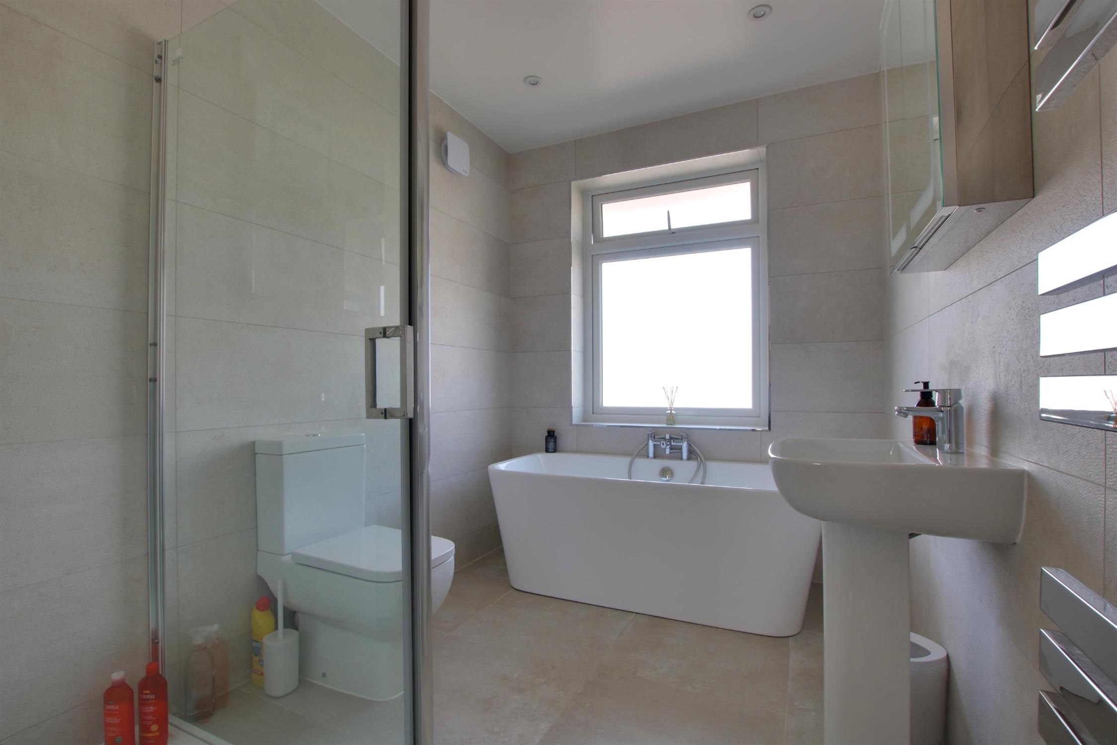 Tiled flooring and walls. Freestanding bath with mixer tap fitting and shower attachment. Shower cubicle. Low level W.C and basin. Extractor fan. Obscure double-glazed window to front aspect. Heated towel rail.