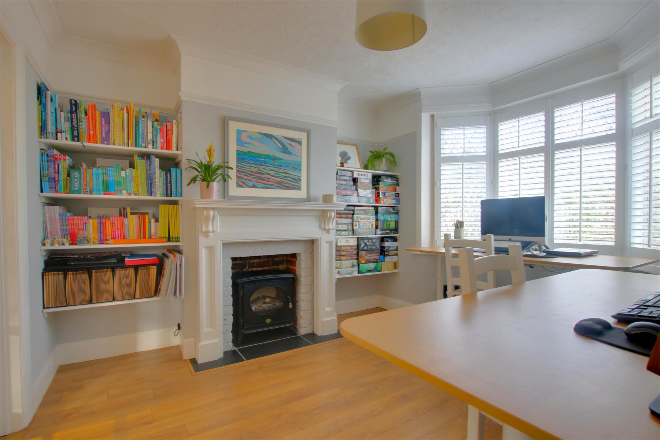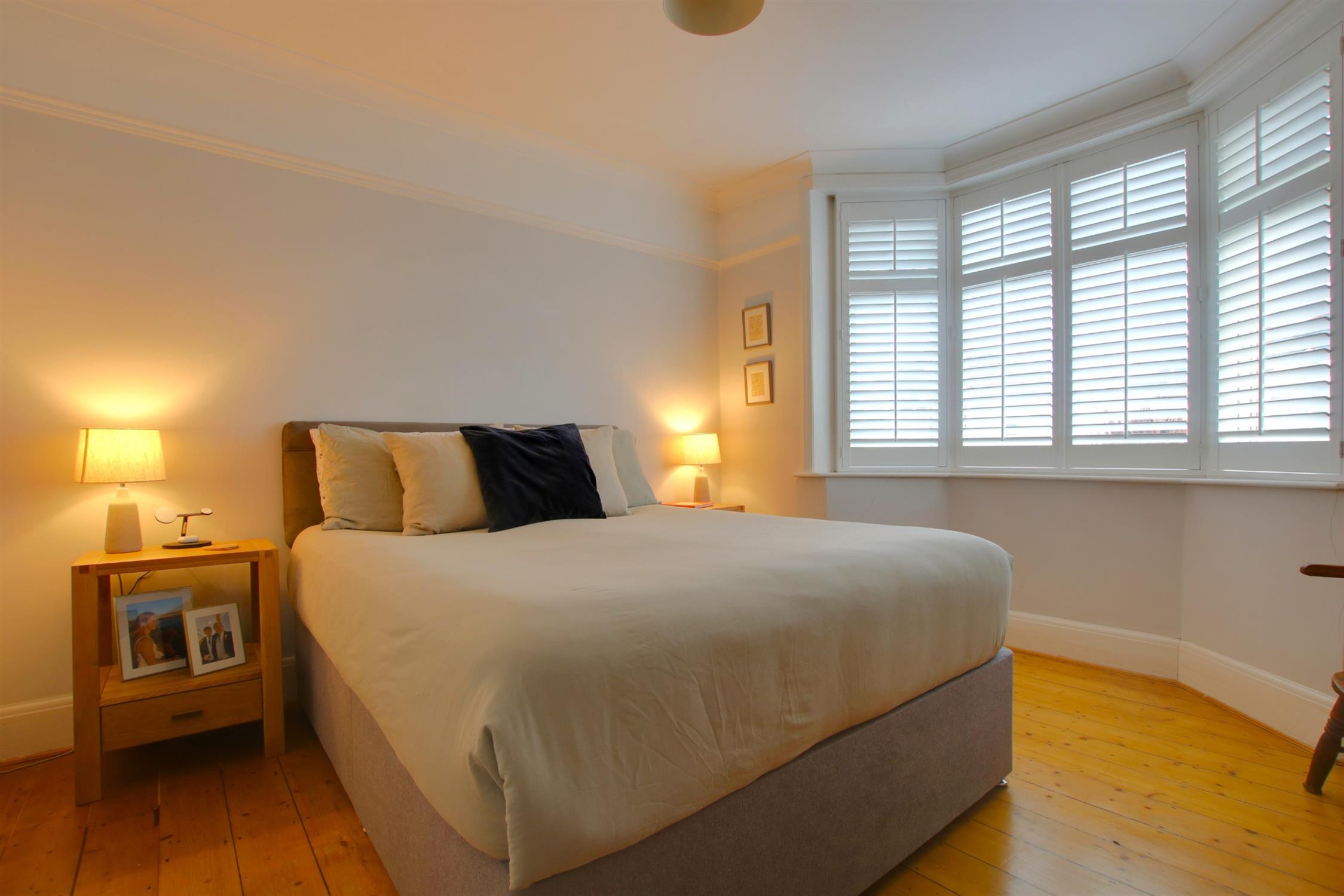 Original wooden flooring. Deep skirting board and coving. Picture rails. Double-glazed bay window to front aspect. Radiator.