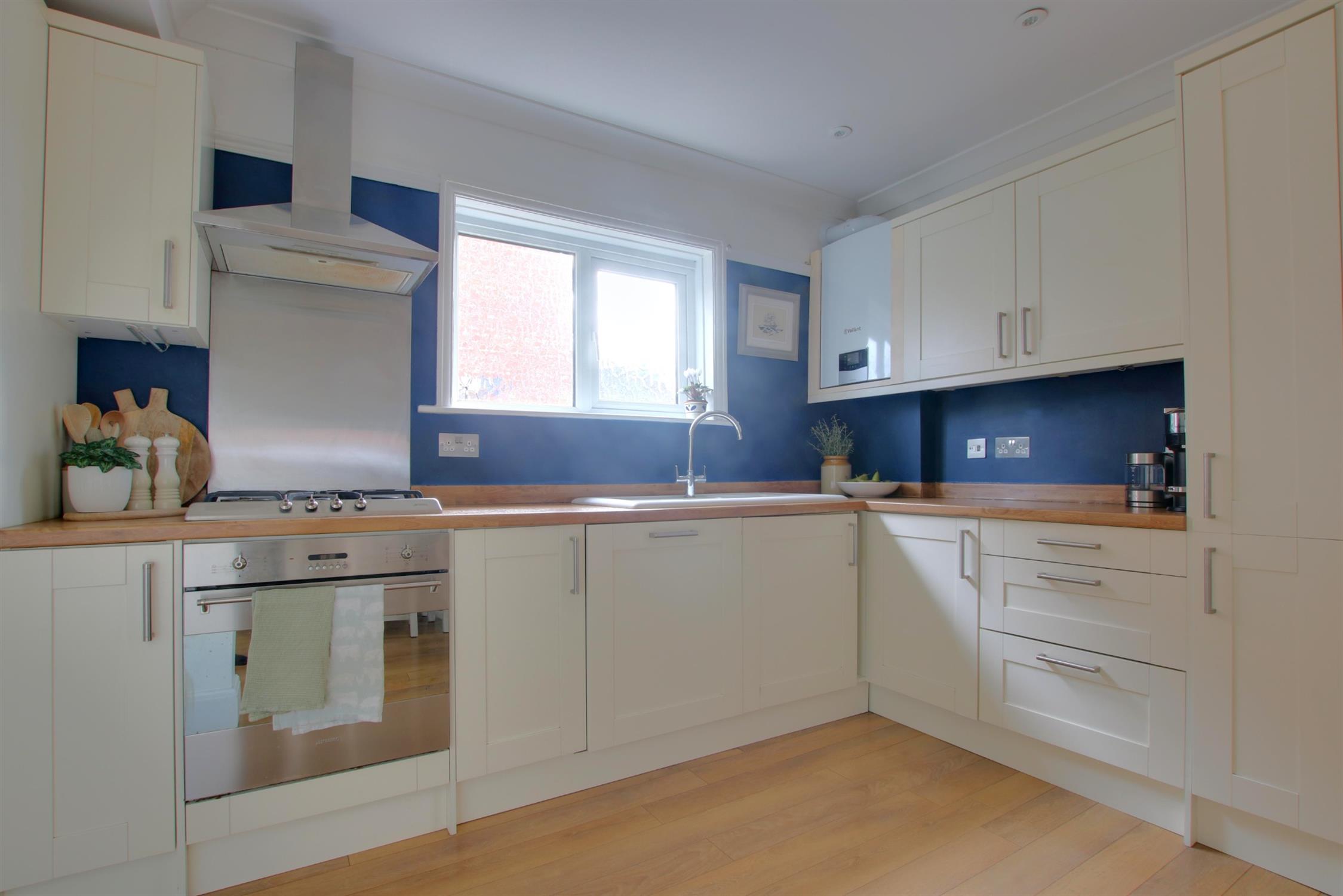 Laminate flooring. Deep skirting board and coving. Picture rails. Two radiators. Kitchen comprises matching wall and base units with under counter LED lighting. Inset ceramic sink with drainer. Wall mounted combination boiler. Integrated fridge-freezer, electric fan oven and gas hob with extractor hood. Space for a dishwasher. Double-glazed window to side aspect.