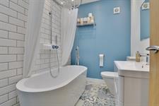 BATHROOM - A three-piece bathroom suite comprising; Low level WC, Ceramic sink with tap fitting in chrome finish and freestanding bath tub with mains shower head over.