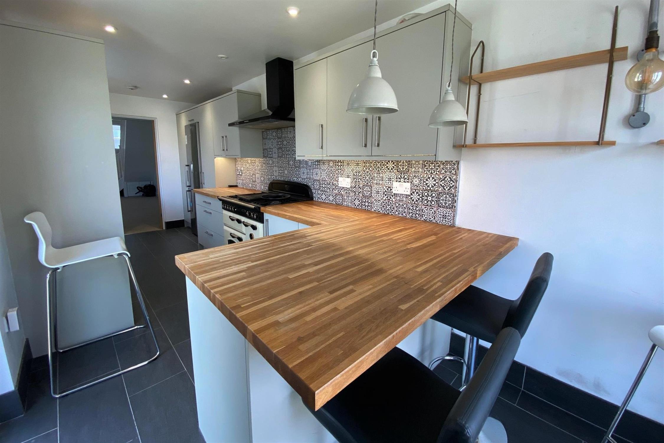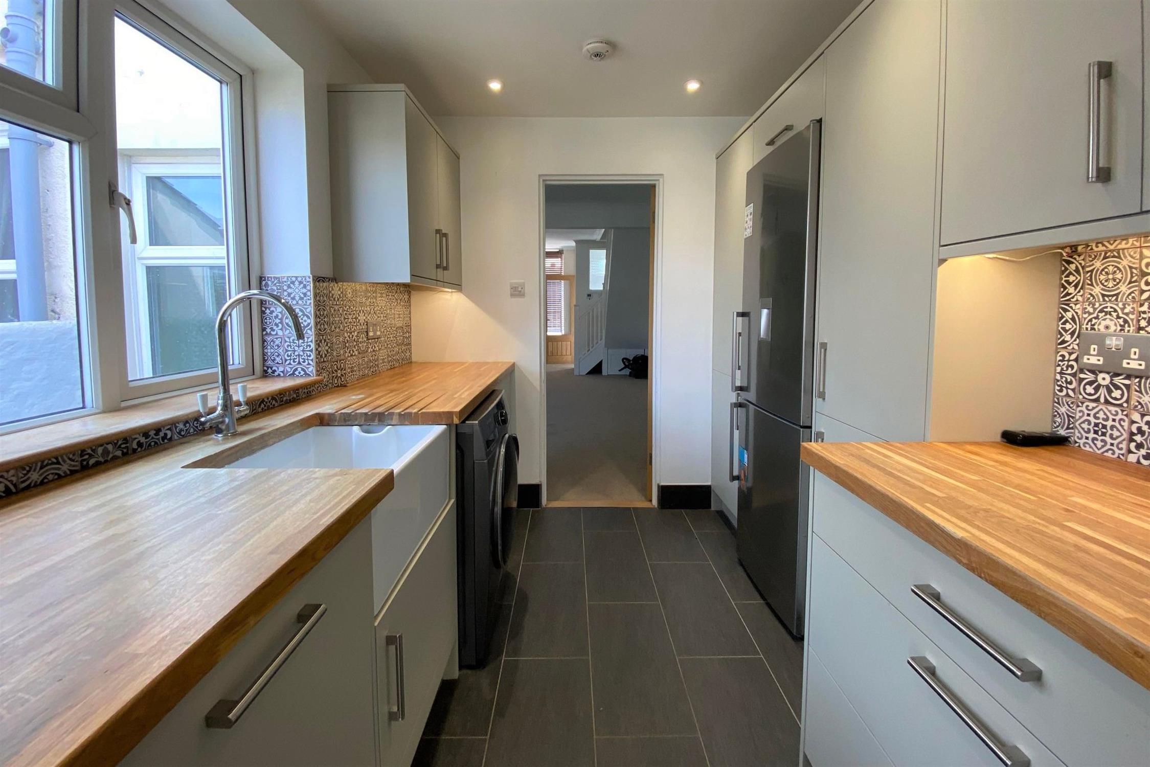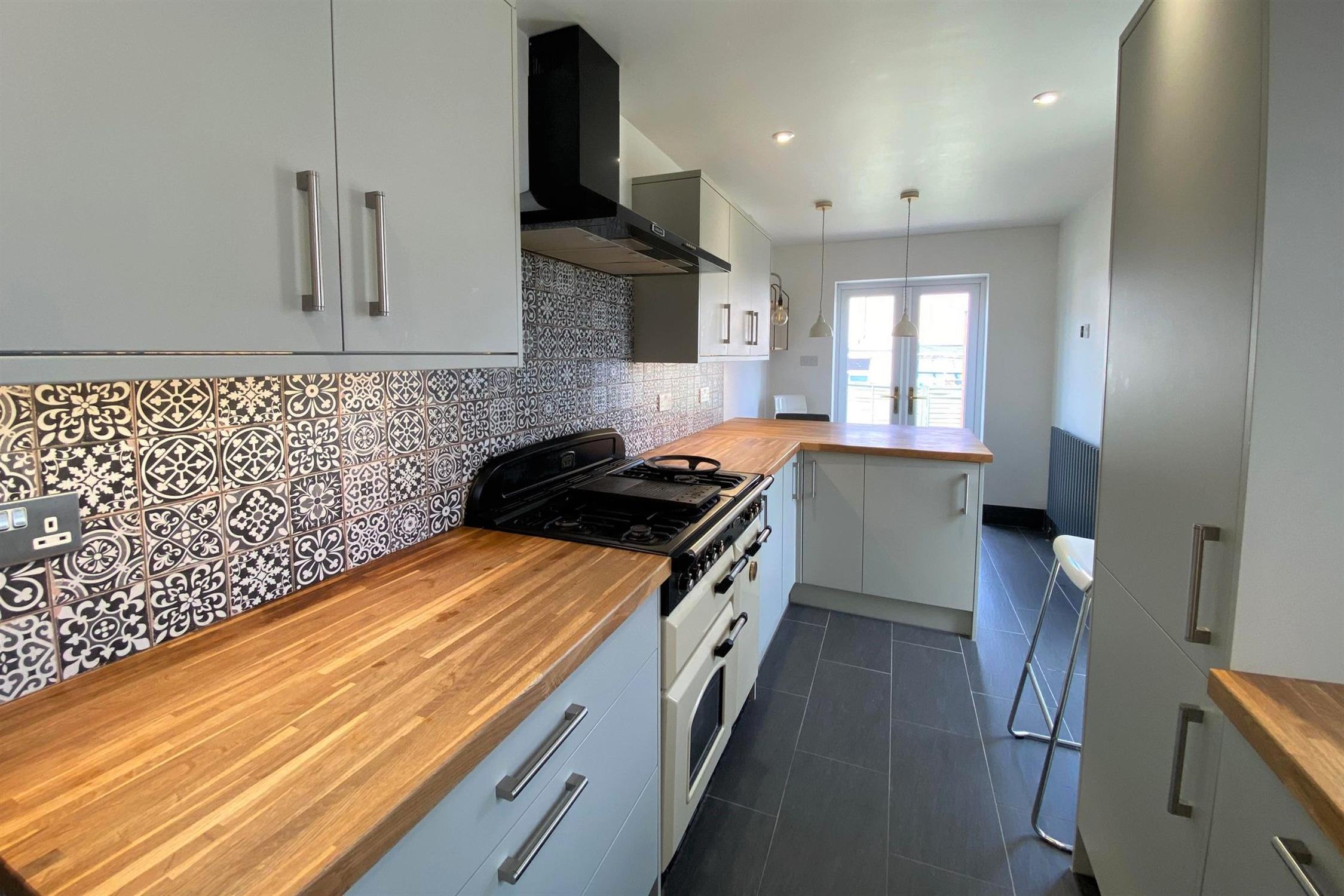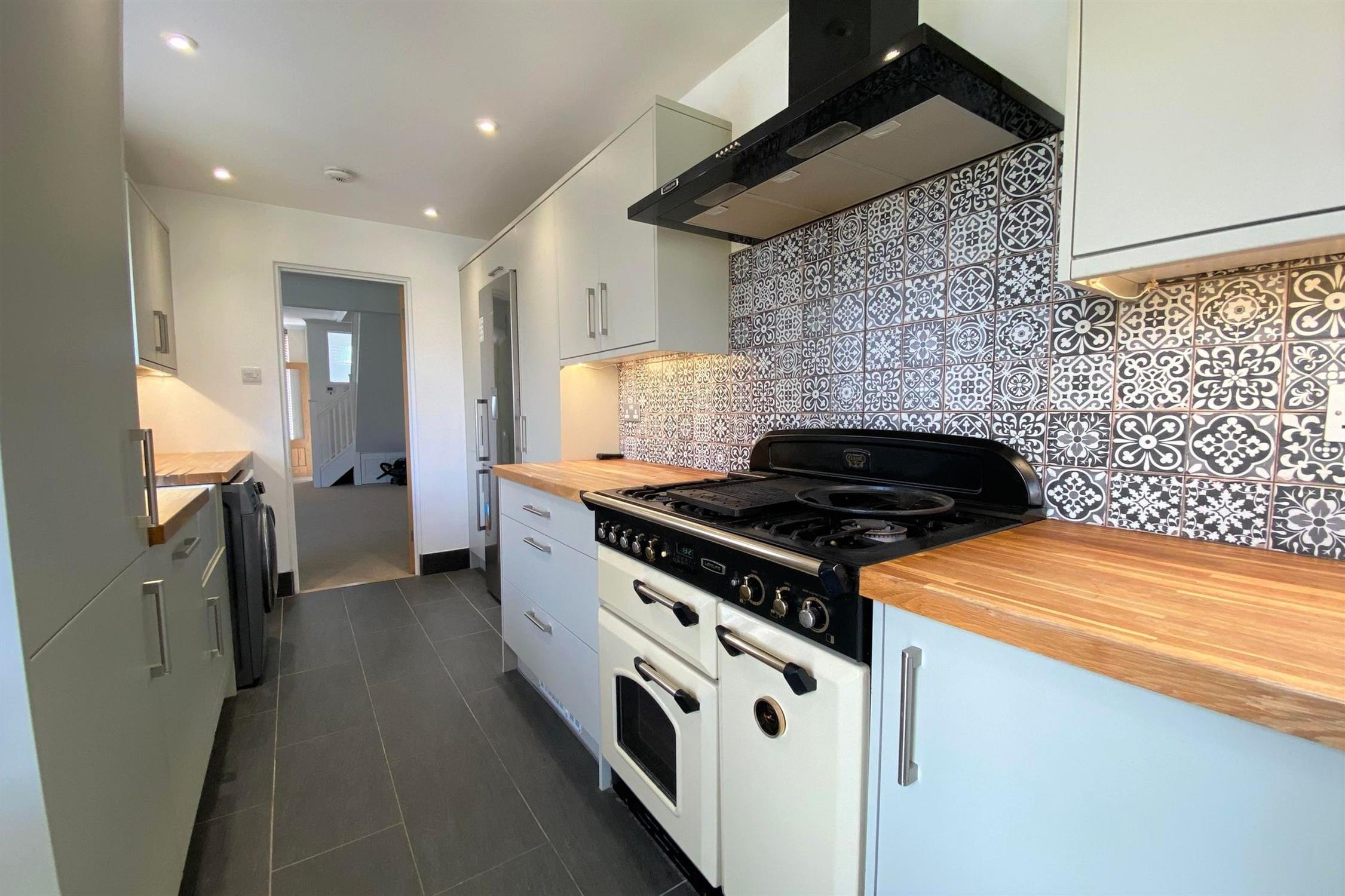 KITCHEN - Modern fitted kitchen with freestanding fridge/ freezer, integrated dishwasher, washing machine & range style cooker.
