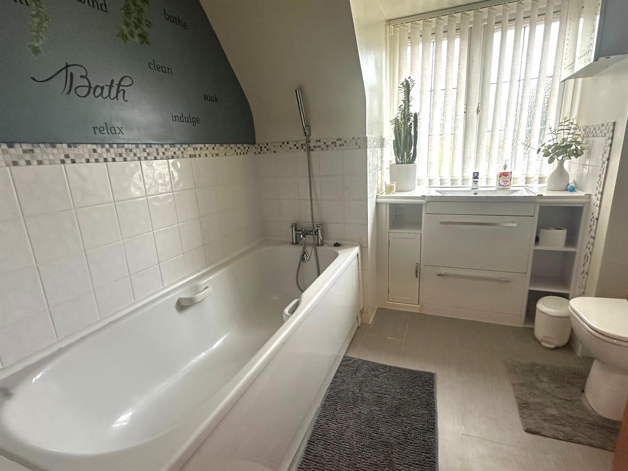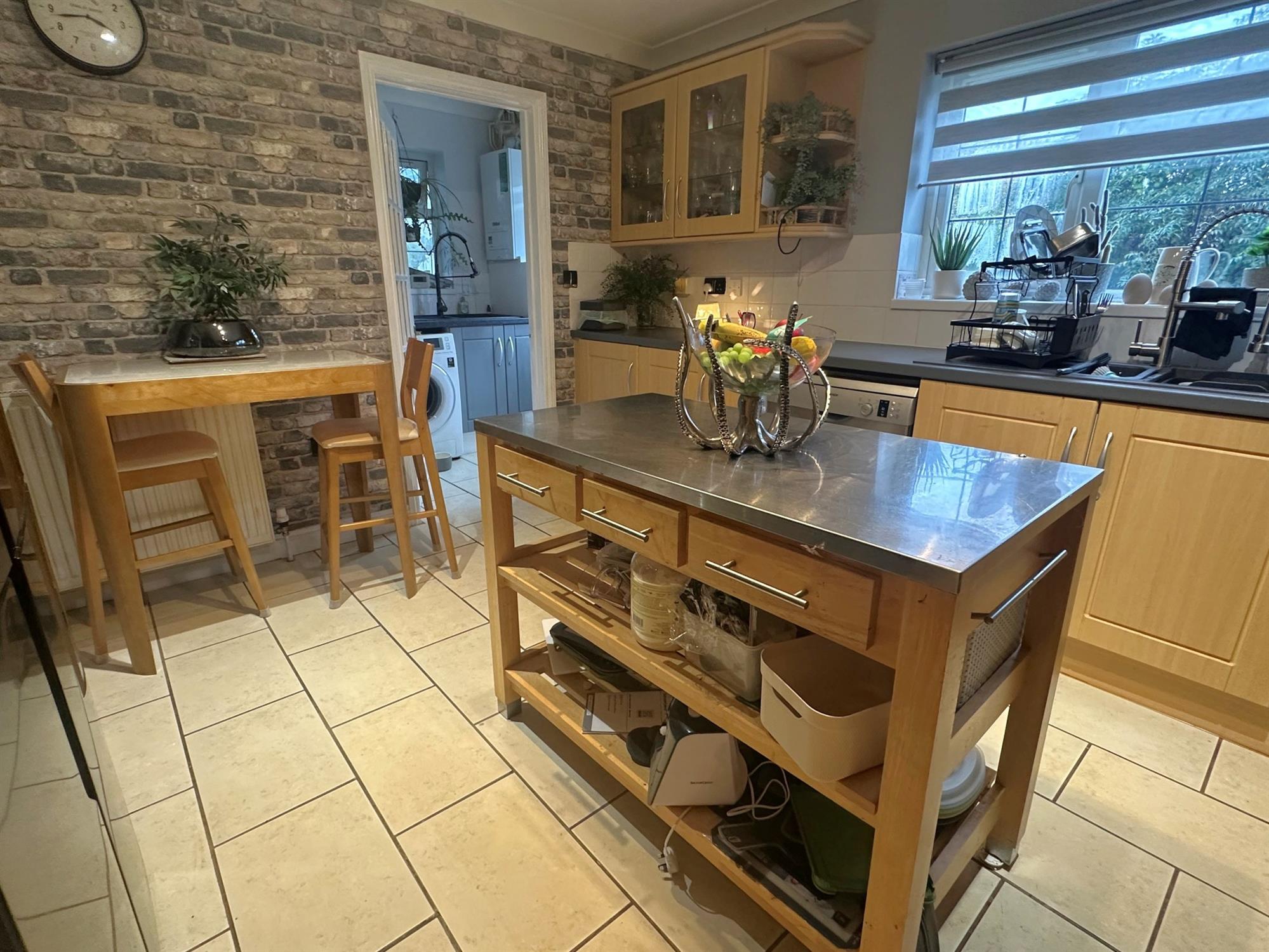 Window to side. UPVC double glazed door to garden. Range of base and wall units with working surface over and tiling to splashback. One and a half bowl unit with mixer shower style tap. Space and plumbing for washing machine. Wall mounted Vaillant gas fired boiler. Ceramic tiled flooring.