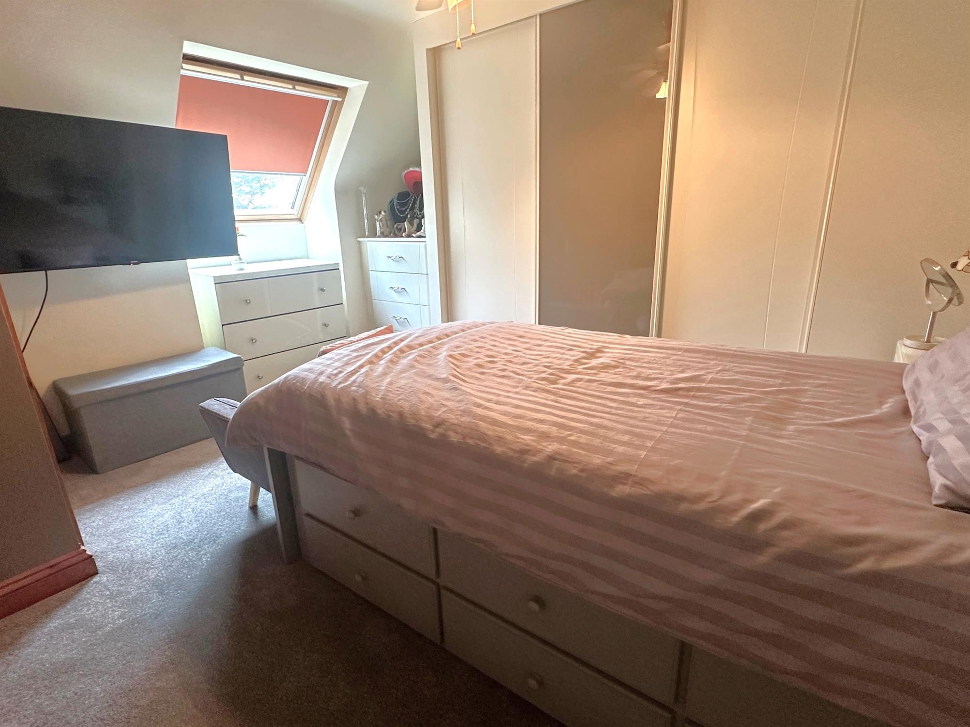 Velux window to side. Range of sliding door wardrobes with hanging rail and shelving. Built in storage cupboard. Radiator.