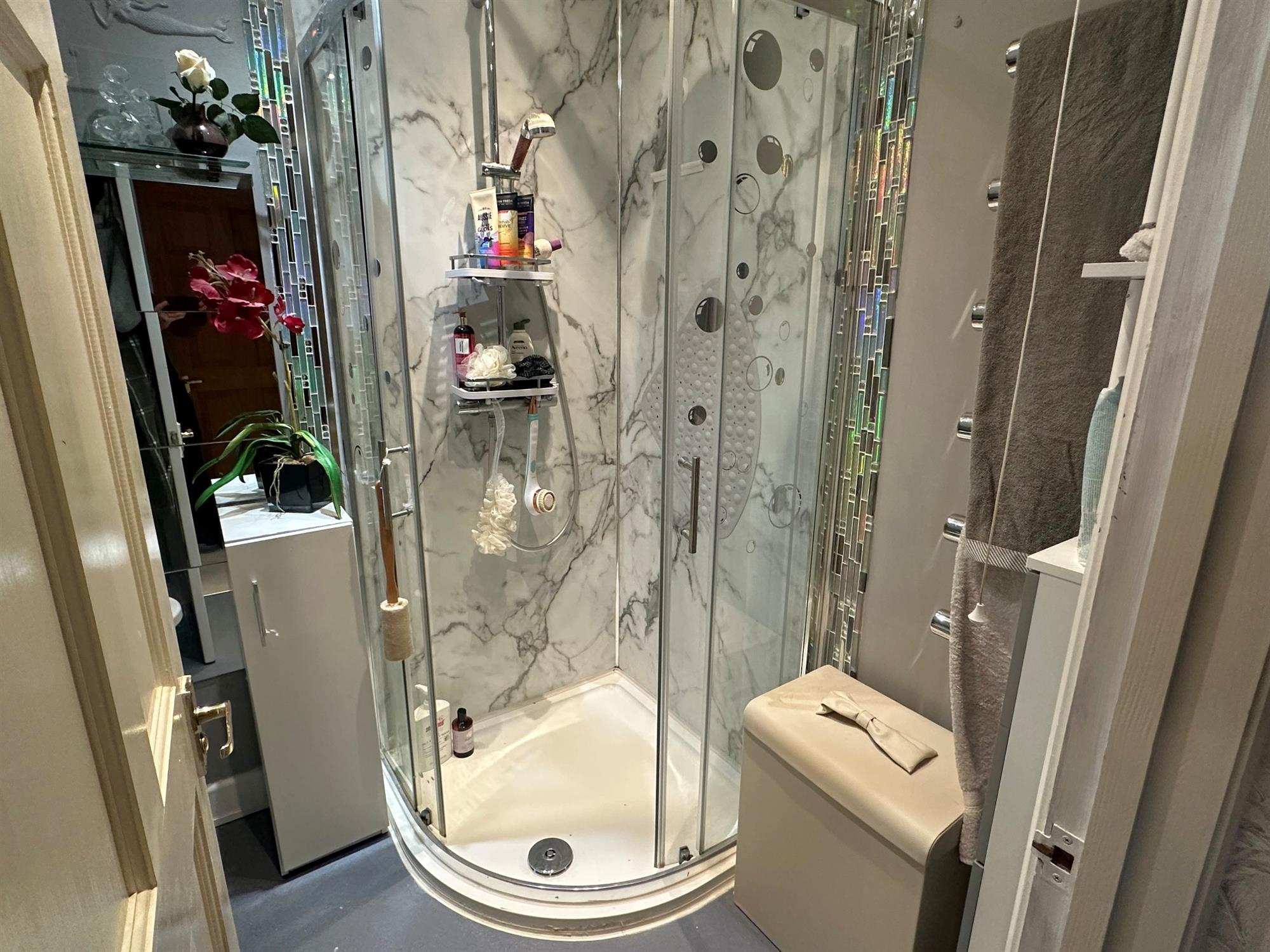 Comprising corner shower cubicle. Close couple WC. Wash hand basin with mixer tap and fitted drawer below. Inset ceiling lights and extractor fan. Chrome heated towel radiator.