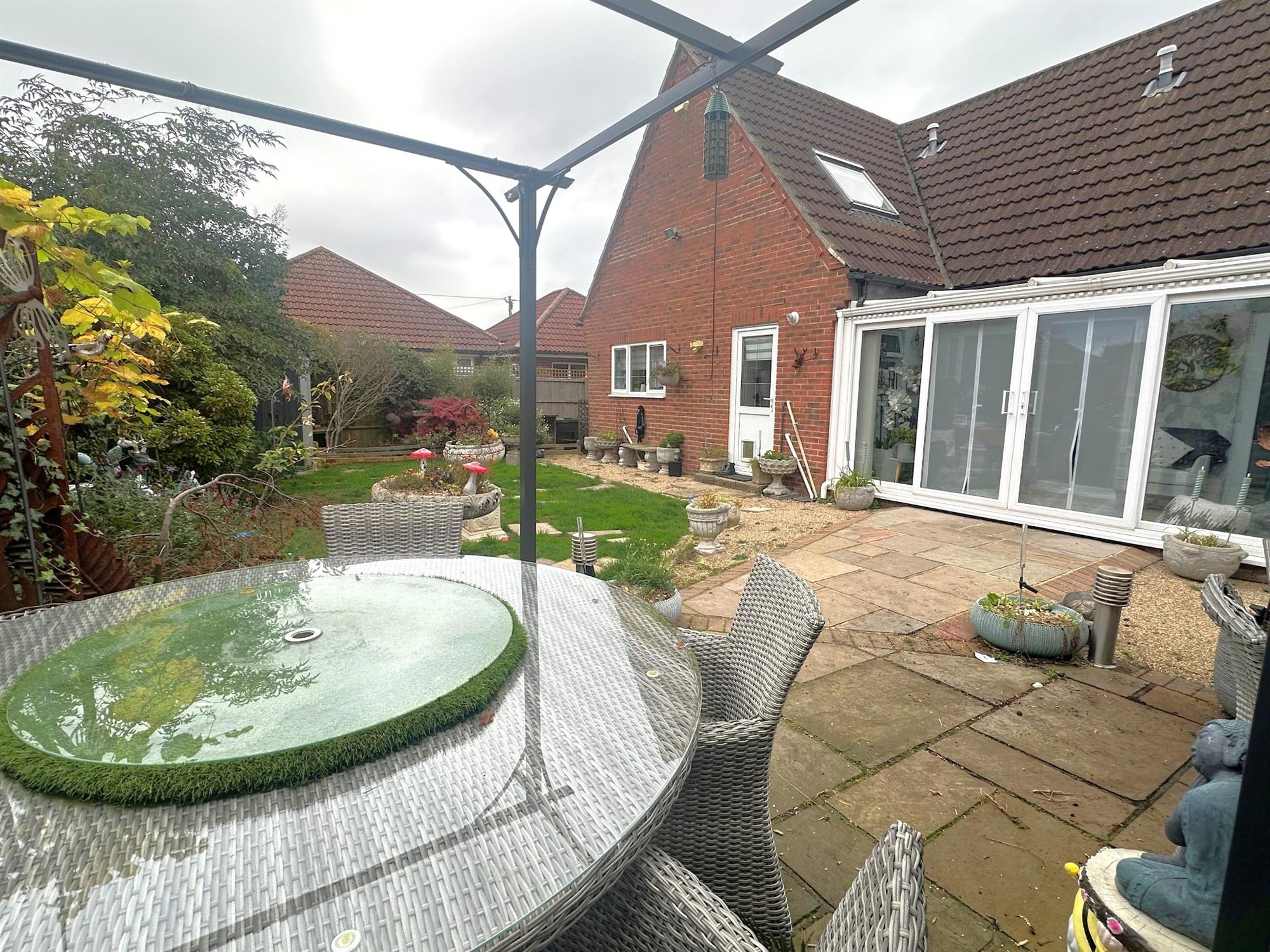 The front garden is fenced to side boundaries and a brick wall and wrought iron gates to front. Shingle driveway offering ample off road parking and leading to: