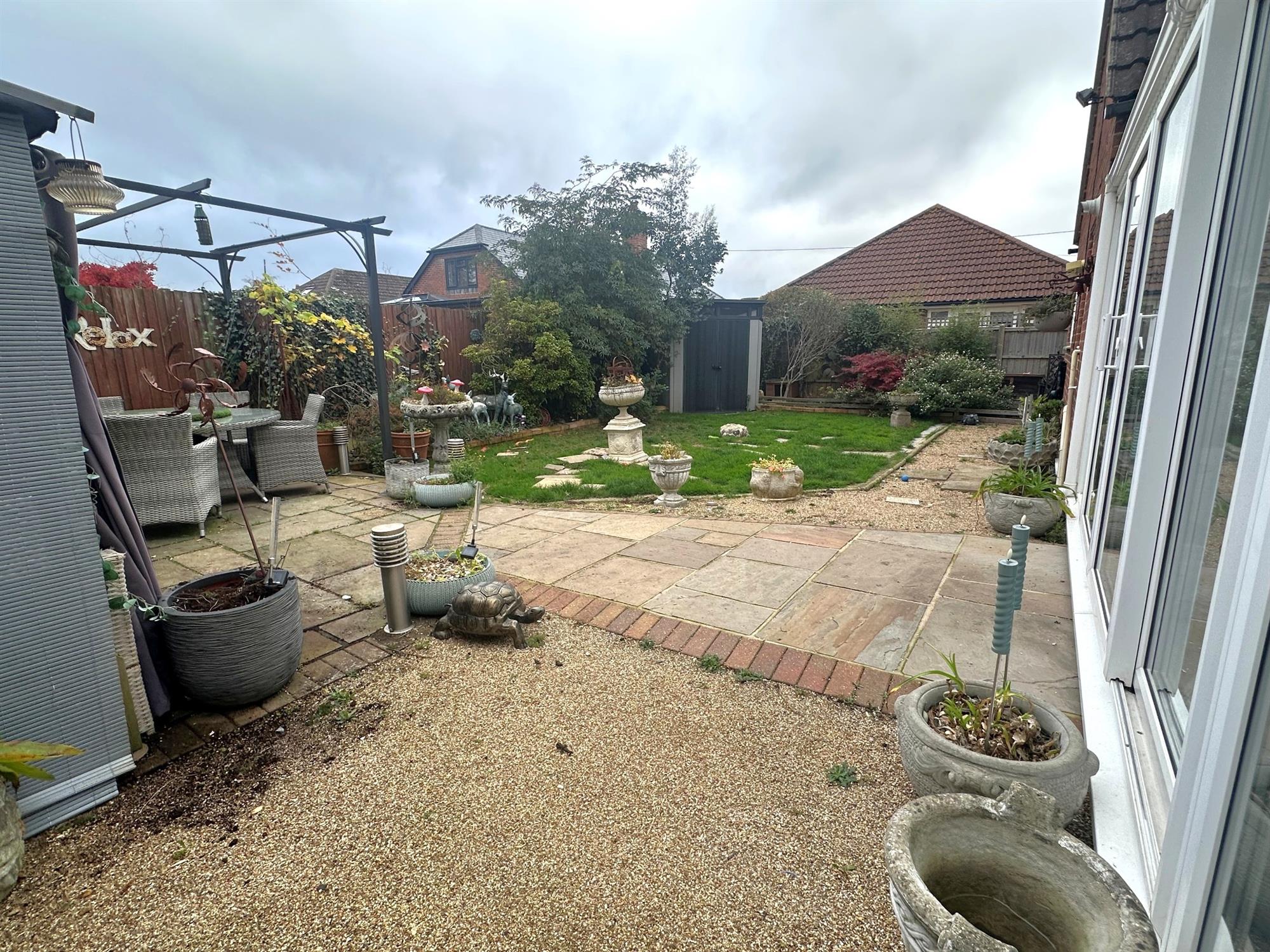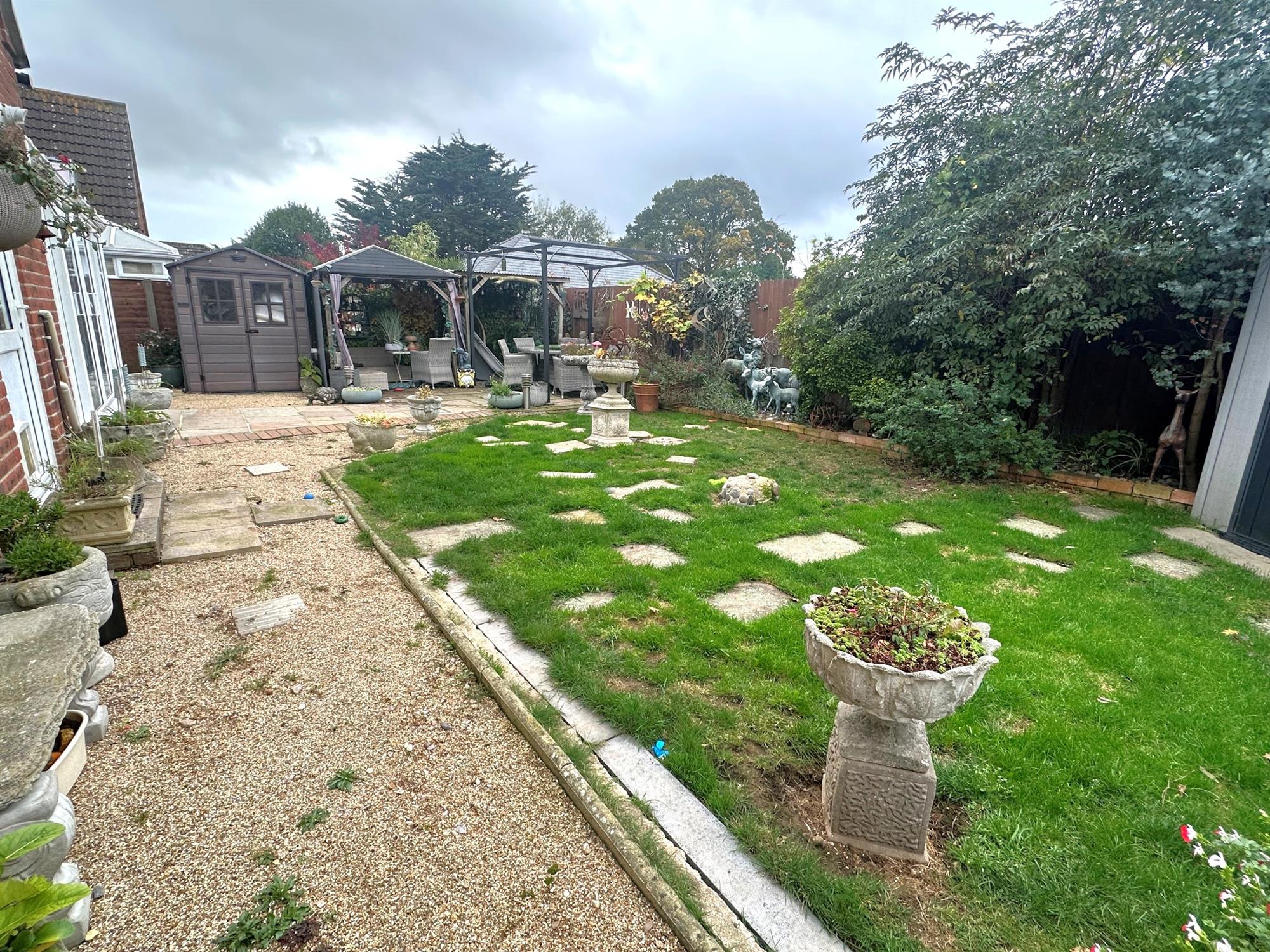 Fenced to boundaries. Laid to lawn. Patio areas. Three garden sheds. Pergola seating area. Outside tap.