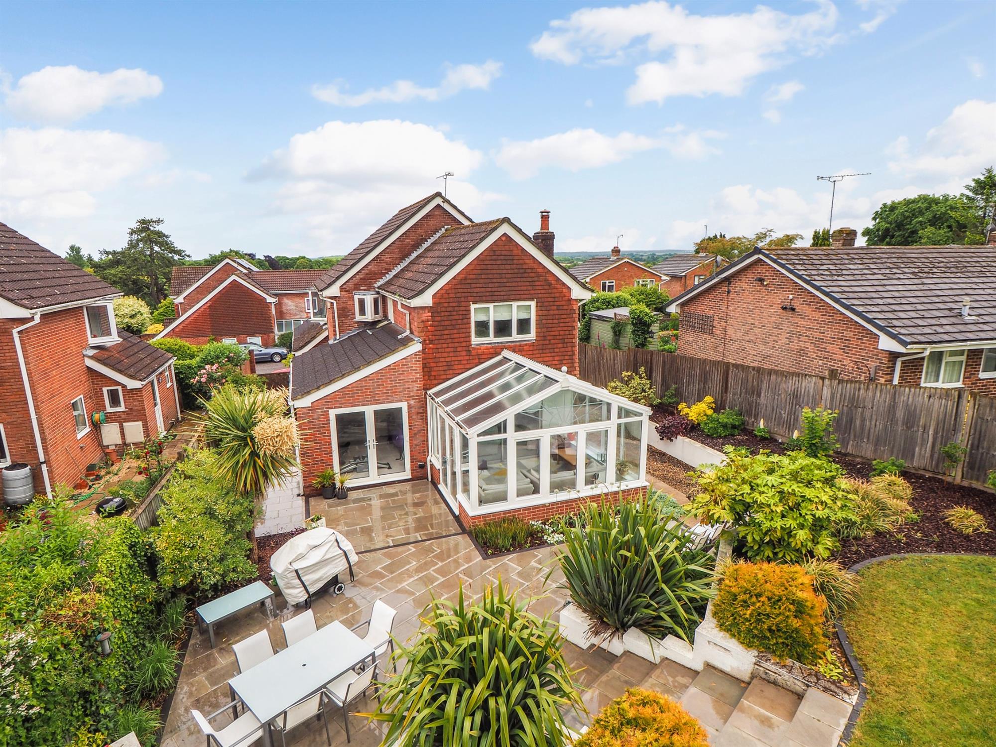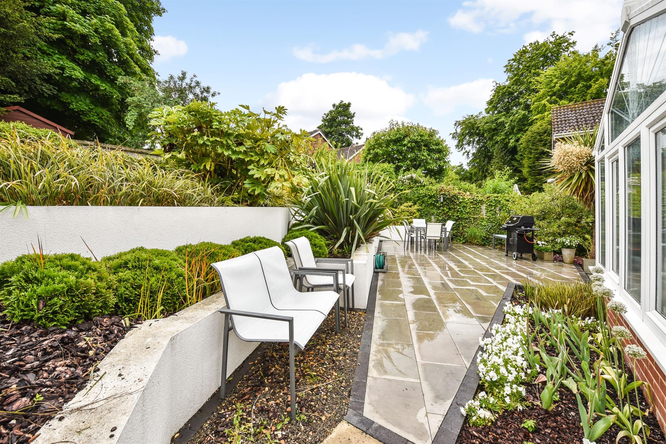 The garage has a double width up and over door and measures at 296sqft. The garden is landscaped in a contemporary fashion with a dining patio adjacent to the conservatory and family room, steps leading to an upper lawn, and attractive mature beds surrounding.