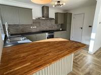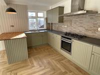 Window to rear. Range of wall and base units with work surfaces over. One and a half bowl stainless steel sink unit. Tiled splashbacks. 5 ring gas hob with extractor over. Built-in electric oven. Space for fridge freezer. Door into: