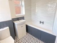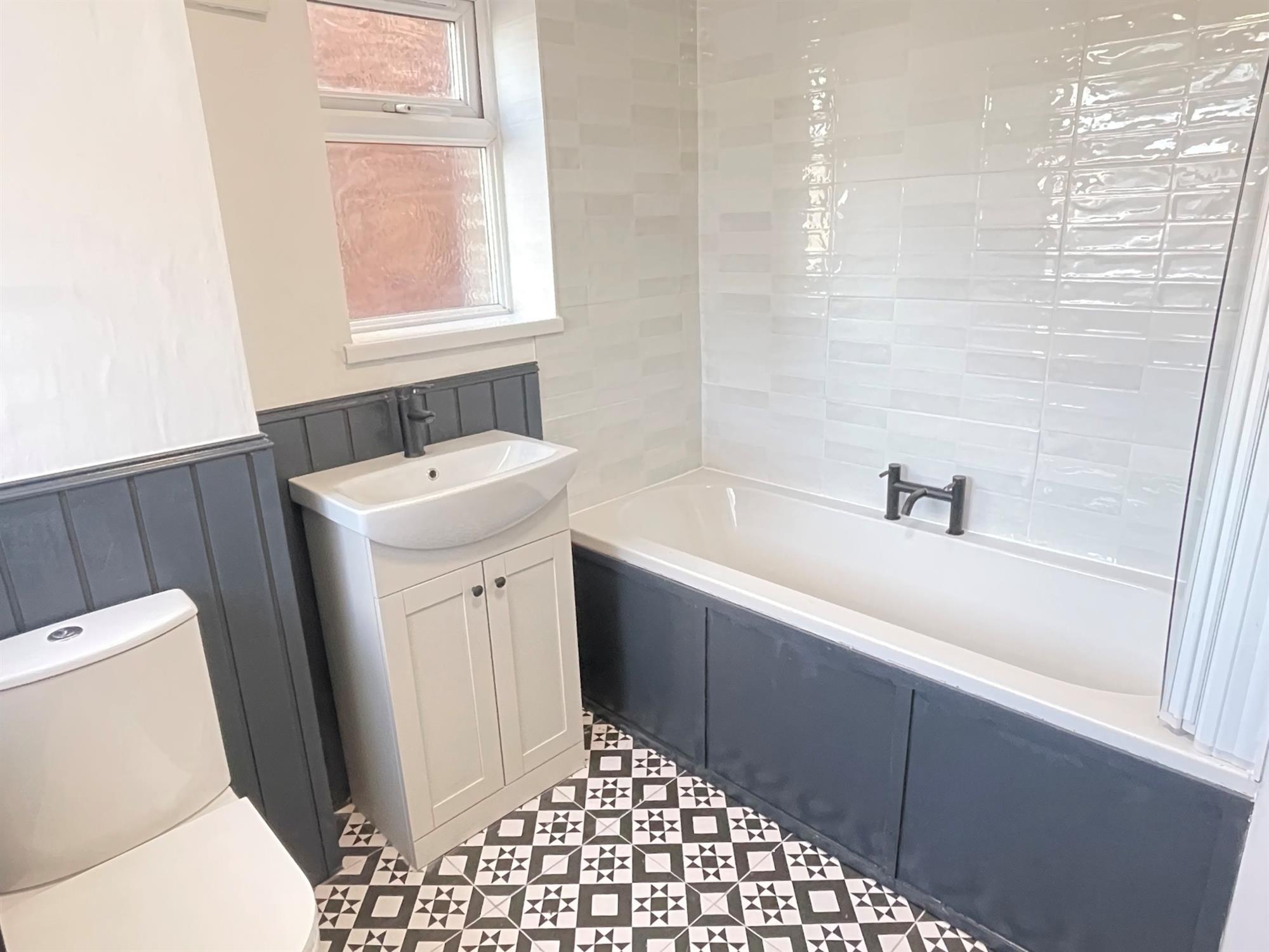 Windows to front and side. Low level WC. Inset wash hand basin with cupboard below. Panelled bath with shower over. Complementary tiling and panelling to walls. Built-in cupboard. Heated towel radiator.