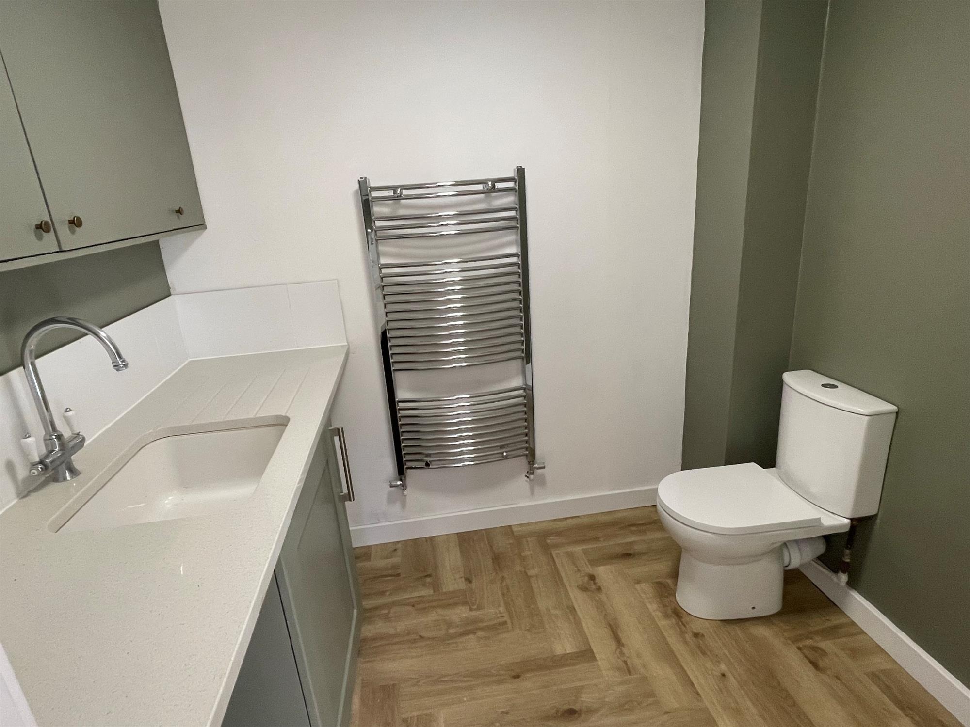 Low level WC. Wall and base units with work surface over and inset sink and mixer tap. Heated towel radiator.