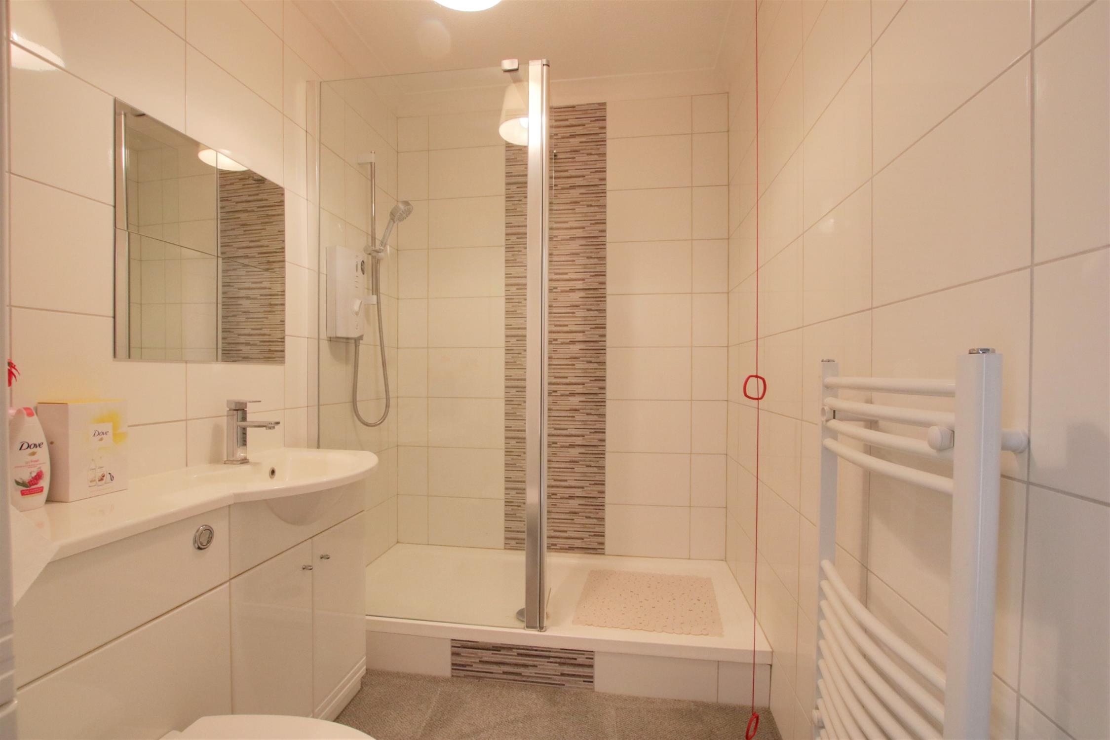 Double width walk in electric shower with glass screen. Sink with vanity unit. Low level w.c. Heated towel rail.
