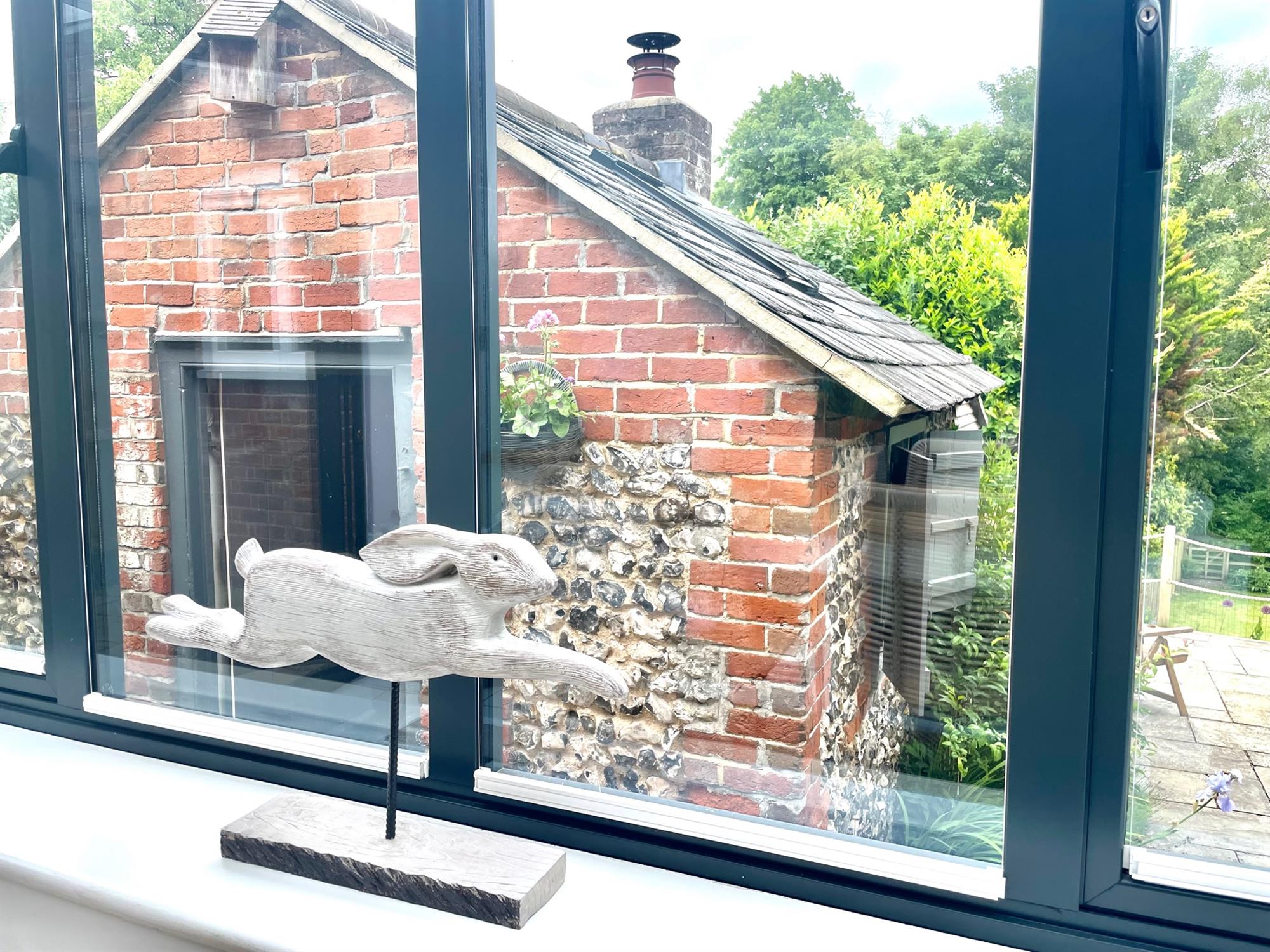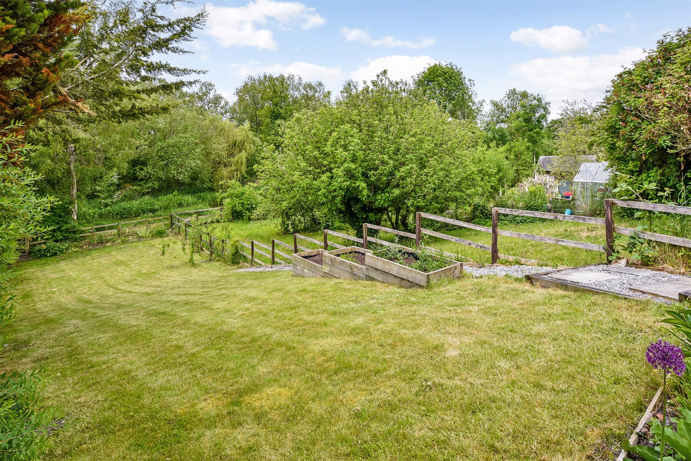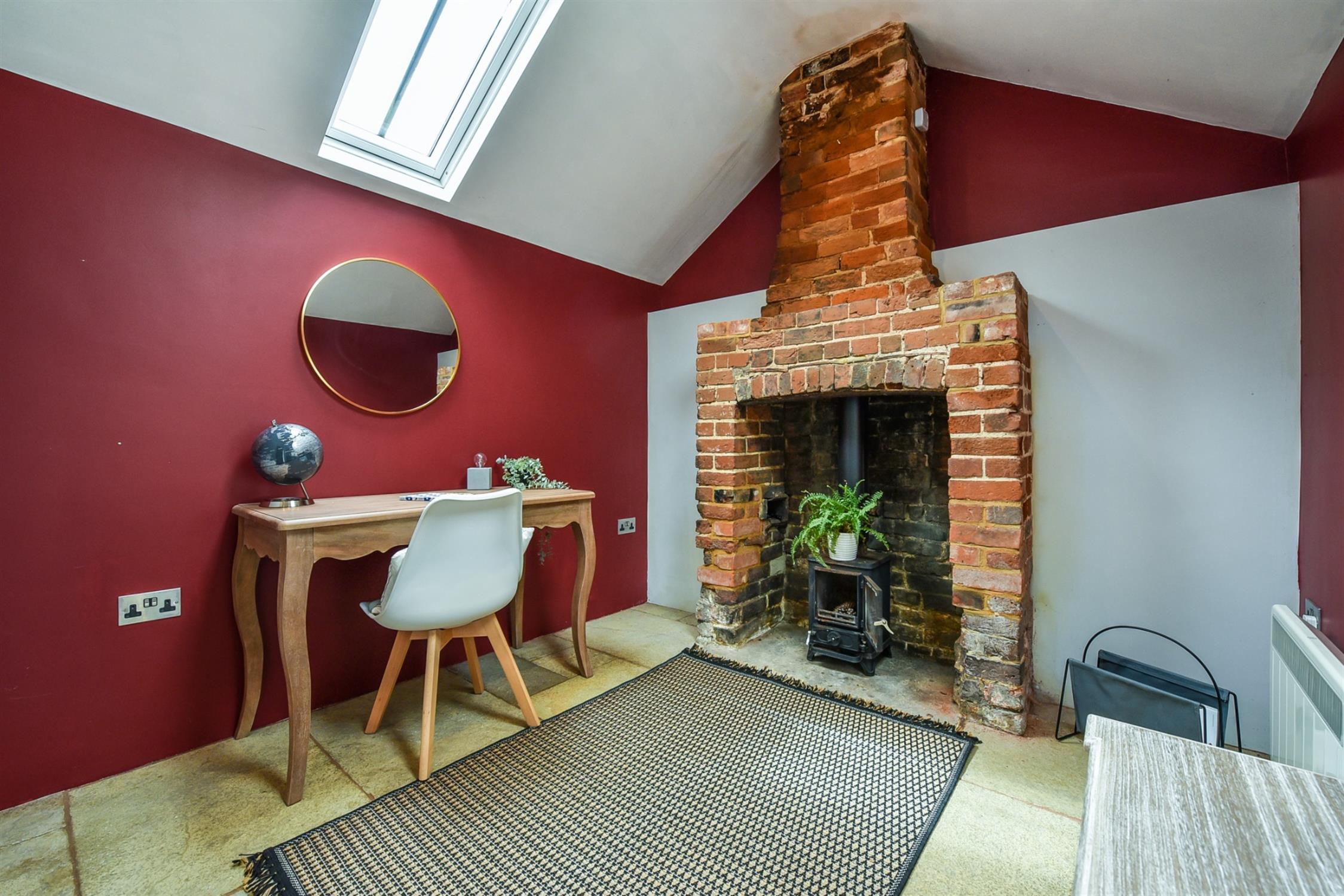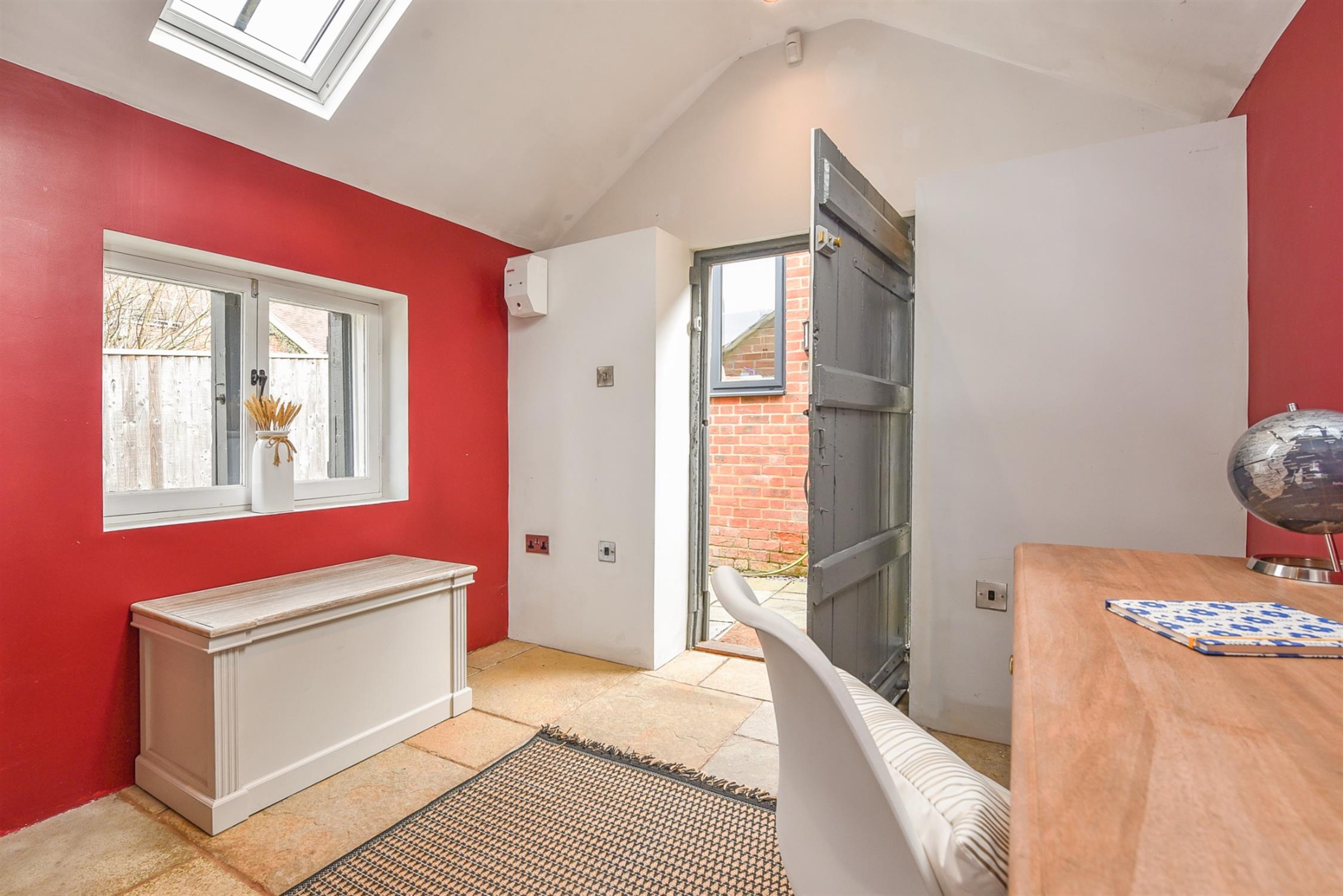 Outside, there is a brick and flint outbuilding which has been converted into a useful study with a cathedral pitch roof and a wood burner. There is a log store behind this garden office. The garden is an impressive size. There is a spacious alfresco dining area directly outside the social kitchen. The well-kept lawn sweeps down to the river which is accessed by a wooden gate and there are also raised beds.