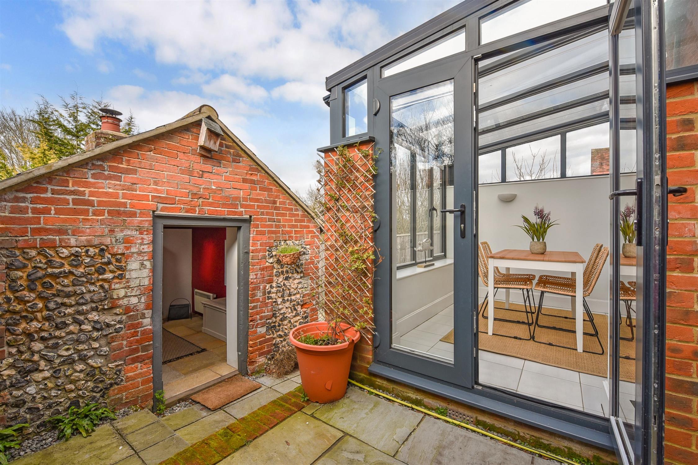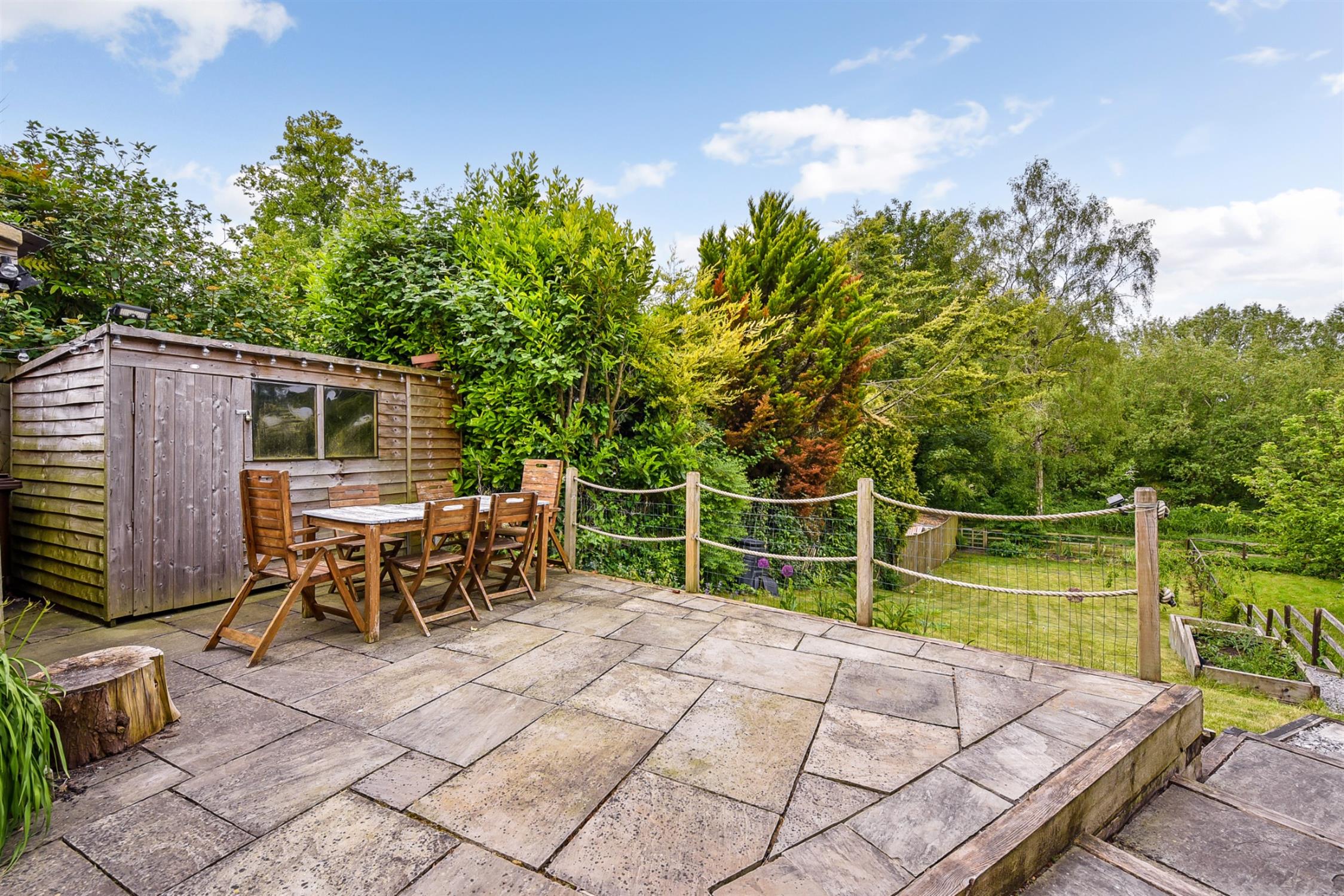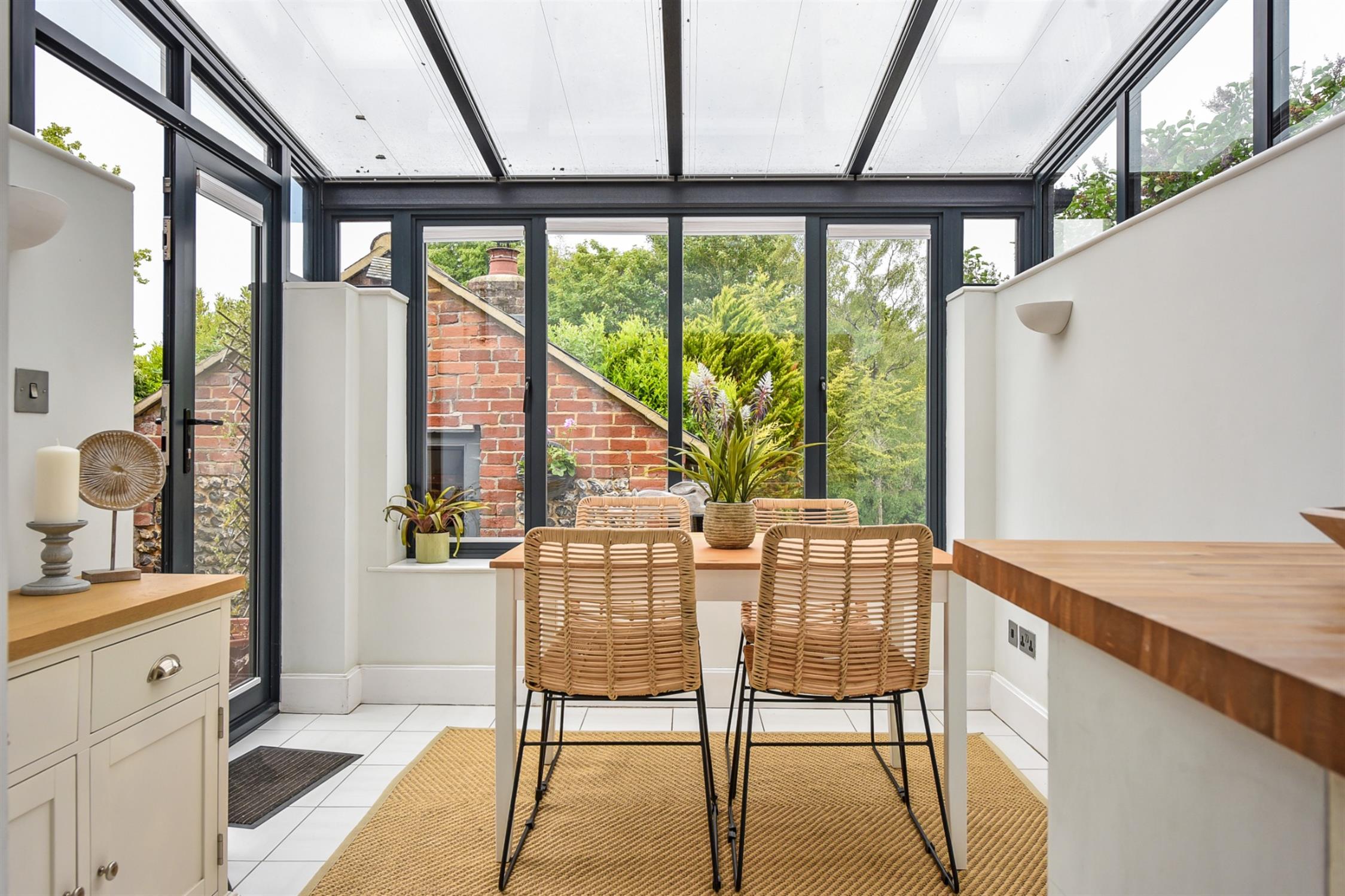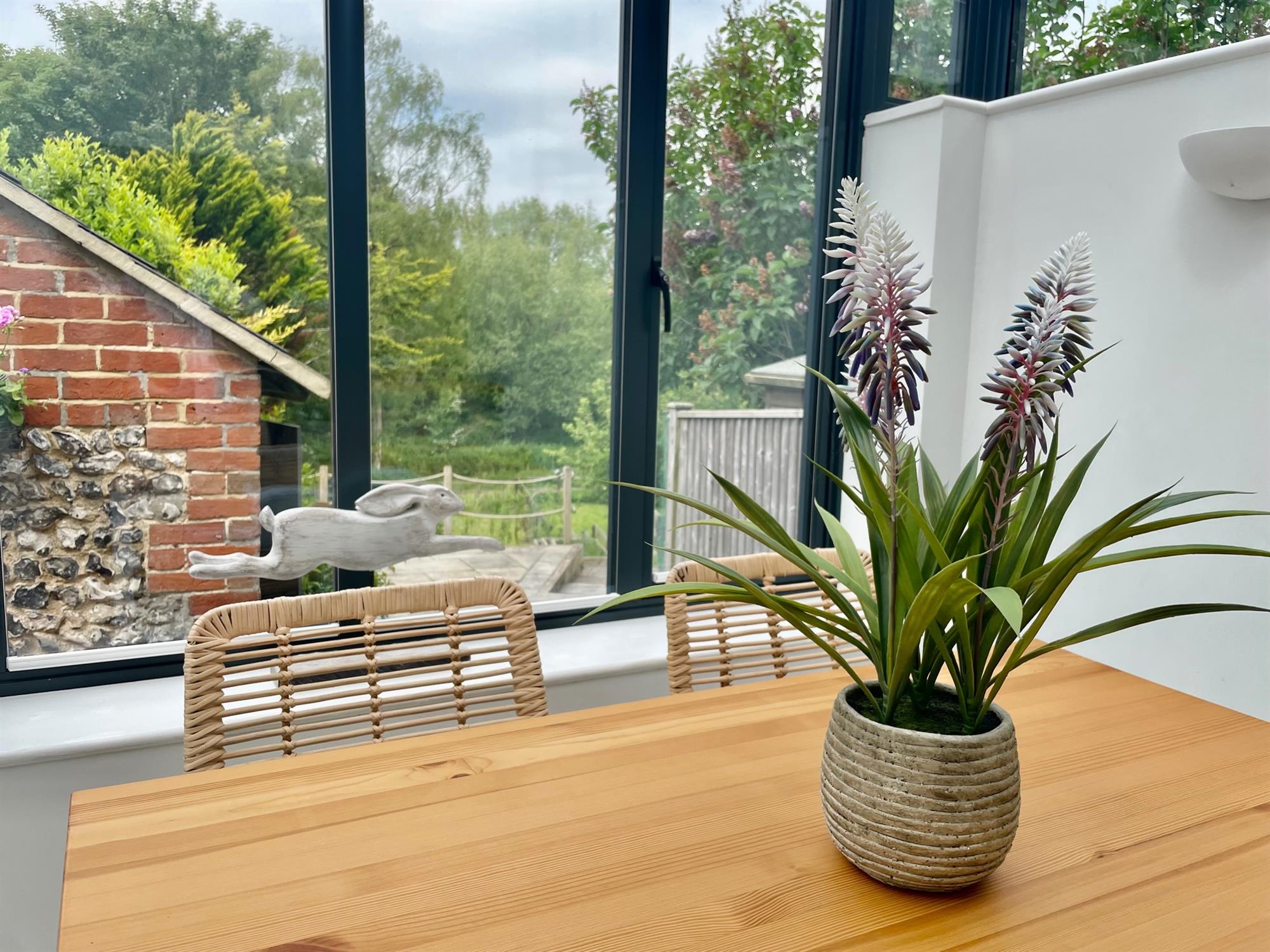 Outside, there is a brick and flint outbuilding which has been converted into a useful study with a cathedral pitch roof and a wood burner. There is a log store behind this garden office. The garden is an impressive size. There is a spacious alfresco dining area directly outside the social kitchen. The well-kept lawn sweeps down to the river which is accessed by a wooden gate and there are also raised beds.