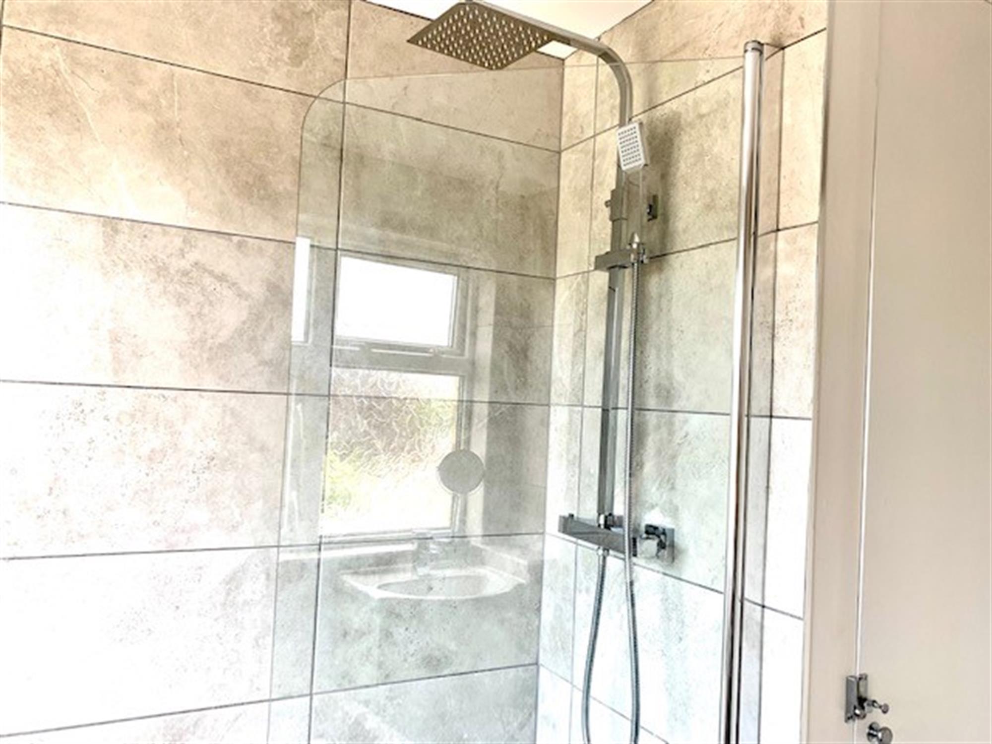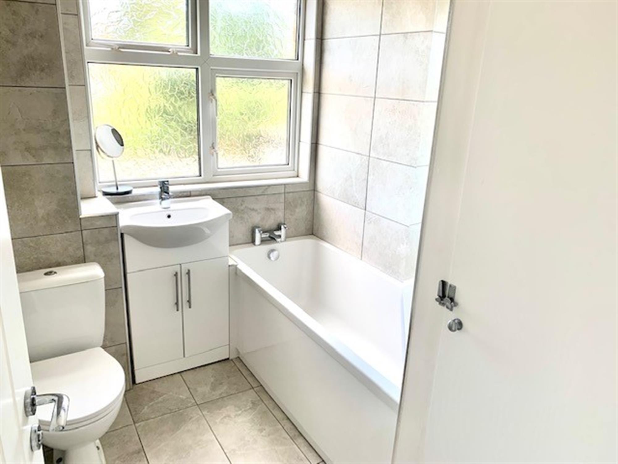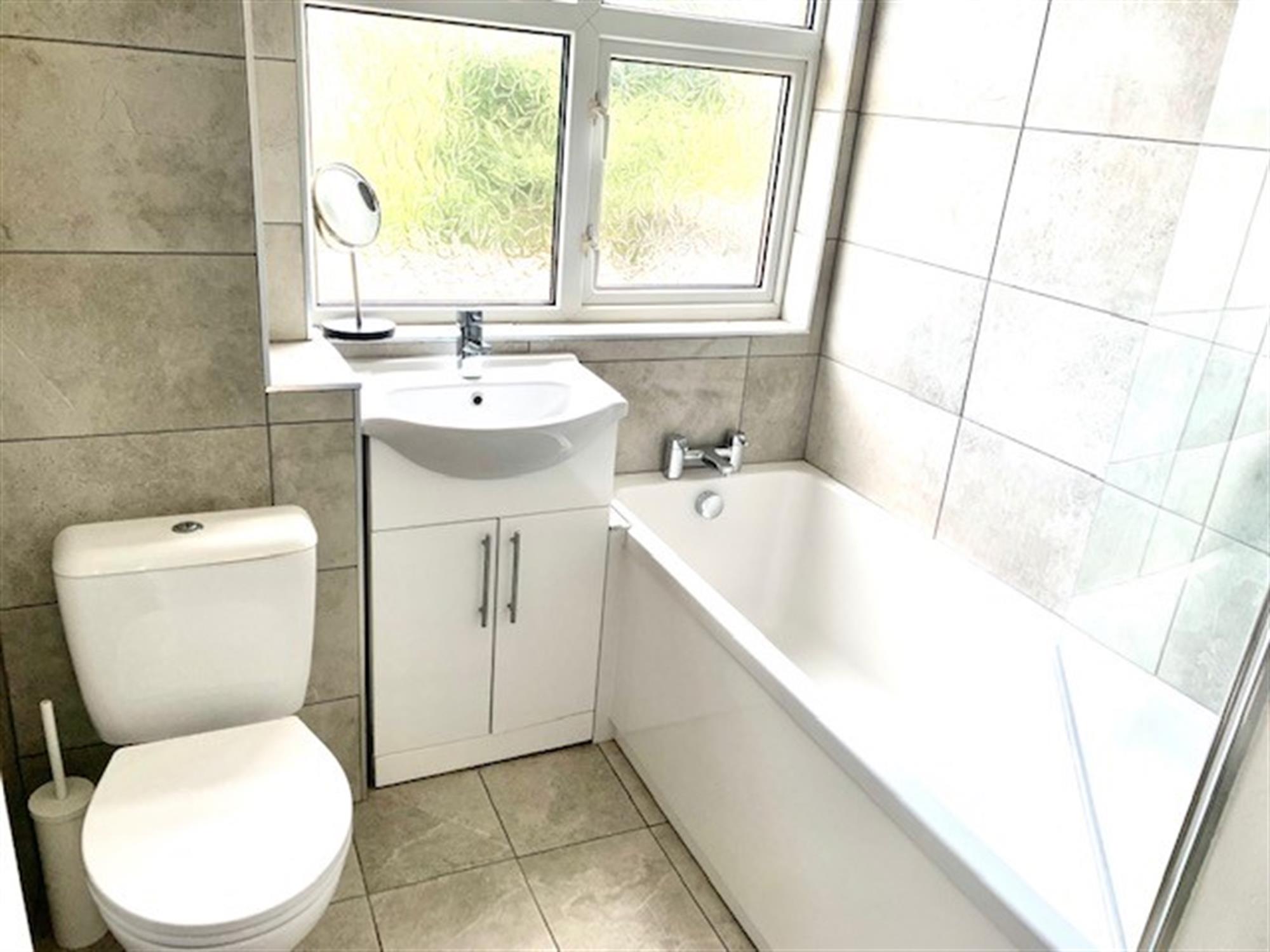 BATHROOM - Modern fitted bathroom with w.c., sink with vanity below and bath with shower over. Cupboard off.