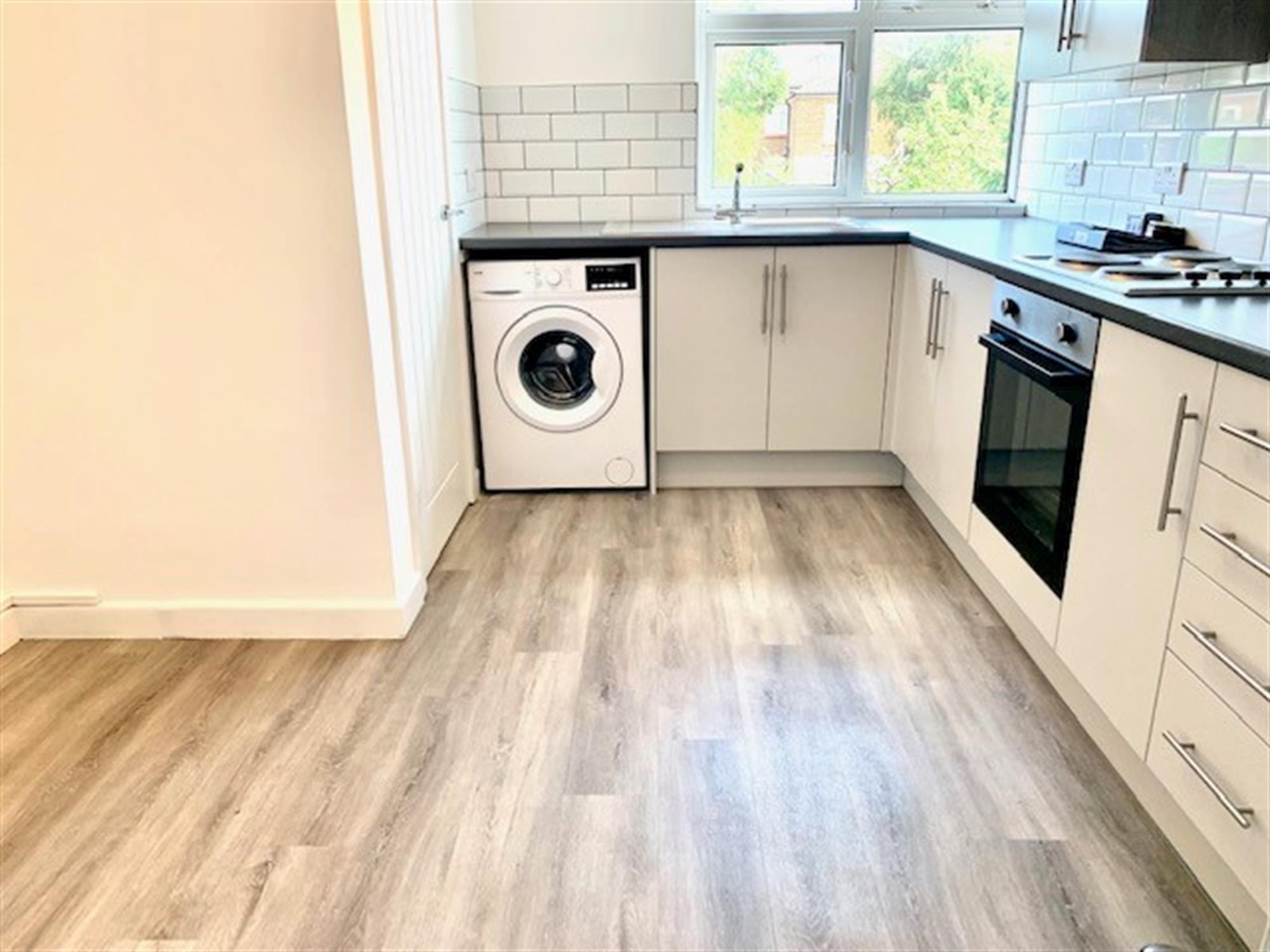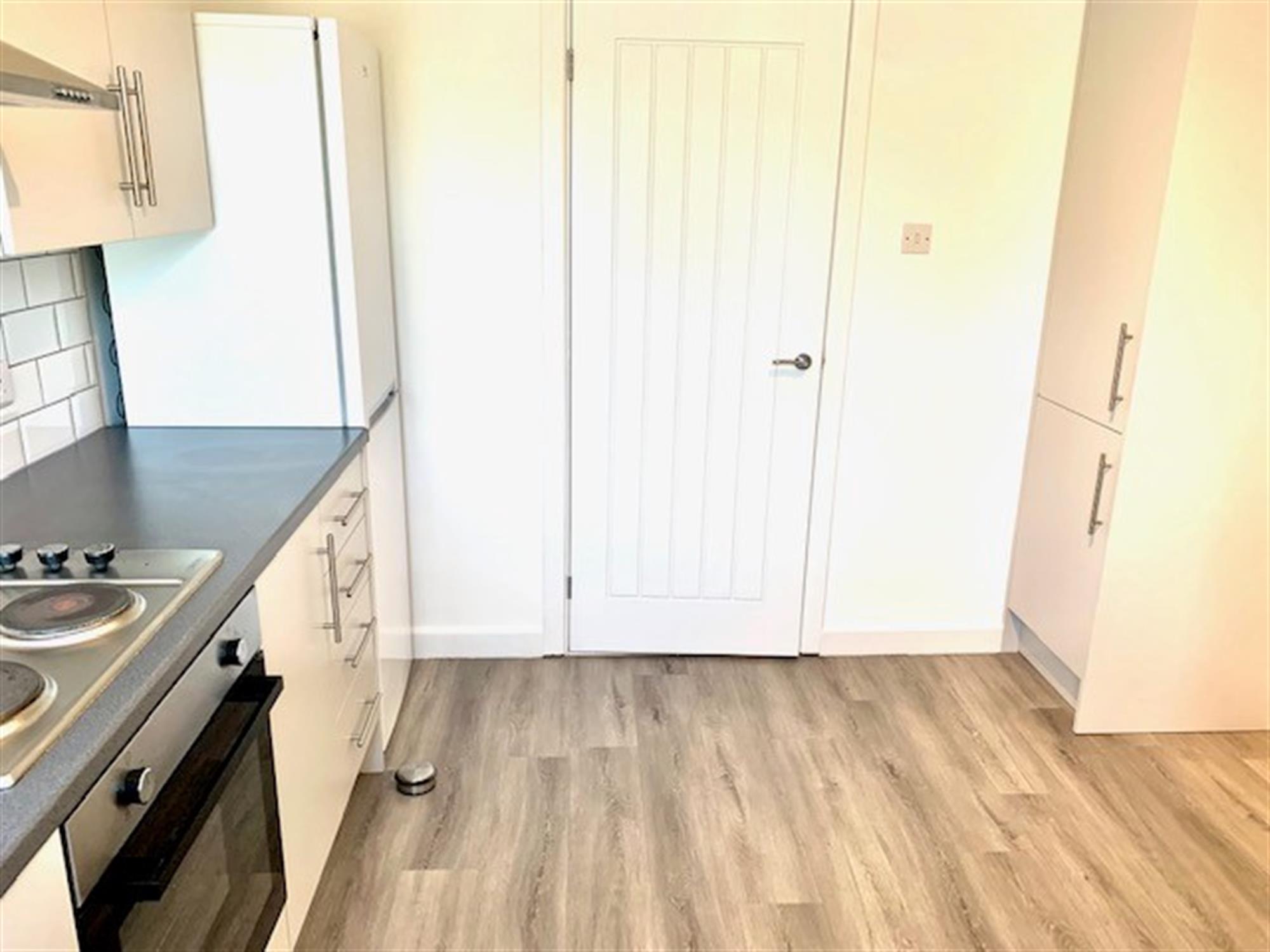 KITCHEN - Modern fitted kitchen with various wall and base units. Appliances comprise: washing machine, fridge/freezer, electric hob and electric oven. Cupboard off.