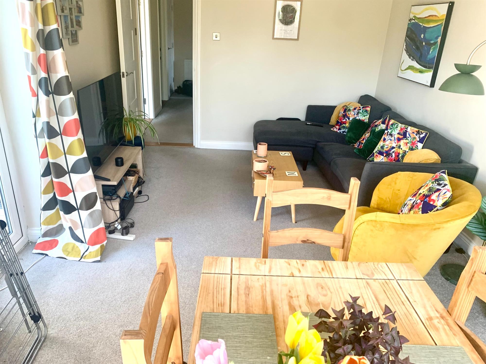 Carpeted flooring with doors to all rooms. Cupboard off.