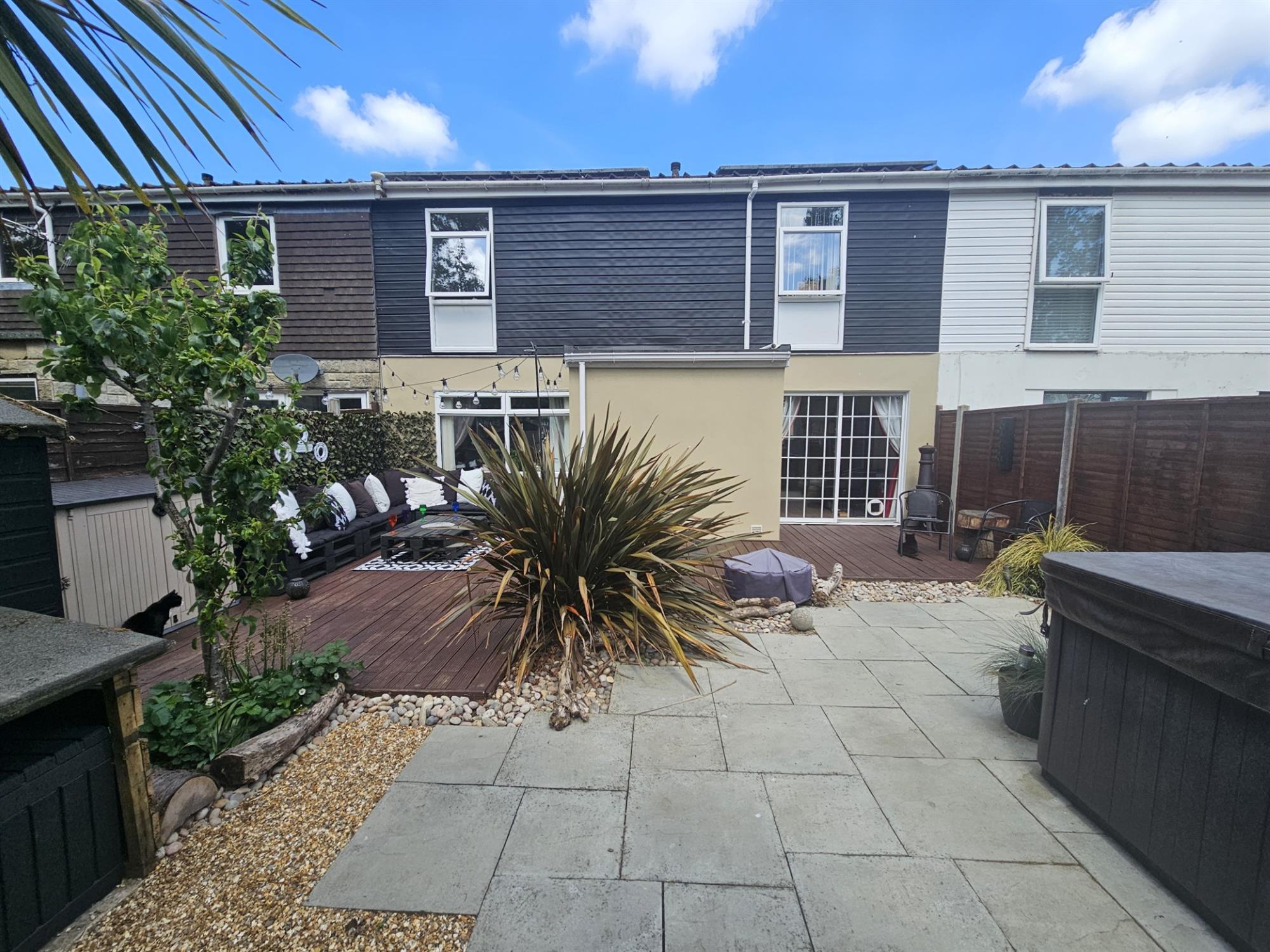 An attractive, private and low-maintenance space, raised decking/seating area, patio with raised borders, rear pedestrian access, outside power and tap, wooden shed, enclosed by fence.