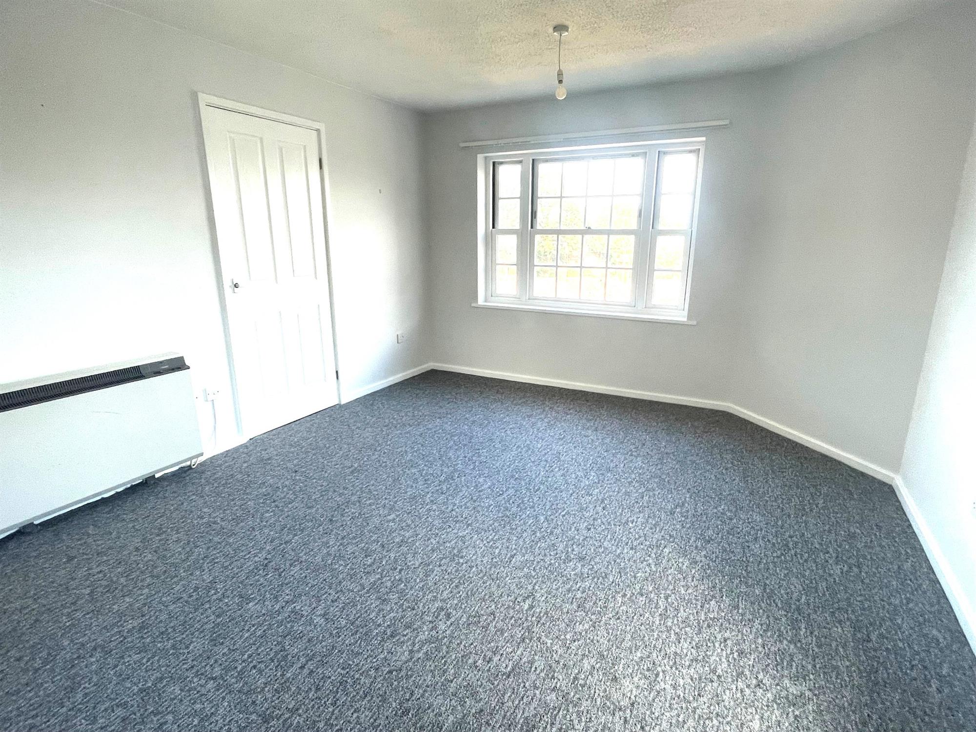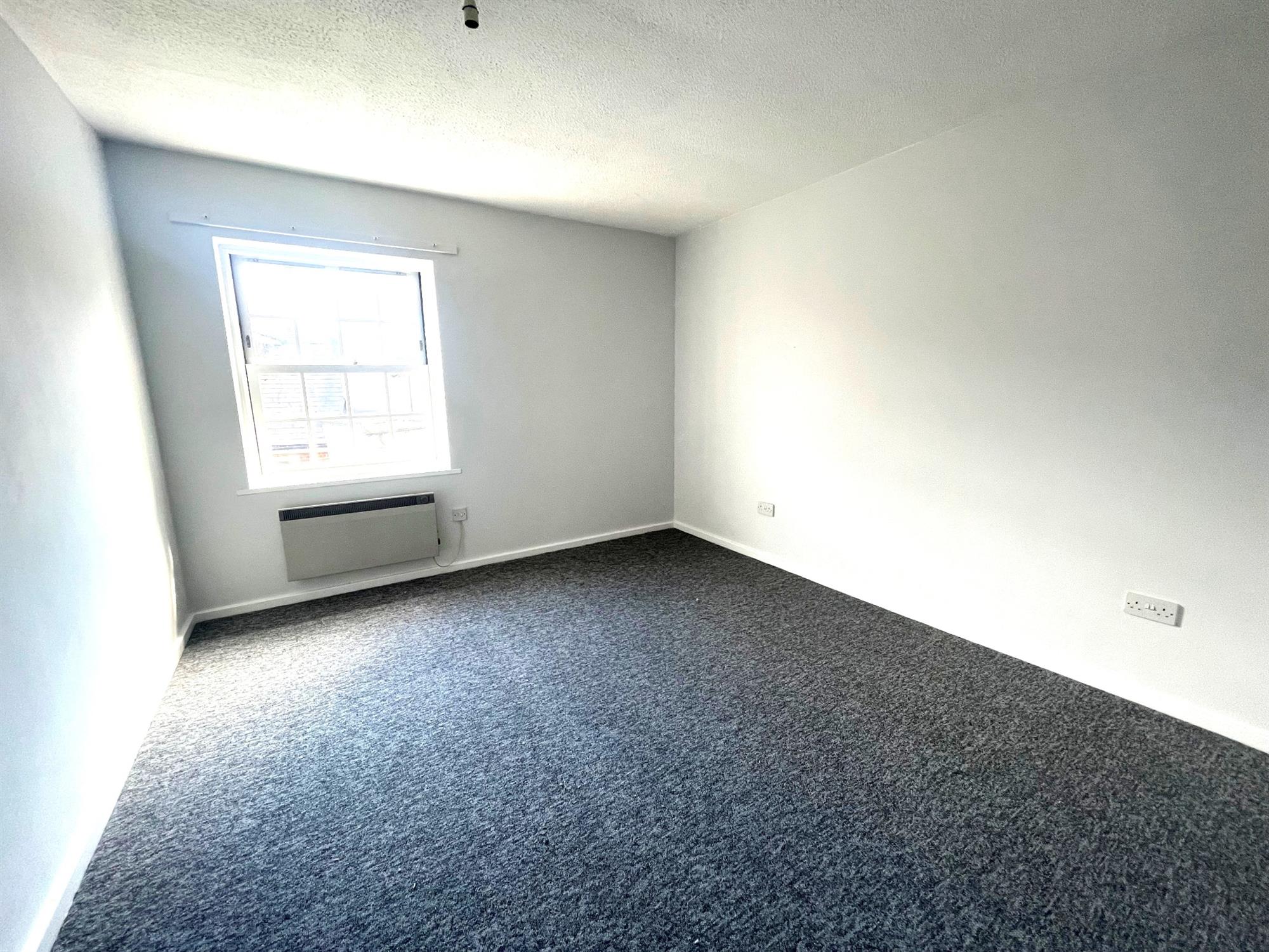 Double bedroom with window to side and grey fitted carpet.