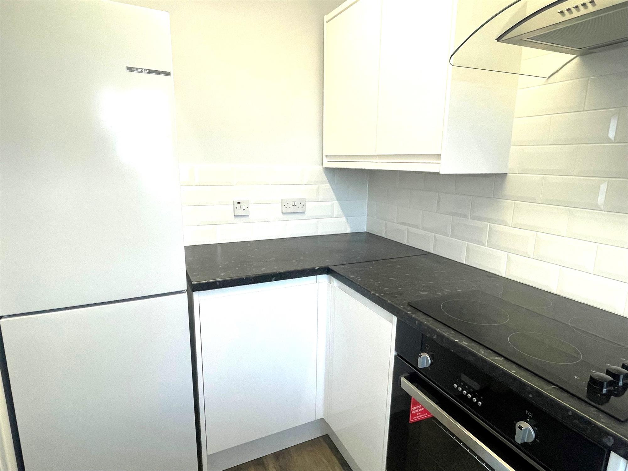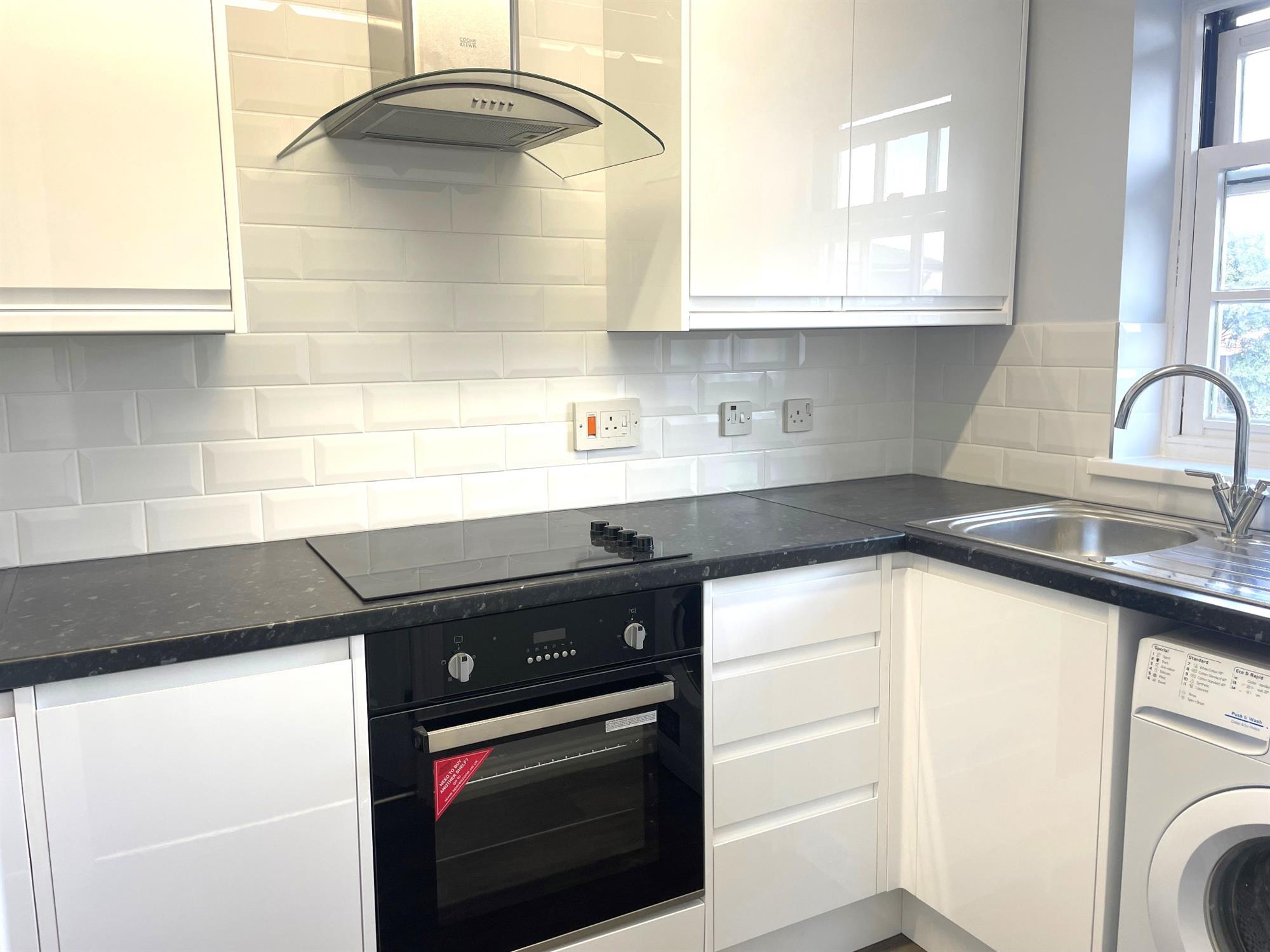 White gloss wall and base units with appliances consisting of: Fridge/freezer, washing machine, electric cooker and electric hob. Window to front.