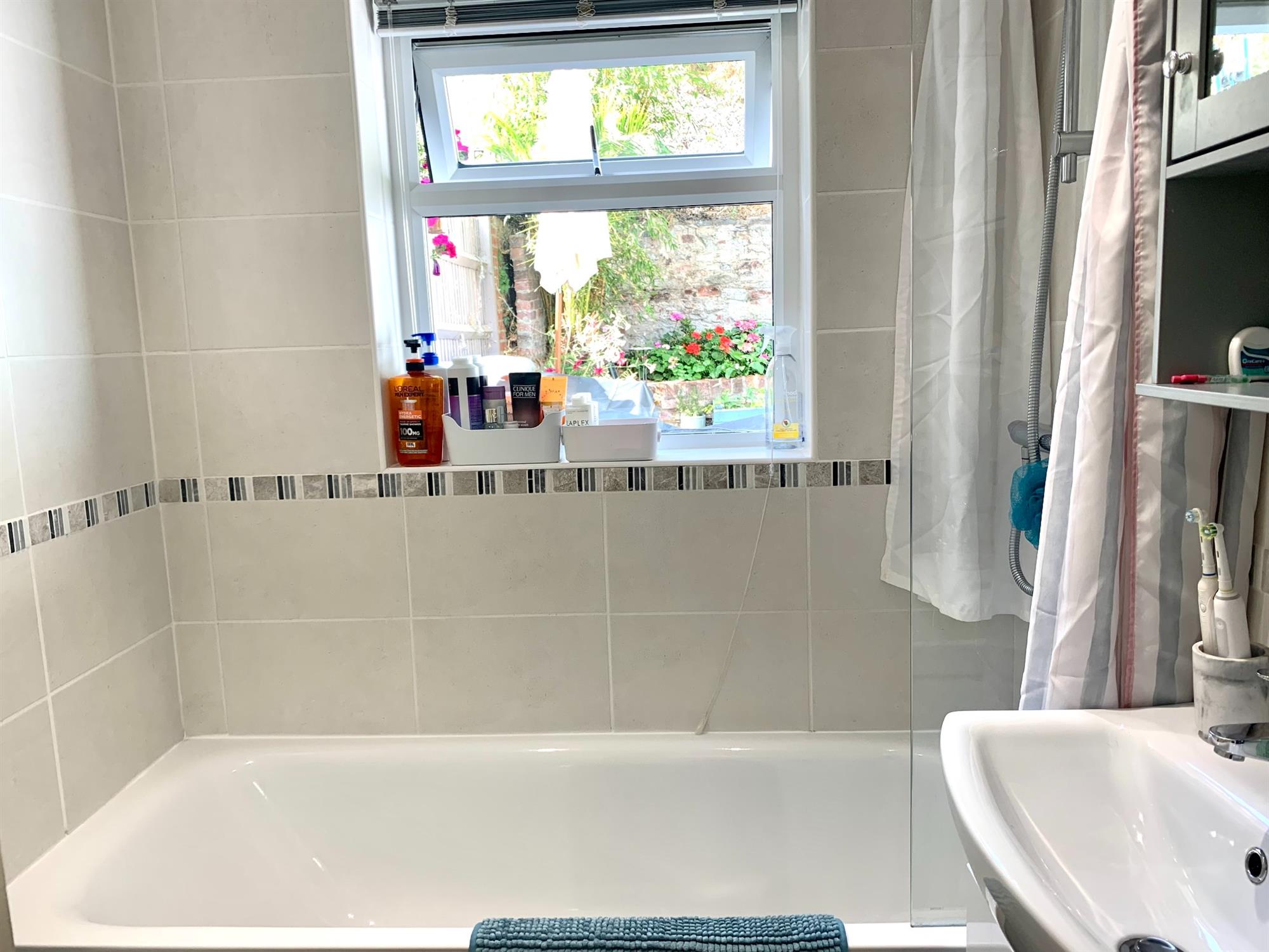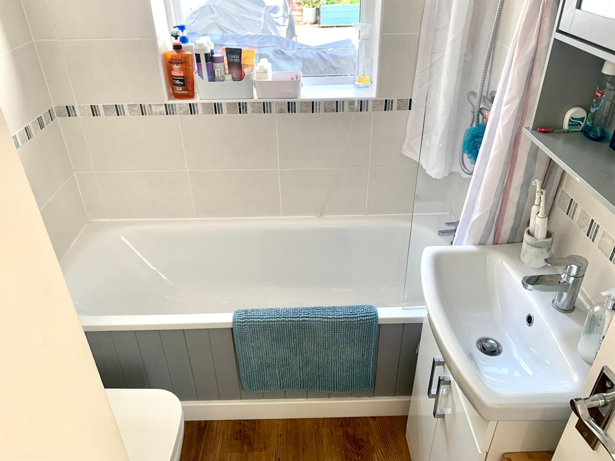 BATHROOM: White suite bathroom with bath with shower over, sink inset into vanity cupboard and toilet. Window to the rear