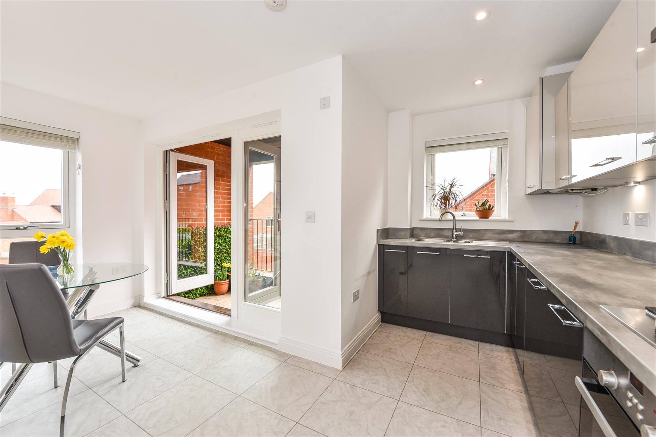 The kitchen is contemporary and fully fitted, with integrated fridge-freezer, dishwasher and washing machine. The double aspect room alsbenefits from a balcony and far-reaching views of surrounding countryside.
