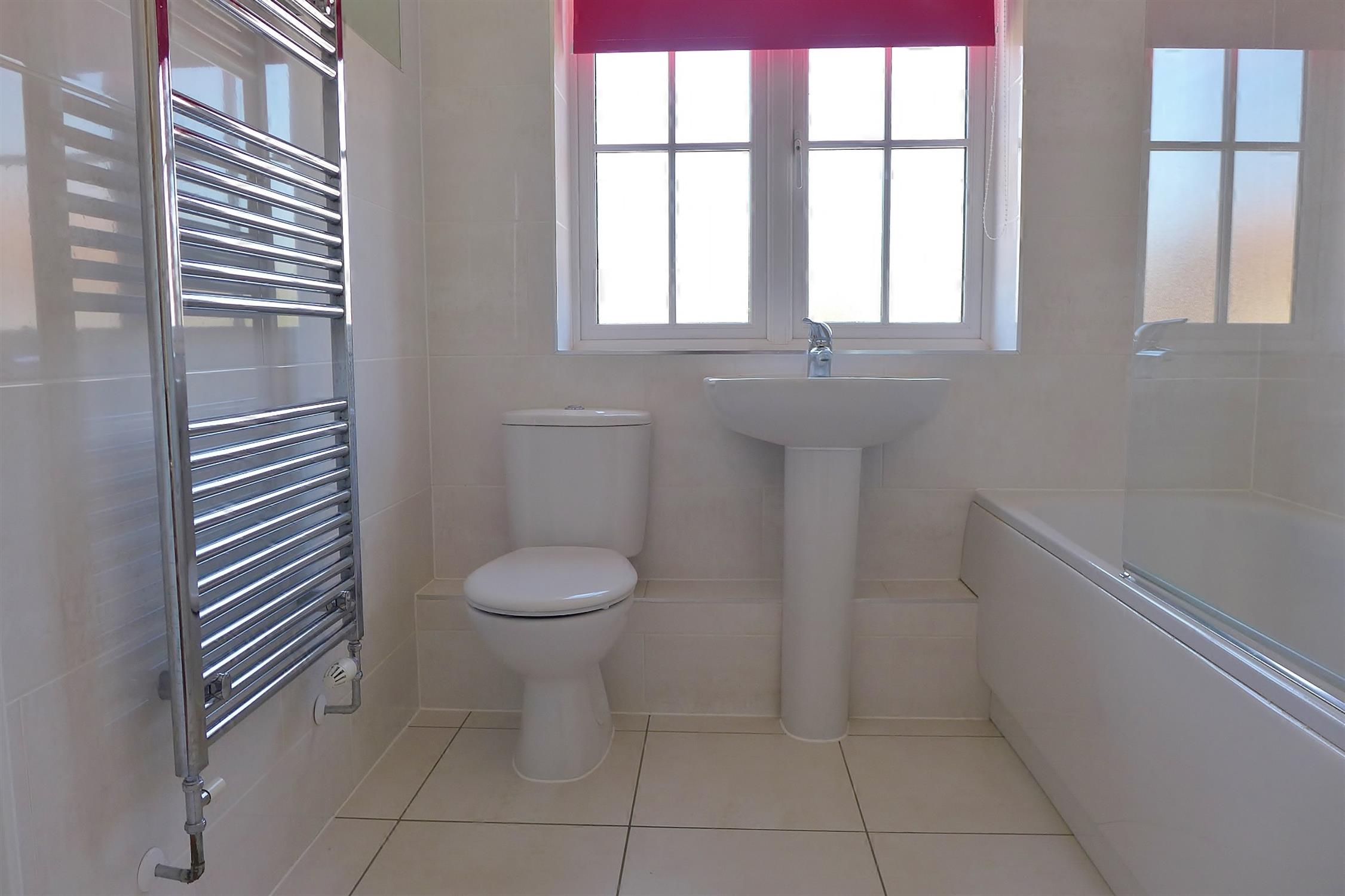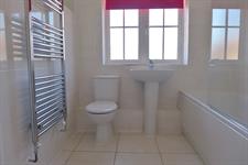 BATHROOM: White suite comprising WC, wash hand basin, heated towel rail and bath with shower over.