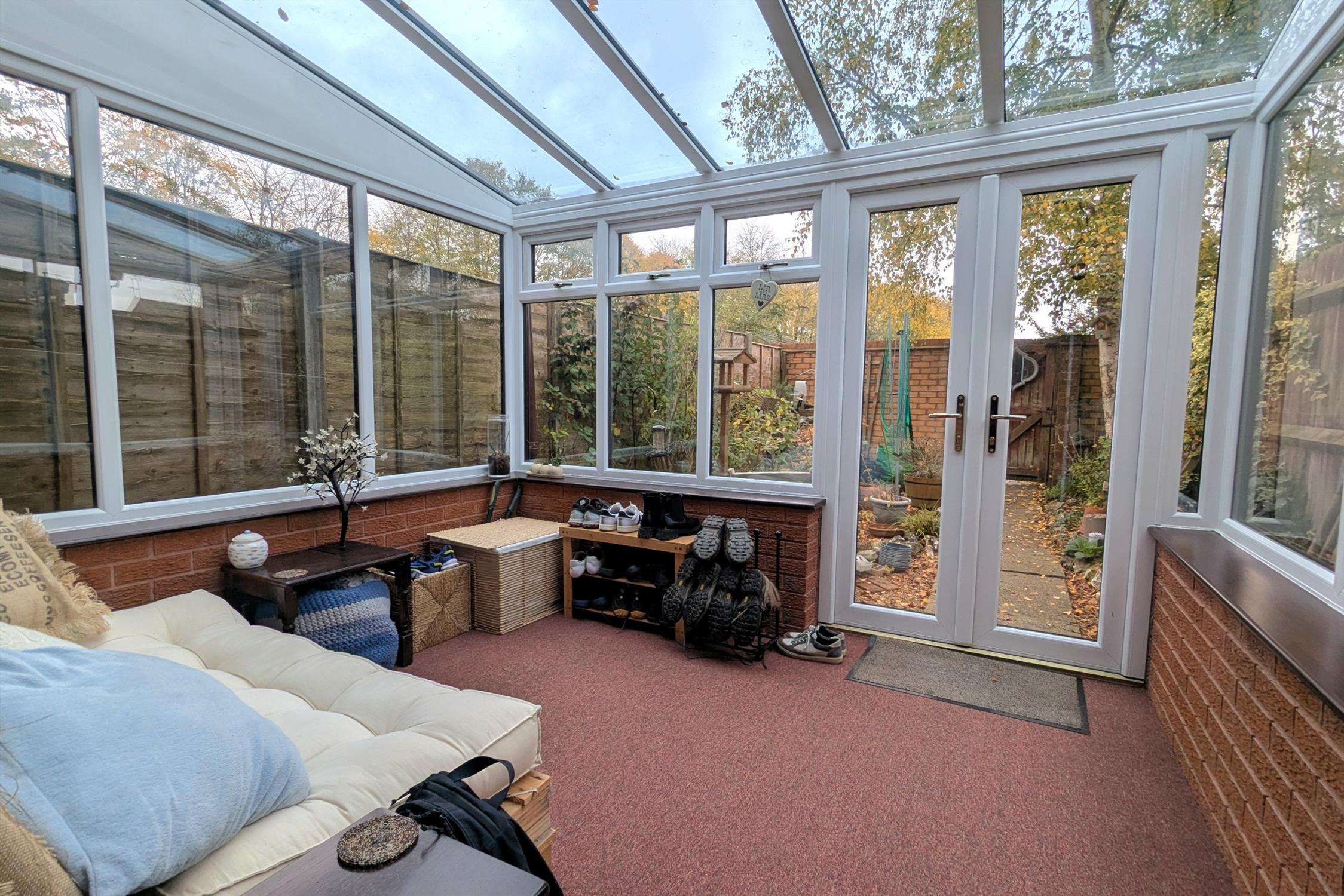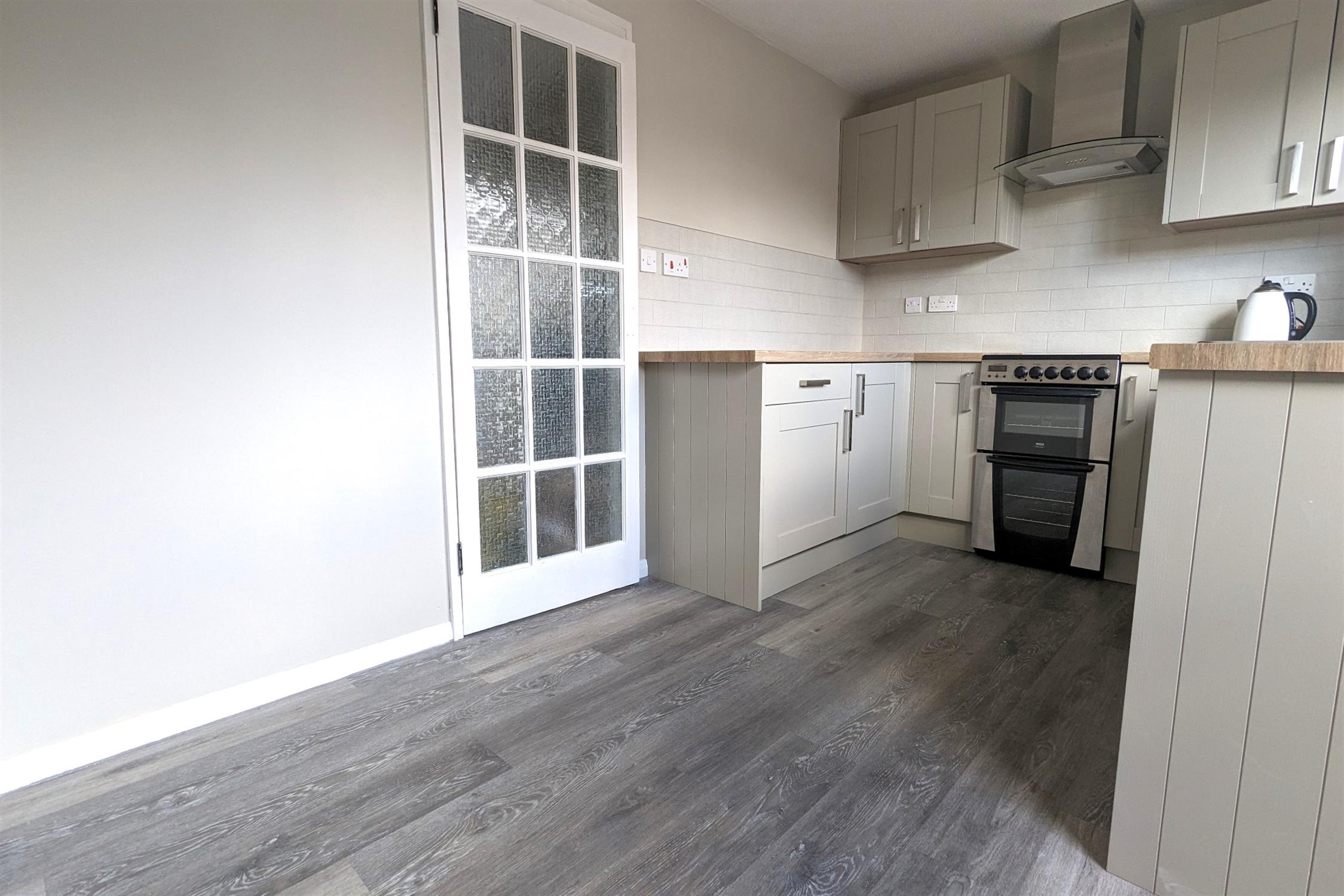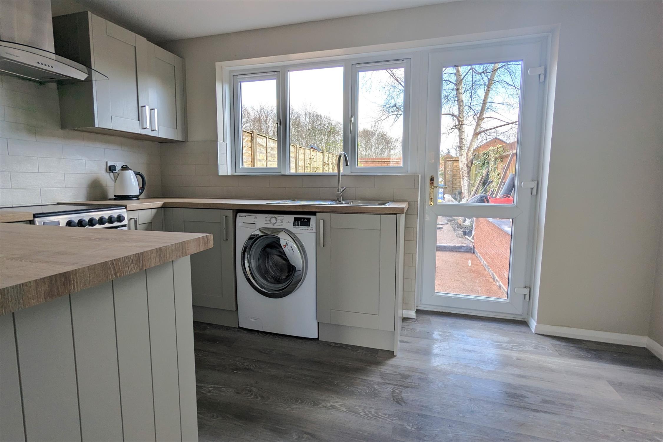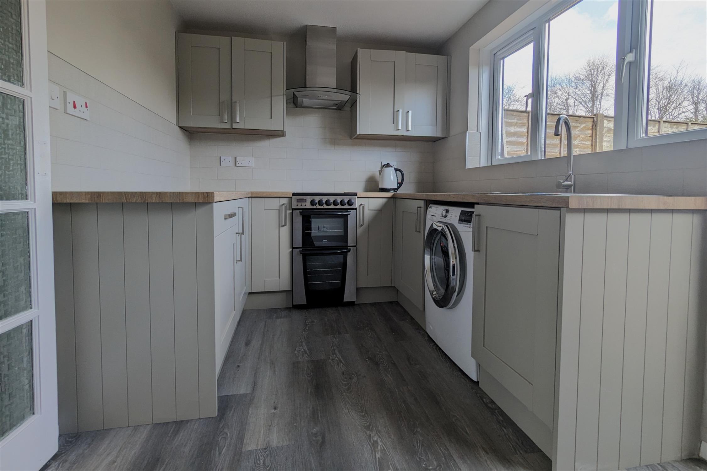 KITCHEN: Modern fitted range of eye and low level units with electric oven/hob and washing machine. Space for fridge freezer. Door to conservatory.