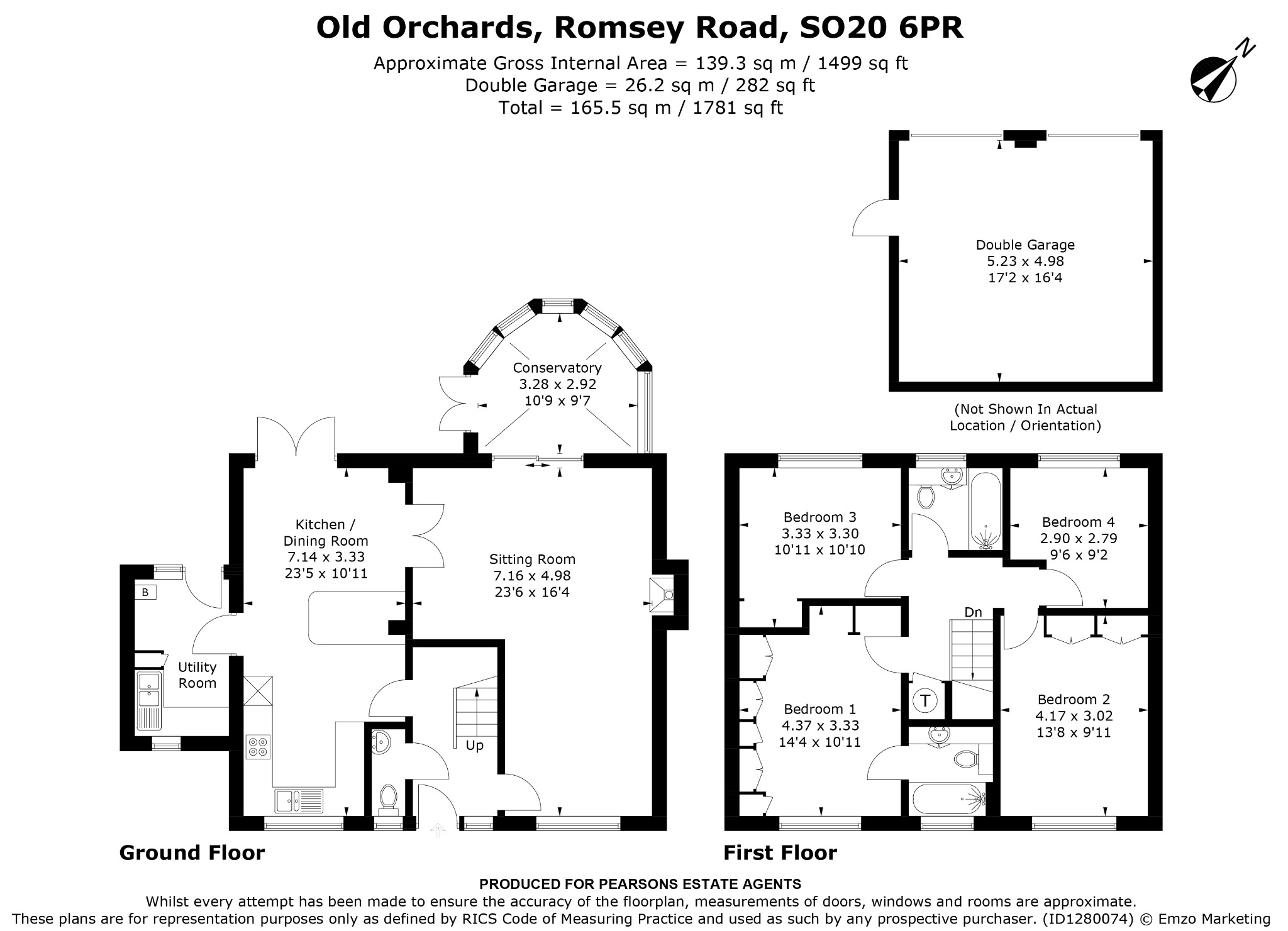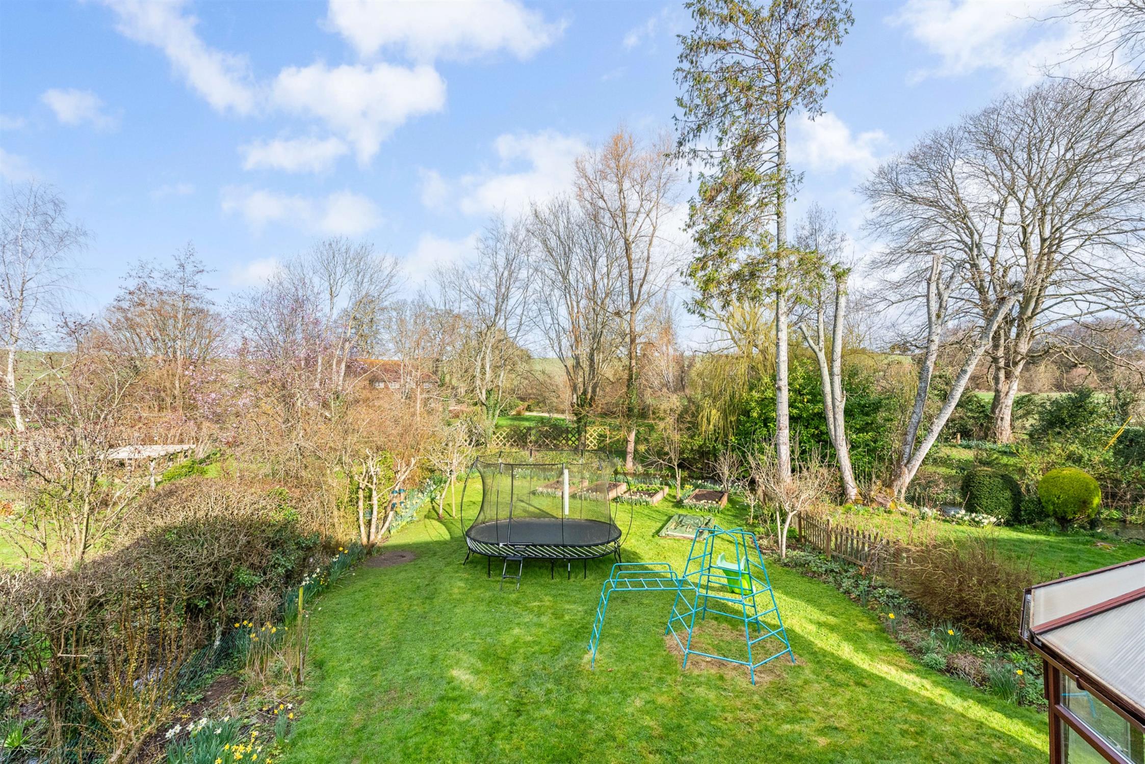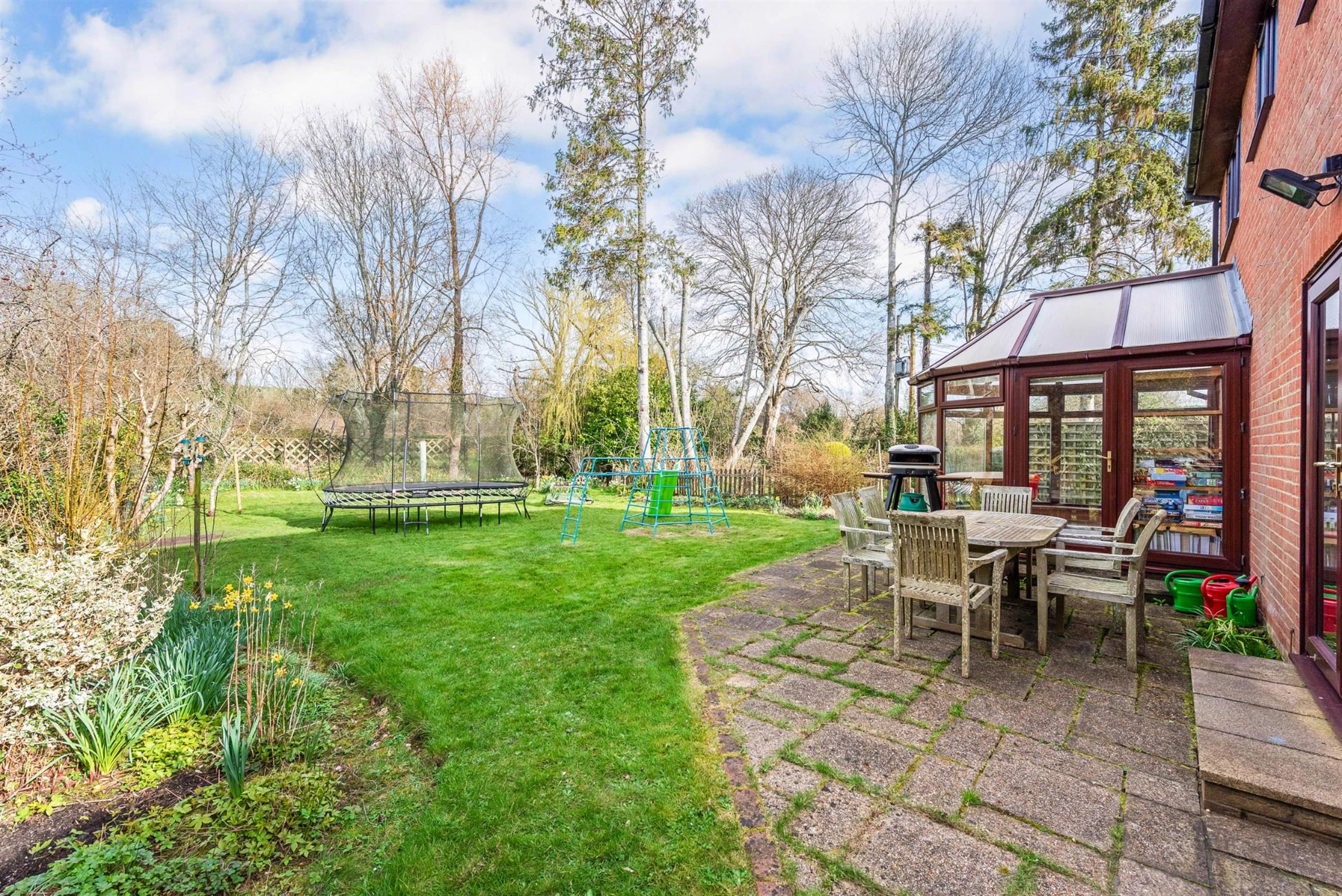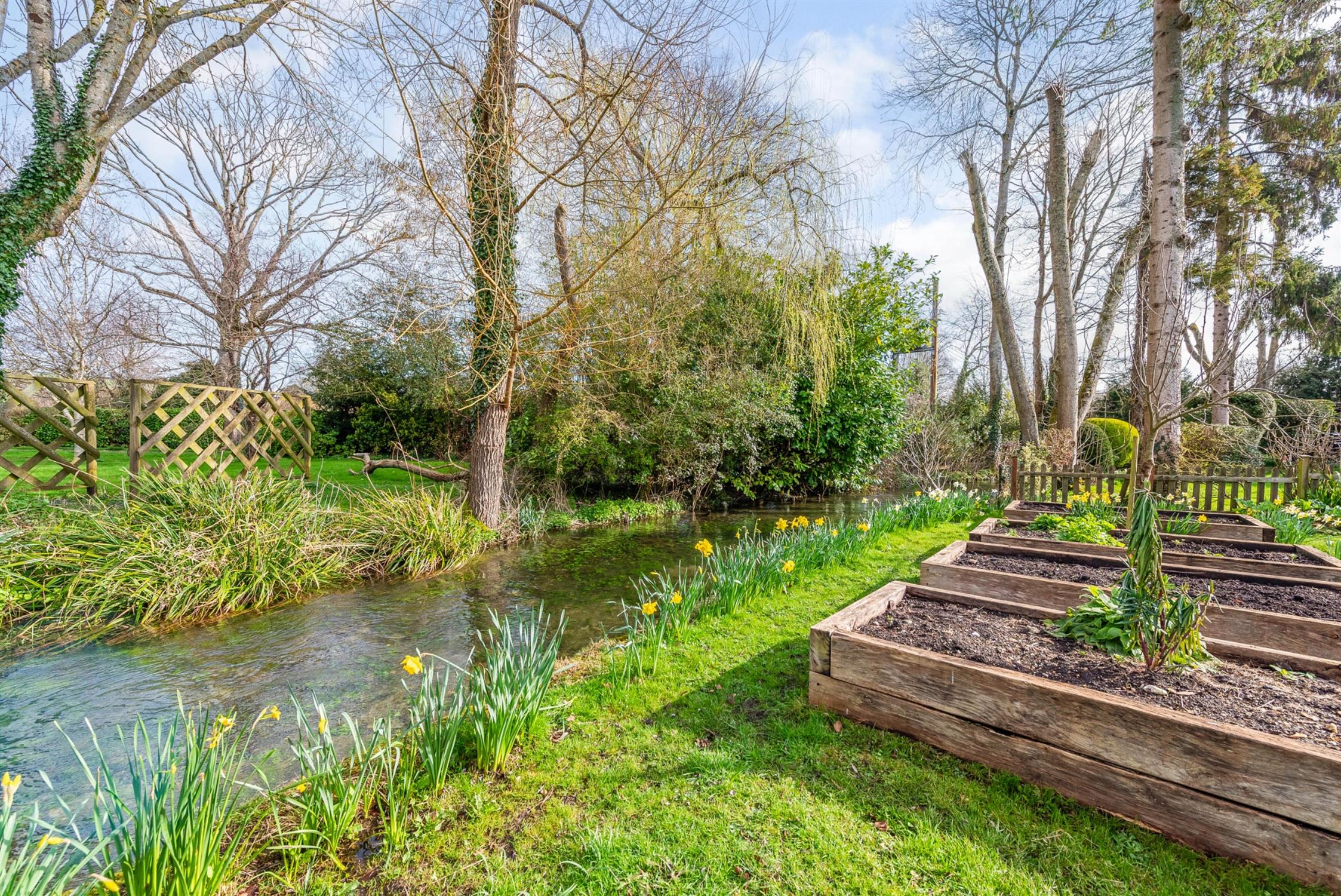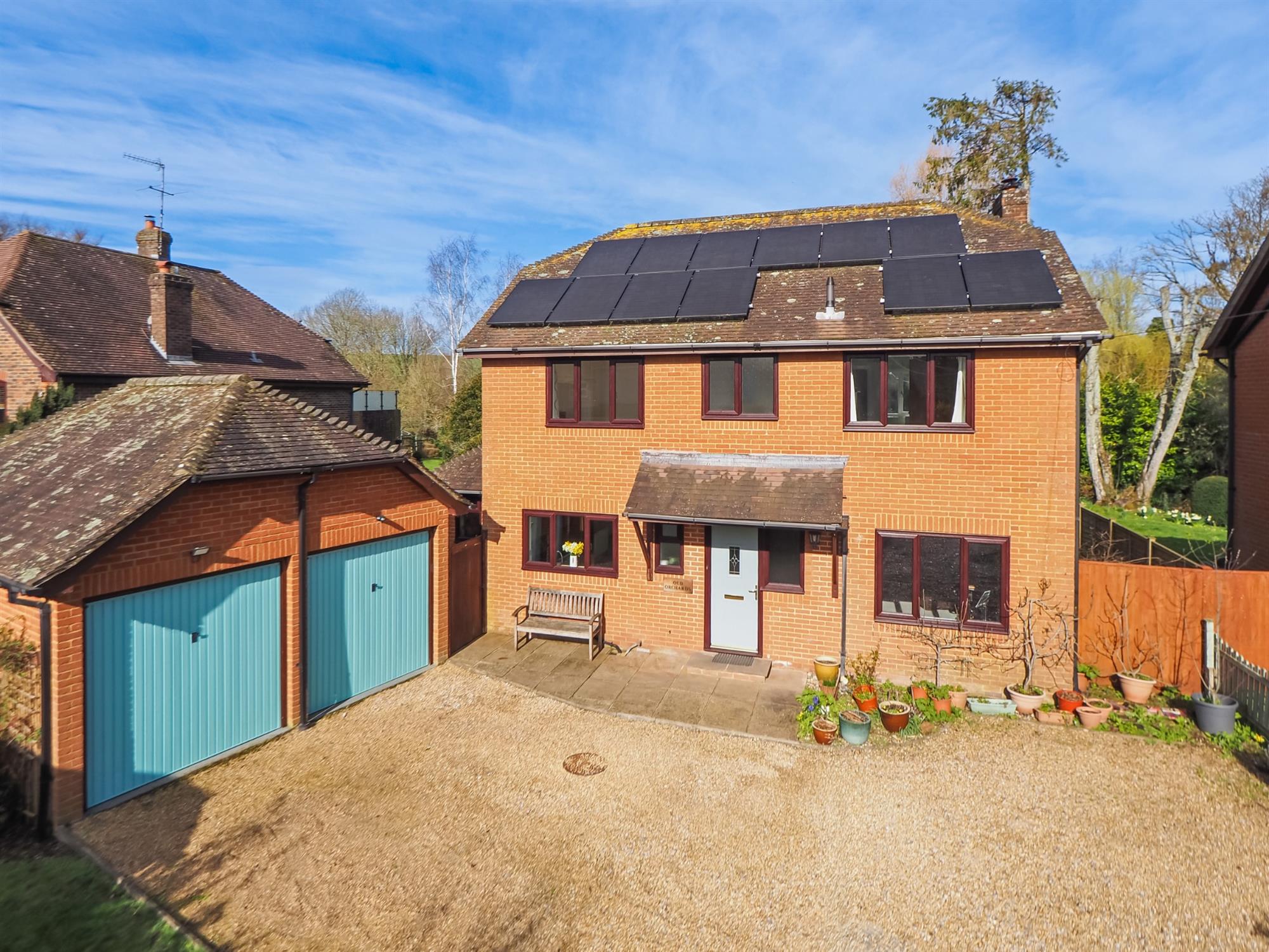 The property is approached from Romsey Road via a private shared drive leading to a gravel driveway providing parking for at least three to four cars in addition to the detached double garage which provides further parking and/or generous storage for bikes, garden equipment etc. The driveway is bordered by a lawned area with herbaceous borders containing flowers and mature shrubs. To the side of the property is access to the rear garden which is an absolute delight being mainly laid to lawn with well-stocked flower and shrub borders, patio terrace for barbecues and al-fresco dining, and raised vegetable beds. The garden falls away gently at the end to a tributary of the River Test which provides a stunning backdrop and an atmosphere of calmness and serenity.