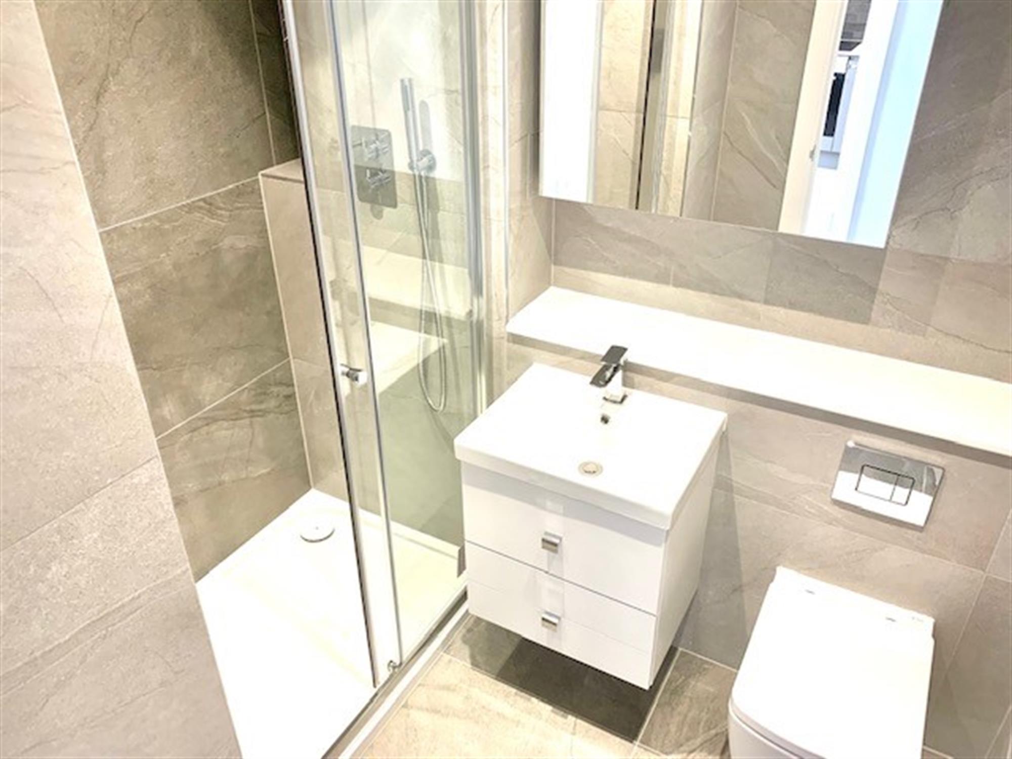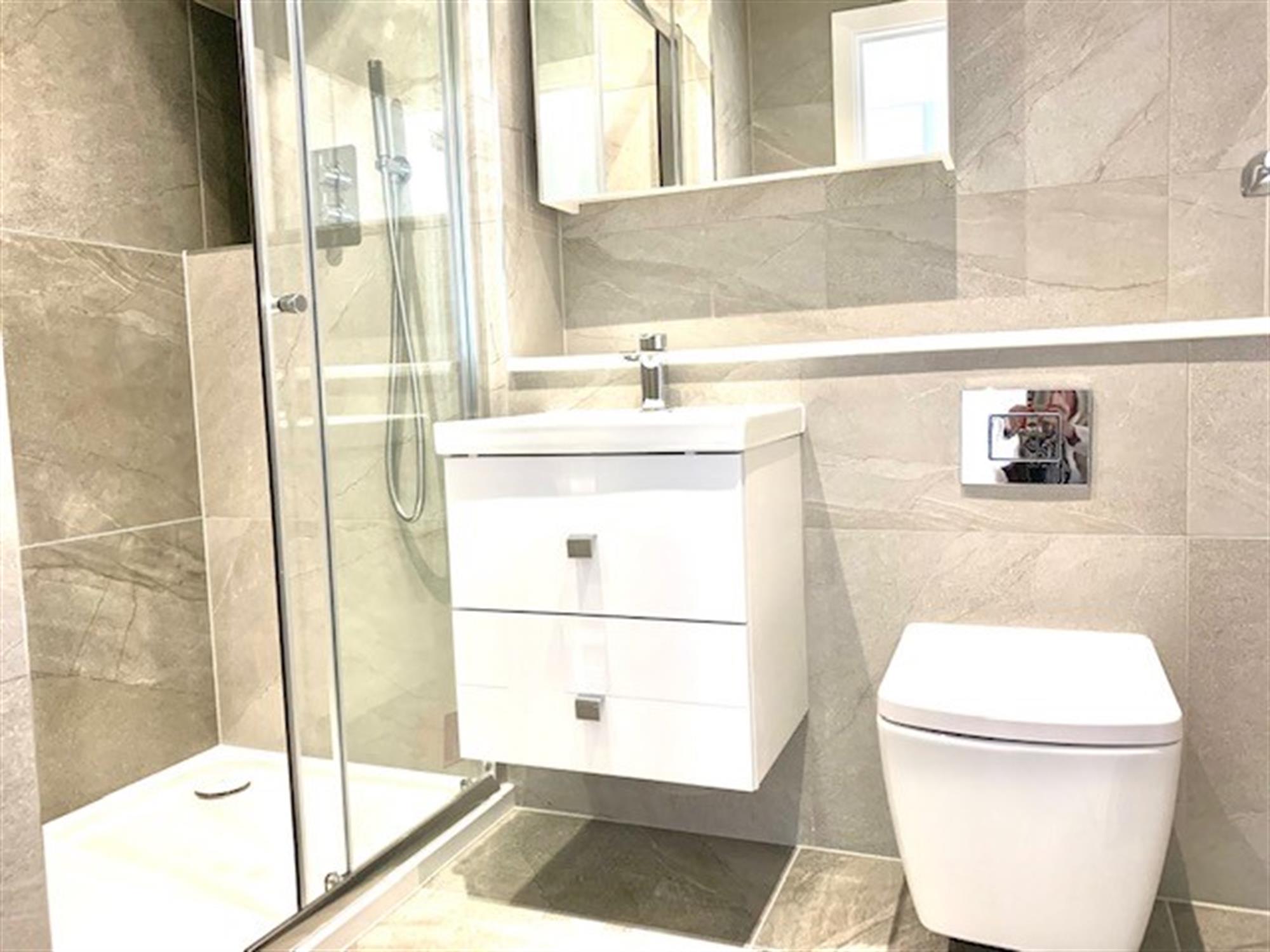 BATHROOM - White suite with shower cubicle, w.c and sink with vanity drawers below.