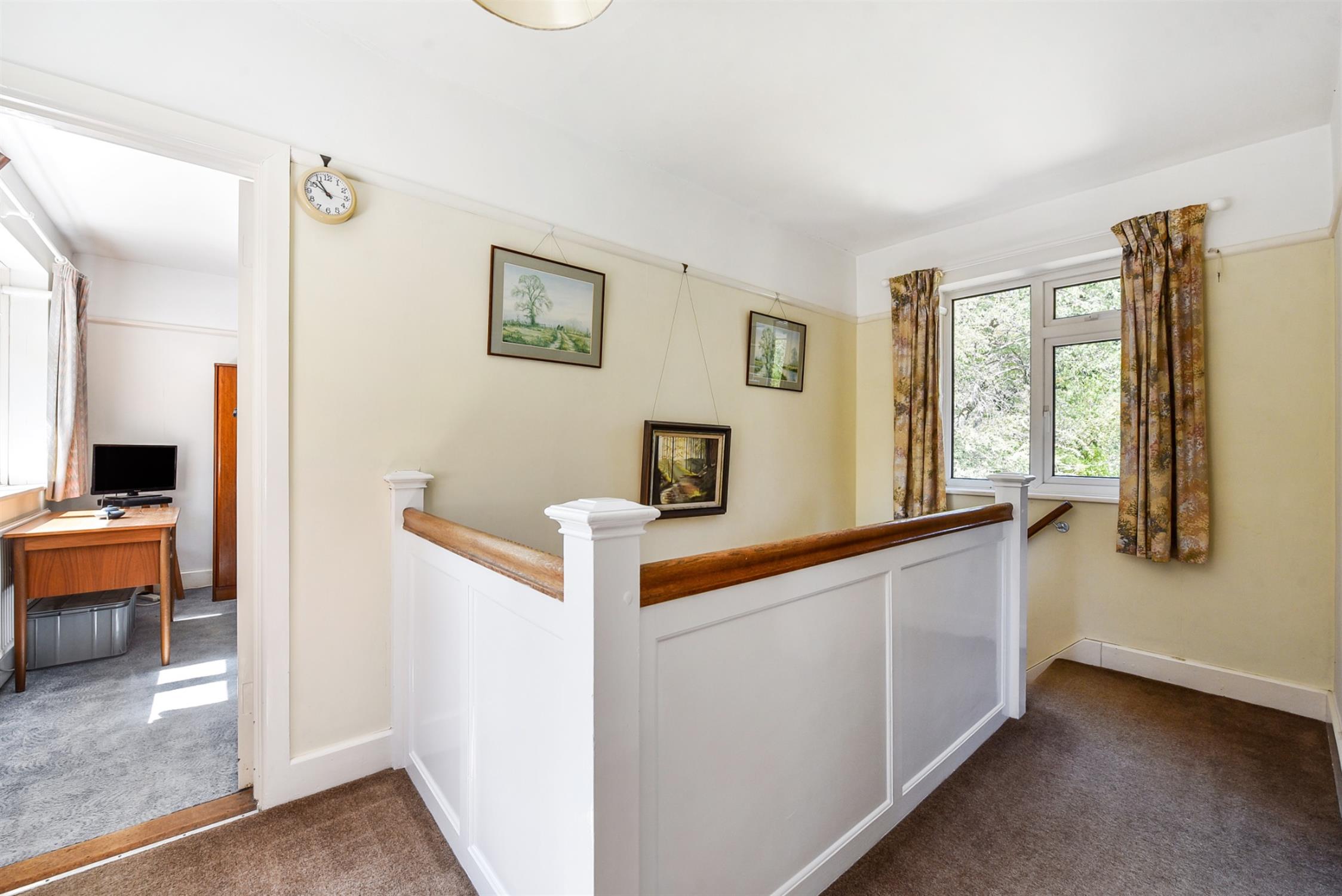 A lovely double-aspect gallery landing. Airing cupboard with immersion tank and hatch for access to the loft which is part boarded.