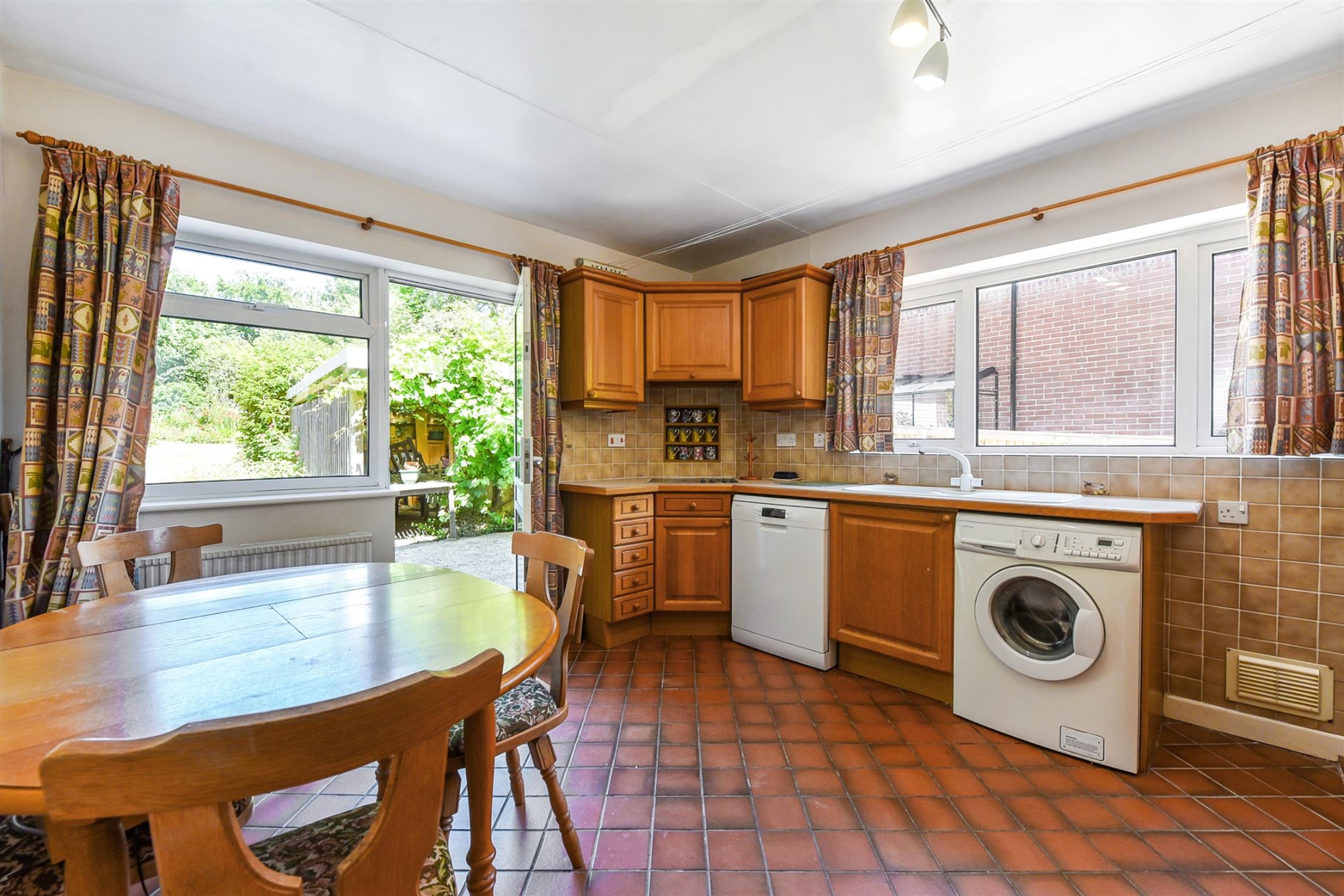 The warm and welcoming country kitchen has a range of solid wood storage units, electric, oven and space for utilities. Door to the patio and garden.