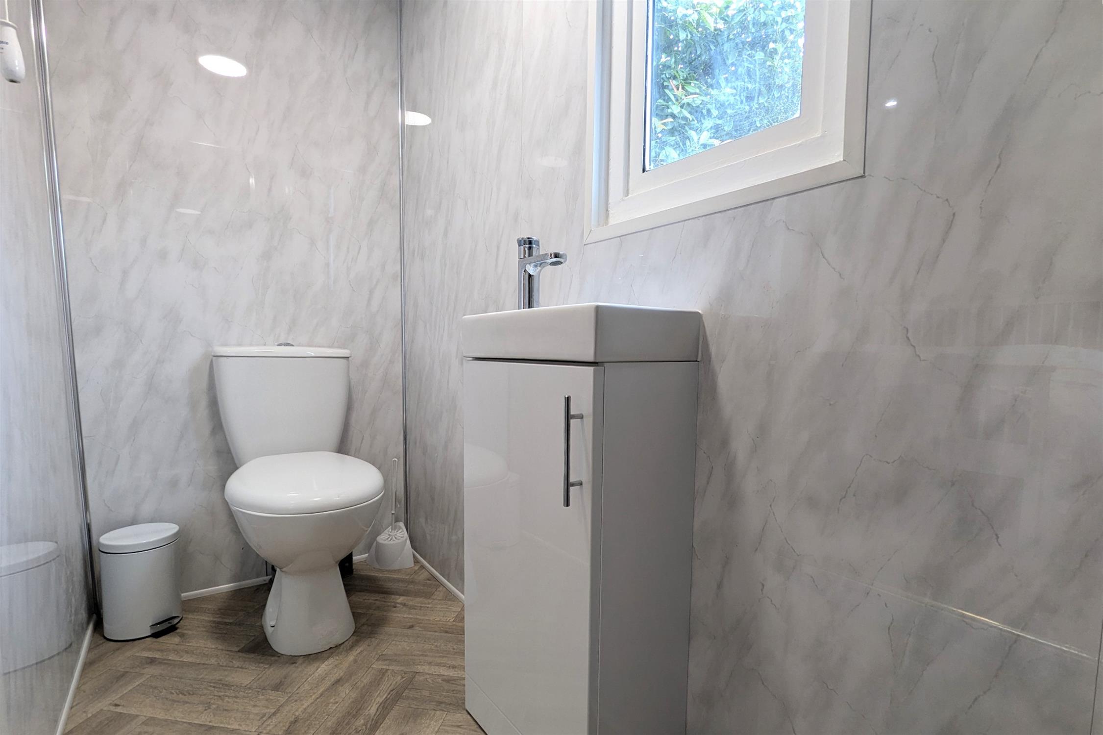 SHOWER ROOM: Modern white suite comprising WC, wash hand basin with vanity unit and shower cubicle.