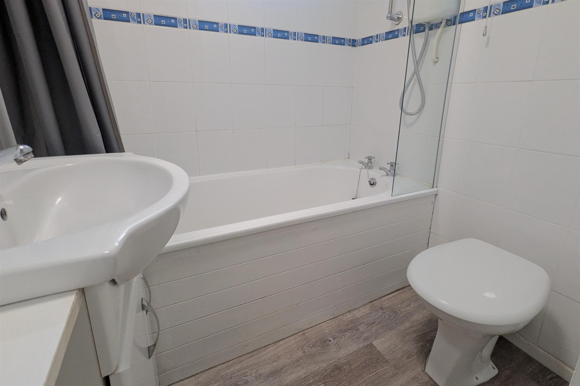 BATHROOM: White suite comprising; WC, wash hand basin and bath with shower over.