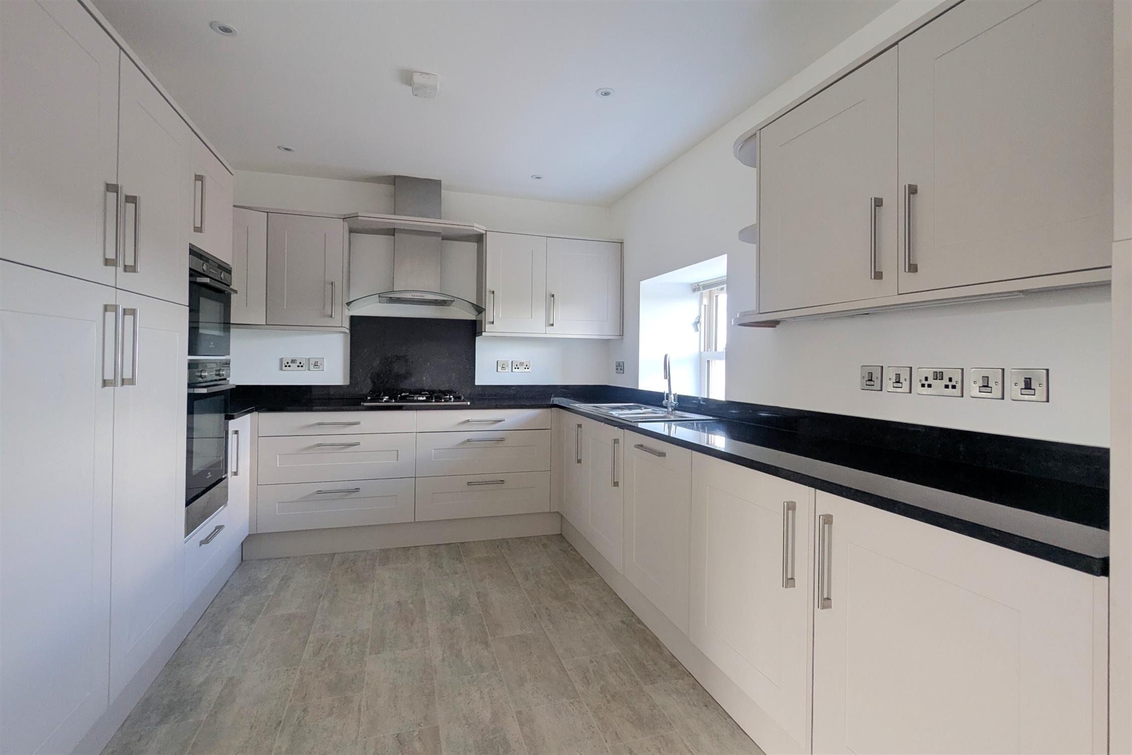 KITCHEN: Modern fitted high and low level units, five ring gas hob, oven, integral fridge/freezer, washing machine, tumble dryer and dishwasher.