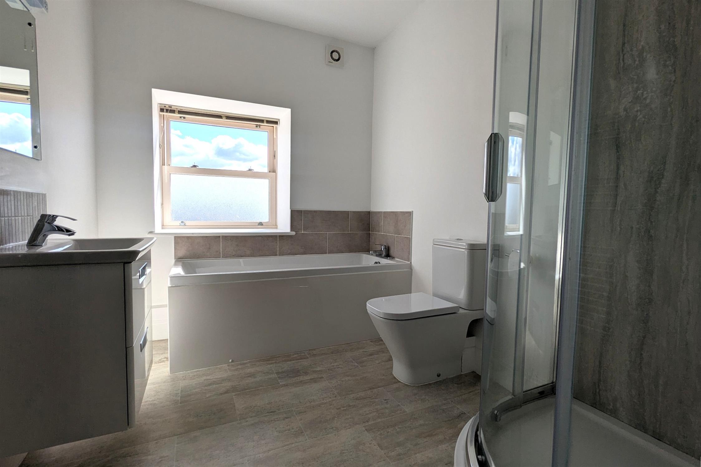 BATHROOM: Modern white WC, wash hand basin, bath, separate shower cubicle and heated towel rail.