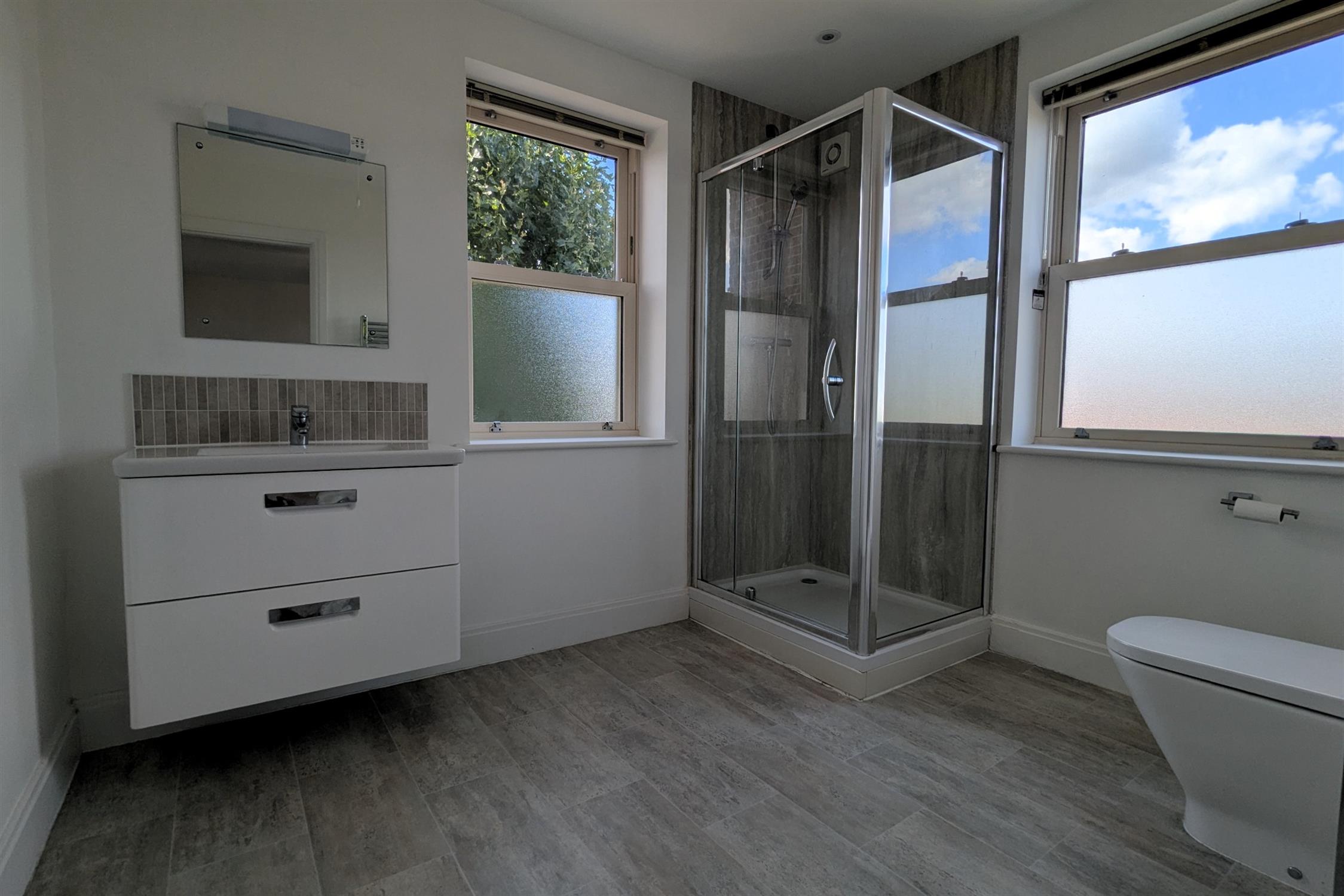 EN-SUITE: Contemporary white WC, wash hand basin, shower cubicle and heated towel rail.