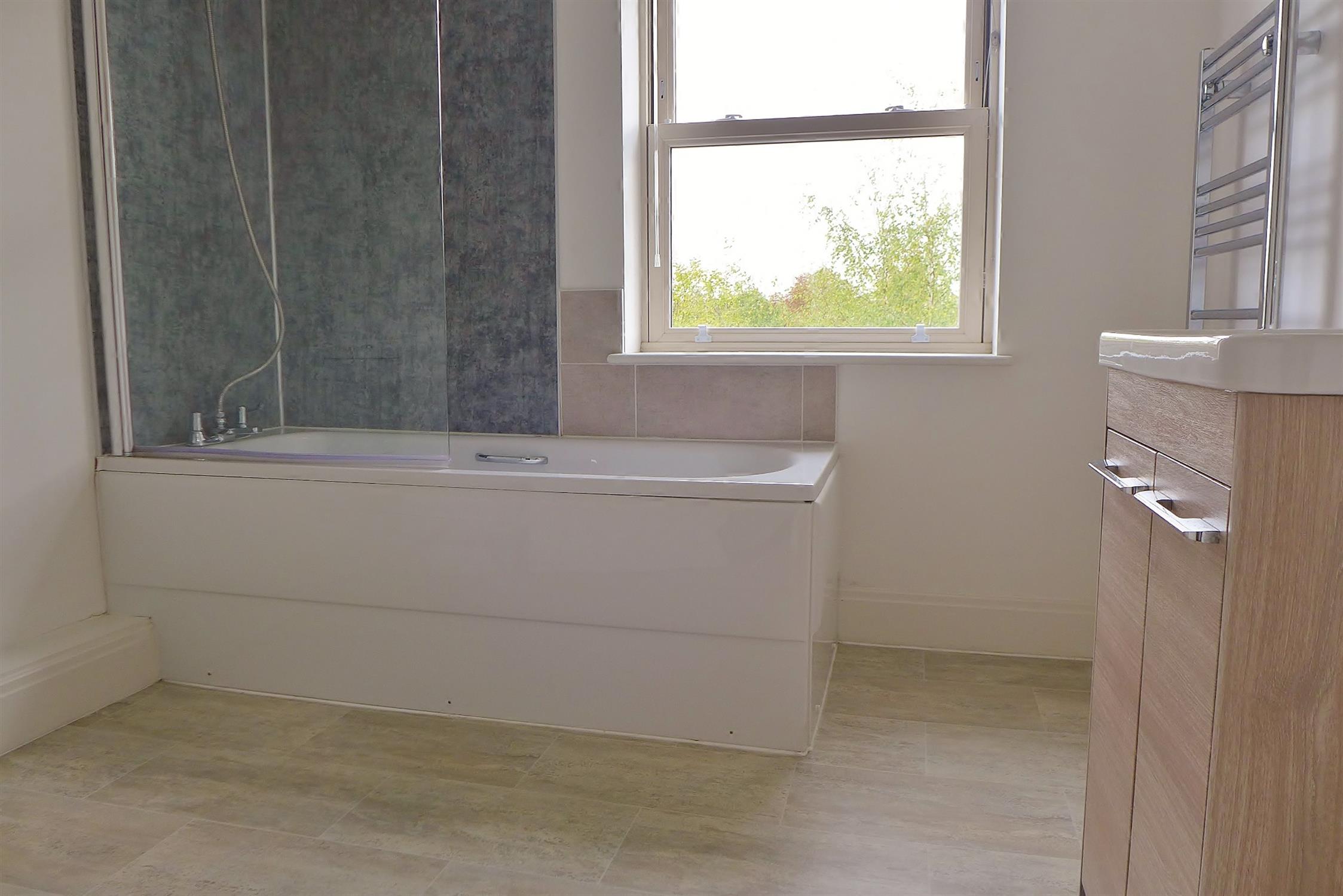 BATHROOM: Contemporary white bathroom suite with WC, wash hand basin, bath and heated towel rail.