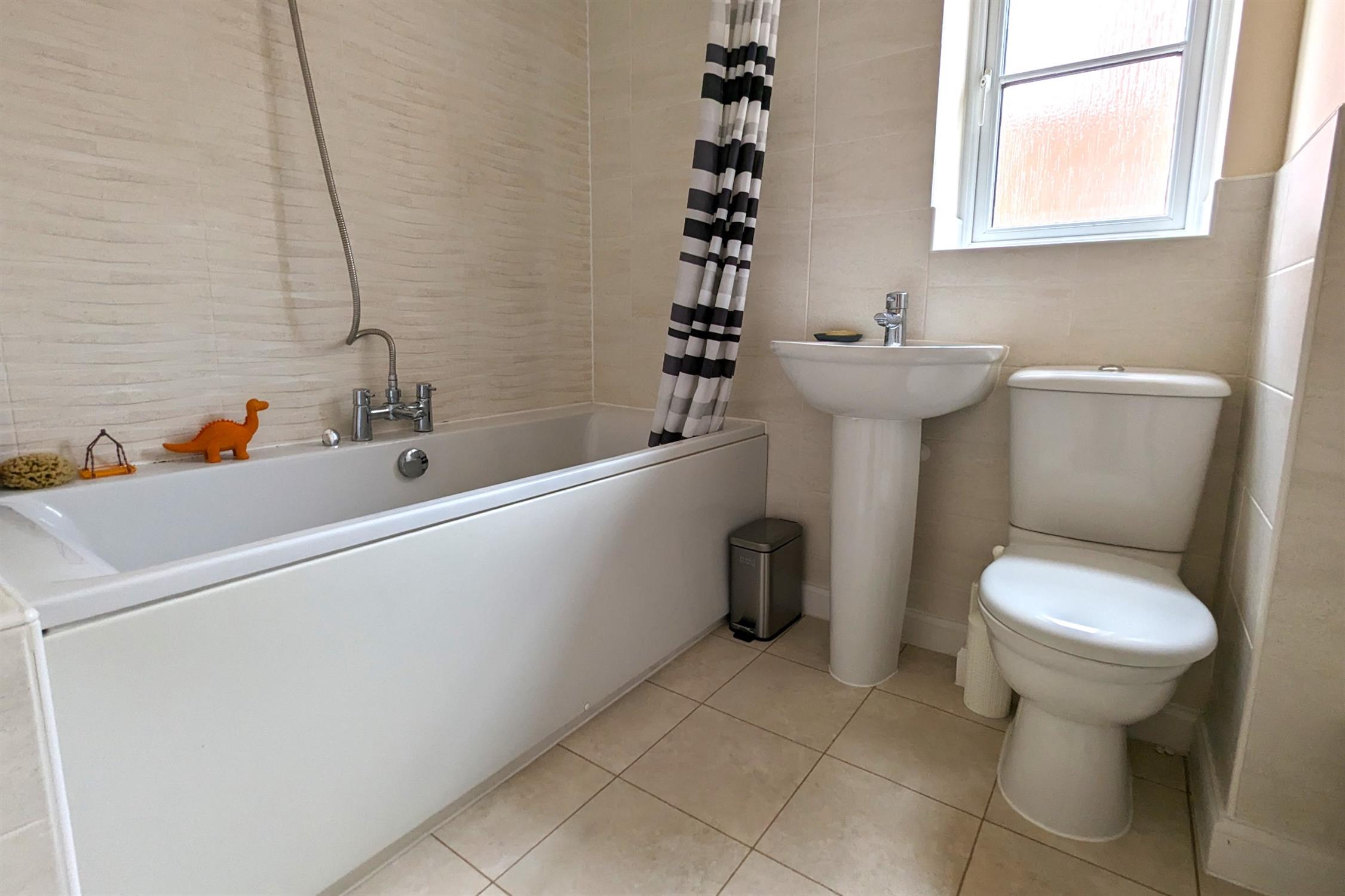 FAMILY BATHROOM: Modern white WC, wash hand basin and bath with shower over.